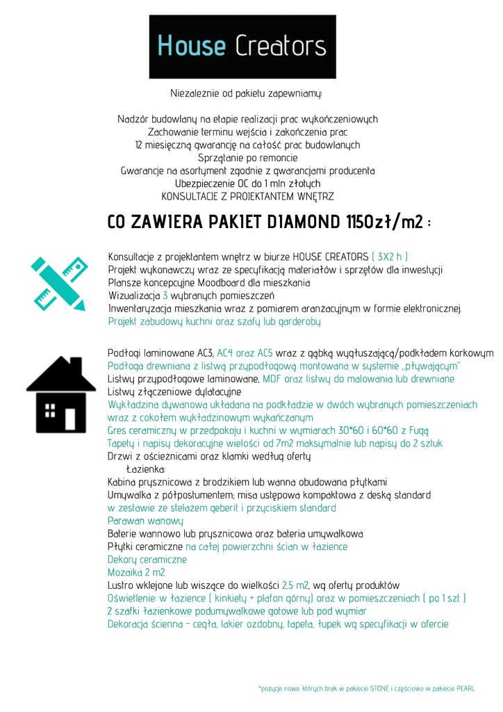 Ni e z a l e ż n i eo dp a k i e t uz a p e wn i a my : Na d z ó rb u d o wl a n yn ae t a p i er e a l i z a c j ip r a cwy k o ń c z e n i o wy c h Za c h o wa n i et e r mi n uwe j ś c i aiz a k o ń c z e n i ap r a c 1 2mi e s i ę c z n ąg wa r a n c j ęn ac a ł o ś ćp r a cb u d o wl a n y c h Sp r z ą t a n i ep or e mo n c i e Gwa r a n c j en aa s o r t y me n tz g o d n i ezg wa r a n c j a mip r o d u c e n t a Ub e z p i e c z e n i eOCd o1 ml nz ł o t y c h K ONSUL T AC J EZPROJ E K T ANT E MWNĘ T RZ C OZAWI E RAPAKI E TDI AMOND1 1 5 0z ł / m2: K o n s u l t a c j ezp r o j e k t a n t e mwn ę t r zwb i u r z eHOUSEC RE AT ORS(3 X2h) Pr o j e k twy k o n a wc z ywr a zz es p e c y f i k a c j ąma t e r i a ł ó wis p r z ę t ó wd l ai n we s t y c j i Pl a n s z ek o n c e p c y j n eMo o d b o a r dd l ami e s z k a n i a Wi z u a l i z a c j a3wy b r a n y c hp o mi e s z c z e ń I n we n t a r y z a c j ami e s z k a n i awr a zzp o mi a r e ma r a n ż a c y j n y mwf o r mi ee l e k t r o n i c z n e j . Pr o j e k tz a b u d o wyk u c h n io r a zs z a f yl u bg a r d e r o b y Po d ł o g il a mi n o wa n eAC 3 , AC 4o r a zAC 5wr a zzg ą b k ąwy g ł u s z a j ą c ą / p o d k ł a d e mk o r k o wy m Po d ł o g ad r e wn i a n azl i s t wąp r z y p o d ł o g o wąmo n t o wa n aws y s t e mi e„ p ł y wa j ą c y m” L i s t wyp r z y p o d ł o g o wel a mi n o wa n e , MDFo r a zl i s t wyd oma l o wa n i al u bd r e wn i a n e L i s t wyz ł ą c z e n i o wed y l a t a c y j n e Wy k ł a d z i n ad y wa n o wau k ł a d a n an ap o d k ł a d z i ewd wó c hwy b r a n y c hp o mi e s z c z e n i a c h wr a zzc o k o ł e mwy k ł a d z i n o wy mwy k a ń c z a n y m Gr e sc e r a mi c z n ywp r z e d p o k o j uik u c h n iwwy mi a r a c h3 0* 6 0i6 0* 6 0zF u g ą T a p e t yin a p i s yd e k o r a c y j n ewi e l o ś c io d7 m2ma k s y ma l n i el u bn a p i s yd o2s z t u k Dr z wizo ś c i e ż n i c a mio r a zk l a mk iwe d ł u go f e r t y Ła z i e n k a : K a b i n ap r y s z n i c o wazb r o d z i k i e ml u bwa n n ao b u d o wa n ap ł y t k a mi Umy wa l k azp ó ł p o s t u me n t e m; mi s au s t ę p o wak o mp a k t o wazd e s k ąs t a n d a r d wz e s t a wi ez es t e l a ż e mg e b e r i tip r z y c i s k i e ms t a n d a r d Pa r a wa nwa n o wy Ba t e r i ewa n n o wol u bp r y s z n i c o wao r a zb a t e r i au my wa l k o wa Pł y t k ic e r a mi c z n en ac a ł e j p o wi e r z c h n iś c i a nwł a z i e n c e De k o r yc e r a mi c z n e Mo z a i k a2m2 L u s t r owk l e j o n el u bwi s z ą c ed owi e l k o ś c i2 , 5m2 , wgo f e r t yp r o d u k t ó w Oś wi e t l e n i e : wł a z i e n c e(k i n k i e t y+p l a f o ng ó r n y )o r a zwp o mi e s z c z e n i a c h(p o1 s z t) 2s z a f k ił a z i e n k o wep o d u my wa l k o weg o t o wel u bp o dwy mi a r De k o r a c j aś c i e n n a-c e g ł a , l a k i e ro z d o b n y , t a p e t a , ł u p e kwgs p e c y f i k a c j iwo f e r c i e * p o z y c j eno we , k t ó r y c hb r a kwp a k i e c i eST ONEic z ę ś c i o wowp a k i e c i ePE ARL Sz c z e g ó ł o wyz a k r e sp r a cz a wa r t yc hwp a k i e c i eDI AMOND: 1 . Za be zpi e c ze ni eok i e n, dr zwiig r ze j ni k ów pr ze dma l owa ni e m 2 .Szpa c hl owa ni e śc i a nis u f i t ów. 3 .Gr u nt owa ni ews zys t k i c hśc i a nis u f i t ów. 4 Dwu k r ot nema l owa ni eśc i a nis u f i t ów f a r ba minabi a ł o/ k ol or 5 Szpa c hl owa ni eiwyr ówna ni e powi e r zc hniśc i a npowyże ju ł oże ni apł yt e k or a zdwu k r ot nema l owa ni ew ł a zi e nc e . 6 Ak r yl owa ni eośc i e żydr zwi owyc hiok i e nyc h 7 De mont a żiponownymont a żos pr zę t ue l e k t r yc zne g o 8 Uk ł a da ni epodł og iw s ys t e mi epł ywa j ąc ym ( podł og apł ywa j ąc awgof e r t y) 9. Uoże ni epł yt e kpodł og owyc h w pr ze dpok oj u(do3m2) 1 0 Moc owa ni el i s t wypr zypodł og owe j ws ys t e mi ec l i c kl u bnak l e j 1 1Wyk ona ni el i s t e wł ąc ze ni owyc hpodł óg 1 2 Uk ł a da ni epł yt e kśc i e nnyc h( g l a zu r y)w ł a zi e nc edos u f i t u 1 3 Uk ł a da ni ede k or ów śc i e nnyc hwgof e r t y 1 4Wyk ona ni er e wi zj iw za bu dowi ewa nnyzk a f l i 1 5 .Gr u nt owa ni epodł ożaiu k ł a da ni epł yt e kpodł og owyc ht e r a k ot a / g r e s 1 6.F u g owa ni e 1 7I zol owa ni epł ynnąi zol a c j ąpowi e r zc hniśc i a nipodł og iw obr ę bi ewa nny i / l u bk a bi nypr ys zni c owe jw ł a zi e nc e 1 8Si l i k onowa ni ek r a wę dzis t yk uwa nnyi / l u bk a bi nyor a zu mywa l k izpł yt k a mi 1 9 Wyk ońc ze ni ena r ożni k ów popr ze zc i ę c i epł yt e kpodk ąt e m 45s t opnil u bza s t os owa ni e a l u mi ni owe jl i s t wyna r ożni k owe j . 2 0 Za bu dowawa nnyl u bbr odzi k a-obu dowaa k r yl owal u bpł yt k a mic e r a mi c znymi 2 1Mont a żu mywa l k izpół nog ąl u bpos t u me nt e m wr a zzmont a że m ba t e r i iu mywa l k owe j 2 2 Mont a żWCk ompa k t ul u bs t e l a żg e be r i twr a zzpr zyc i s k i e m 2 3 Podł ąc ze ni es yf onów –u mywa l k a , wa nnal u bbr odzi k 2 4Mont a żwa nnyl u bbr odzi k awr a zzk a bi nąna t r ys k ową 2 5 Mont a żba t e r i iu mywa l k owe jor a zwa nnowe jl u bna t r ys k owe j 2 6Mont a żza wor ów odc i na j ąc yc hdou mywa l k i , pr a l k i 2 7De mont a żimont a żg r ze j ni k ów 2 8Mont a żl u s t r ana du mywa l k ą( opowi e r zc hni2 , 5m2 ) 2 9Mont a żdr zwiwe wnę t r znyc hiośc i e żni cwr a zzl i s t wa mima s k u j ąc ymior a zk l a mk a mi 3 0Mont a żoświ e t l e ni aza wa r t e g ow pa k i e c i e 3 1T r a ns por tma t e r i a ł ów or a zwnos ze ni edol ok a l u 3 2Obs ł u g al og i s t yc znaor a zs pr ząt a ni epoza k ońc ze ni upr a c 3 3Spr ząt a ni emi e s zk a ni apoza k ońc ze ni upr a c Ws zys t k owc e ni e1 1 5 0zł / m2 * p o z y c j eno we , k t ó r y c hb r a kwp a k i e c i eST ONEic z ę ś c i o wowp a k i