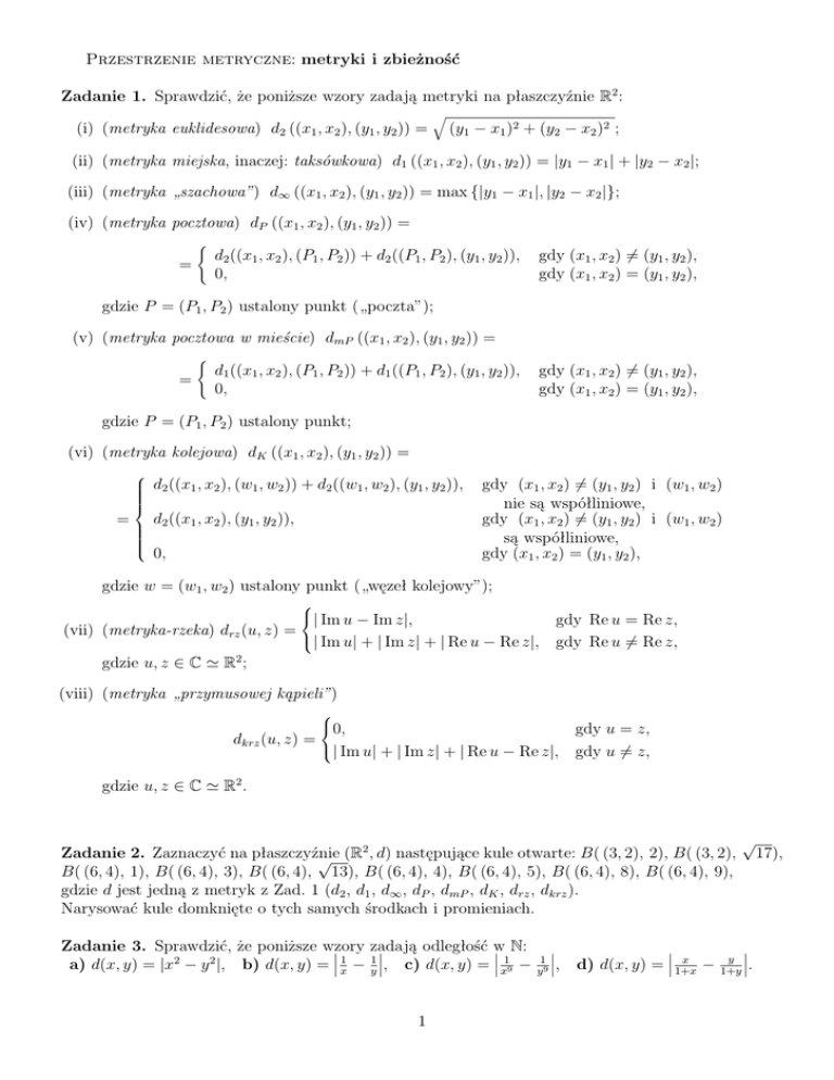 Zadanie 1. Sprawdzić, że poniższe wzory zadają metryki na płaszczyźnie R2 :