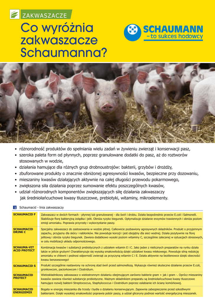 ZAKWASZACZE Co wyróżnia zakwaszacze Schaumanna? • • • • • • • • różnorodność produktów do spełniania wielu zadań w żywieniu zwierząt i konserwacji pasz, szeroka paleta form od płynnych, poprzez granulowane dodatki do pasz, aż do roztworów stosowanych w wodzie, działania hamujące dla różnych grup drobnoustrojów: bakterii, grzybów i drożdży, zbuforowane produkty o znacznie obniżonej agresywności kwasów, bezpieczne przy dozowaniu, mieszaniny kwasów działających aktywnie na całej długości przewodu pokarmowego, zwiększona siła działania poprzez sumowanie efektu poszczególnych kwasów, udział różnorodnych komponentów zwiększających siłę działania zakwaszaczy jak średniołańcuchowe kwasy tłuszczowe, prebiotyki, witaminy, mikroelementy. 1 Schaumacid - linia zakwaszaczy SCHAUMACID F Zakwaszacz w dwóch formach - płynnej lub granulowanej - dla świń i drobiu. Działa bezpośrednio przeciw E.coli i Salmonelli. Stabilizuje florę bakteryjną żołądka i jelit. Obniża ryzyko biegunek. Optymalizuje działanie enzymów trawiennych i obniża poziom emisji amoniaku. Poprawia przyrosty i wykorzystanie paszy. SCHAUMACID DRINK C Specjalny zakwaszacz do zastosowania w wodzie pitnej. Całkowicie pozbawiony agresywnych składników. Produkt o przyjemnym zapachu, przyjazny dla skóry i nabłonków. Nie powoduje korozji i jest obojętny dla sieci wodnej. Działa pozytywnie na florę jelitową i obniża ryzyko biegunek. Zawiera dodatkowo wysoki poziom witaminy C, szczególnie zalecanej w sytuacjach stresowych, w celu mobilizacji układu odpornościowego. SCHAUMA-VIT ACID PROTECT Kombinacja kwasów i substancji prebiotycznych z udziałem witamin E i C. Jako jeden z nielicznych preparatów na rynku działa także w jelicie grubym! Charakteryzuje się wysoką smakowitością dzięki udziałowi kwasu mlekowego. Powoduje silną redukcję amoniaku w chlewni i podnosi odporność zwierząt za przyczyną witamin C i E. Działa aktywnie na beztlenowce dzięki obecności kwasu benzoesowego! SCHAUMACID S Produkt szczególnie nastawiony na ochronę stad świń przed salmonellozą. Wykazuje również skuteczne działanie przeciw E.coli, gronkowcom, paciorkowcom i Clostridium. SCHAUMACID PROTECT Wieloskładnikowy zakwaszacz o wielostronnym działaniu obejmującym zarówno bakterie gram + jak i gram -. Oprócz mieszaniny kwasów zawiera również substancje probiotyczne. Ważnym składnikiem preparatu są średniołańcuchowe kwasy tłuszczowe hamujące rozwój bakterii Streptococcus, Staphylococcus i Clostridium poprzez osłabianie ich ściany komórkowej. SCHAUMACID ENERGIEMIX Bogata w energię mieszanka dla trzody i bydła o działaniu konserwującym. Zapewnia zabezpieczenie przed szkodliwymi bakteriami. Dzięki wysokiej smakowitości poprawia pobór paszy, a udział gliceryny podnosi wartość energetyczną mieszanek. SCHAUMACID S SCHAUMACID PROTECT FLÜSSIG kwas mrówkowy kwas propionowy kwas mlekowy MCFA gliceryna kwas mrówkowy kwas propionowy kwas mlekowy kwas cytrynowy średniołańcuchowe kwasy tłuszczowe przyjazny w użyciu i bezpieczny dla urządzeń, wyjątkowo skuteczny przeciw bakteriom Salmonella udział MCFA, hamuje wzrost bakterii gram+ oraz Clostridum, Streptococcus i Staphylococcus SCHAUMANCID DRINK C Mieszanka paszowa uzupełniająca, nie stwarza zagrożenia Schaumann Polska Sp. z o.o., ul. Chrobrego 14, 62-200 Gniezno, tel. +48/61/424-52-05, www.schaumann.pl