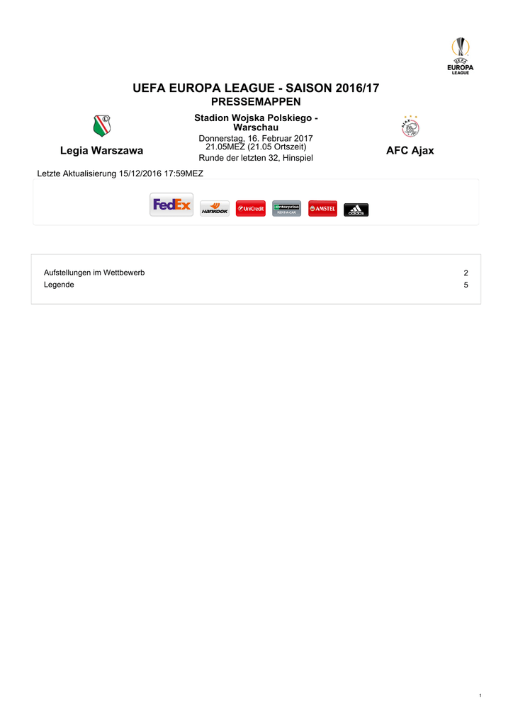 UEFA EUROPA LEAGUE - SAISON 2016/17 PRESSEMAPPEN Stadion Wojska Polskiego Warschau Legia Warszawa Donnerstag, 16. Februar 2017 21.05MEZ (21.05 Ortszeit) Runde der letzten 32, Hinspiel AFC Ajax Letzte Aktualisierung 15/12/2016 17:59MEZ Aufstellungen im Wettbewerb 2 Legende 5 1 Legia Warszawa - AFC Ajax Donnerstag 16 Februar 2017 - 21.05CET (21.05 Ortszeit) Pressemappe Stadion Wojska Polskiego, Warschau Aufstellungen im Wettbewerb Legia Warszawa UEFA Champions League - Zweite Qualifikationsrunde (12/07/2016) HŠK Zrinjski 1-1 Legia Warszawa Tore: 0-1 Nikolić 49, 1-1 Katanec 57 Legia Warszawa: Malarz (46 Cierzniak), Jodłowiec, Lewczuk, Guilherme, Duda (60 Alexandrov), Nikolić (76 Prijovic), Hloušek, Kucharczyk, Rzeźniczak, Broź, Moulin (19/07/2016) Legia Warszawa 2-0 HŠK Zrinjski (ges: 3-1) Tore: 1-0 Nikolić 28 (E) , 2-0 Nikolić 62 Legia Warszawa: Malarz, Pazdan, Jodłowiec, Lewczuk, Guilherme (15 Hämäläinen), Nikolić (75 Kopczyński), Hloušek, Kucharczyk (84 Brzyski), Broź, Moulin, Alexandrov Dritte Qualifikationsrunde (27/07/2016) FK AS Trenčín 0-1 Legia Warszawa Tore: 0-1 Nikolić 69 Legia Warszawa: Malarz, Pazdan, Jodłowiec (85 Hämäläinen), Lewczuk, Nikolić (75 Prijovic), Kopczyński, Brzyski, Kucharczyk, Bereszyński, Moulin, Alexandrov (89 Broź) (03/08/2016) Legia Warszawa 0-0 FK AS Trenčín (ges: 1-0) Legia Warszawa: Malarz, Pazdan, Jodłowiec, Lewczuk, Langil (69 Alexandrov), Nikolić (78 Prijovic), Hloušek, Kopczyński, Kucharczyk, Bereszyński (56 Broź), Moulin Play-offs (17/08/2016) Dundalk FC 0-2 Legia Warszawa Tore: 0-1 Nikolić 56 (E) , 0-2 Prijovic 90+4 Legia Warszawa: Malarz, Pazdan, Jodłowiec, Lewczuk, Langil (88 Alexandrov), Odjidja (76 Kopczyński), Nikolić (83 Prijovic), Hloušek, Kucharczyk, Broź, Moulin (23/08/2016) Legia Warszawa 1-1 Dundalk FC (ges: 3-1) Tore: 0-1 Benson 19, 1-1 Kucharczyk 90+2 Legia Warszawa: Malarz, Pazdan, Jodłowiec, Lewczuk, Langil (65 Guilherme), Odjidja, Nikolić (71 Bereszyński), Hloušek, Kucharczyk, Broź, Moulin (93 Prijovic) Gruppenphase Gruppe F Verein Sp. S U N ET KT Pkt. Borussia Dortmund 6 4 2 0 21 9 14 Real Madrid CF 6 3 3 0 16 10 12 Legia Warszawa 6 1 1 4 9 24 4 Sporting Clube de Portugal 6 1 0 5 5 8 3 Spieltag 1 (14/09/2016) Legia Warszawa 0-6 Borussia Dortmund Tore: 0-1 Götze 7, 0-2 Papastathopoulos 15, 0-3 Bartra 17, 0-4 Raphaël Guerreiro 51, 0-5 Castro 76, 0-6 Aubameyang 87 Legia Warszawa: Malarz, Jodłowiec, Czerwiński, Dąbrowski, Guilherme, Langil, Odjidja, Kazaishvili (66 Alexandrov), Bereszyński, Moulin (76 Radović), Prijovic (63 Nikolić) 2 Legia Warszawa - AFC Ajax Pressemappe Donnerstag 16 Februar 2017 - 21.05CET (21.05 Ortszeit) Stadion Wojska Polskiego, Warschau Spieltag 2 (27/09/2016) Sporting Clube de Portugal 2-0 Legia Warszawa Tore: 1-0 Ruiz 28, 2-0 Dost 37 Legia Warszawa: Malarz, Jodłowiec, Czerwiński, Guilherme, Langil (46 Alexandrov), Nikolić (60 Odjidja), Hloušek, Bereszyński, Rzeźniczak, Radović, Moulin (86 Kopczyński) Spieltag 3 (18/10/2016) Real Madrid CF 5-1 Legia Warszawa Tore: 1-0 Bale 16, 2-0 Jodłowiec 20 (ET) , 2-1 Radović 22 (E) , 3-1 Asensio 37, 4-1 Lucas Vázquez 68, 5-1 Morata 84 Legia Warszawa: Malarz, Jodłowiec, Czerwiński, Guilherme (74 Kazaishvili), Odjidja, Hloušek, Kucharczyk, Bereszyński, Rzeźniczak, Radović (74 Nikolić), Moulin (81 Kopczyński) Spieltag 4 (02/11/2016) Legia Warszawa 3-3 Real Madrid CF Tore: 0-1 Bale 1, 0-2 Benzema 35, 1-2 Odjidja 40, 2-2 Radović 58, 3-2 Moulin 83, 3-3 Kovačić 85 Legia Warszawa: Malarz, Pazdan, Guilherme, Odjidja (86 Jodłowiec), Nikolić (69 Kucharczyk), Hloušek, Kopczyński, Bereszyński, Rzeźniczak, Radović (77 Prijovic), Moulin Spieltag 5 (22/11/2016) Borussia Dortmund 8-4 Legia Warszawa Tore: 0-1 Prijovic 10, 1-1 Kagawa 17, 2-1 Kagawa 18, 3-1 Nuri Şahin 20, 3-2 Prijovic 24, 4-2 Dembélé 29, 5-2 Reus 32, 6-2 Reus 52, 6-3 Kucharczyk 57, 7-3 Passlack 81, 7-4 Nikolić 83, 8-4 Rzeźniczak 90+2 (ET) Legia Warszawa: Cierzniak, Pazdan, Czerwiński, Guilherme (55 Jodłowiec), Odjidja (75 Nikolić), Kopczyński, Kucharczyk, Bereszyński, Rzeźniczak, Radović, Prijovic (69 Wieteska) Spieltag 6 (07/12/2016) Legia Warszawa 1-0 Sporting Clube de Portugal Tore: 1-0 Guilherme 30 Legia Warszawa: Malarz, Pazdan, Guilherme (62 Kucharczyk), Odjidja, Hloušek, Kopczyński, Bereszyński, Rzeźniczak, Radović (94 Dąbrowski), Moulin, Prijovic (86 Hämäläinen) UEFA Europa League - Runde der letzten 32 Spieltag 7 (16/02/2017) Legia Warszawa-AFC Ajax Spieltag 8 (23/02/2017) AFC Ajax-Legia Warszawa AFC Ajax UEFA Champions League - Dritte Qualifikationsrunde (26/07/2016) AFC Ajax 1-1 PAOK FC Tore: 0-1 Djalma Campos 27, 1-1 Dolberg 58 AFC Ajax: Cillessen, Tete, Veltman, Riedewald, El Ghazi (88 Černý), Klaassen, Cassierra (58 Younes), Dolberg, Viergever, Van de Beek (77 Schöne), Dijks (03/08/2016) PAOK FC 1-2 AFC Ajax (ges: 2-3) Tore: 1-0 Athanasiadis 4, 1-1 Klaassen 45+1 (E) , 1-2 Klaassen 88 AFC Ajax: Cillessen, Tete, Veltman, Riedewald, Klaassen, Westermann, Cassierra, Dolberg (63 El Ghazi), Viergever, Gudelj, Dijks Play-offs (16/08/2016) AFC Ajax 1-1 FC Rostov Tore: 0-1 Noboa 13, 1-1 Klaassen 38 (E) AFC Ajax: Cillessen, Veltman, Riedewald, Sanchez, Bazoer, El Ghazi, Traoré (82 Dolberg), Klaassen, Younes (68 Cassierra), Gudelj, Dijks (24/08/2016) FC Rostov 4-1 AFC Ajax (ges: 5-2) 3 Legia Warszawa - AFC Ajax Donnerstag 16 Februar 2017 - 21.05CET (21.05 Ortszeit) Pressemappe Stadion Wojska Polskiego, Warschau Tore: 1-0 Azmoun 34, 2-0 Erokhin 52, 3-0 Noboa 60, 4-0 Poloz 66, 4-1 Klaassen 84 (E) AFC Ajax: Cillessen, Tete, Veltman, Riedewald, Bazoer (58 Dolberg), El Ghazi (46 Schöne), Traoré, Klaassen, Younes (77 Cassierra), Viergever, Gudelj UEFA Europa League - Gruppenphase Gruppe G Verein Sp. S U N ET KT Pkt. AFC Ajax 6 4 2 0 11 6 14 RC Celta de Vigo 6 2 3 1 10 7 9 R. Standard de Liège 6 1 4 1 8 6 7 Panathinaikos FC 6 0 1 5 3 13 1 Spieltag 1 (15/09/2016) Panathinaikos FC 1-2 AFC Ajax Tore: 1-0 Berg 5, 1-1 Traoré 