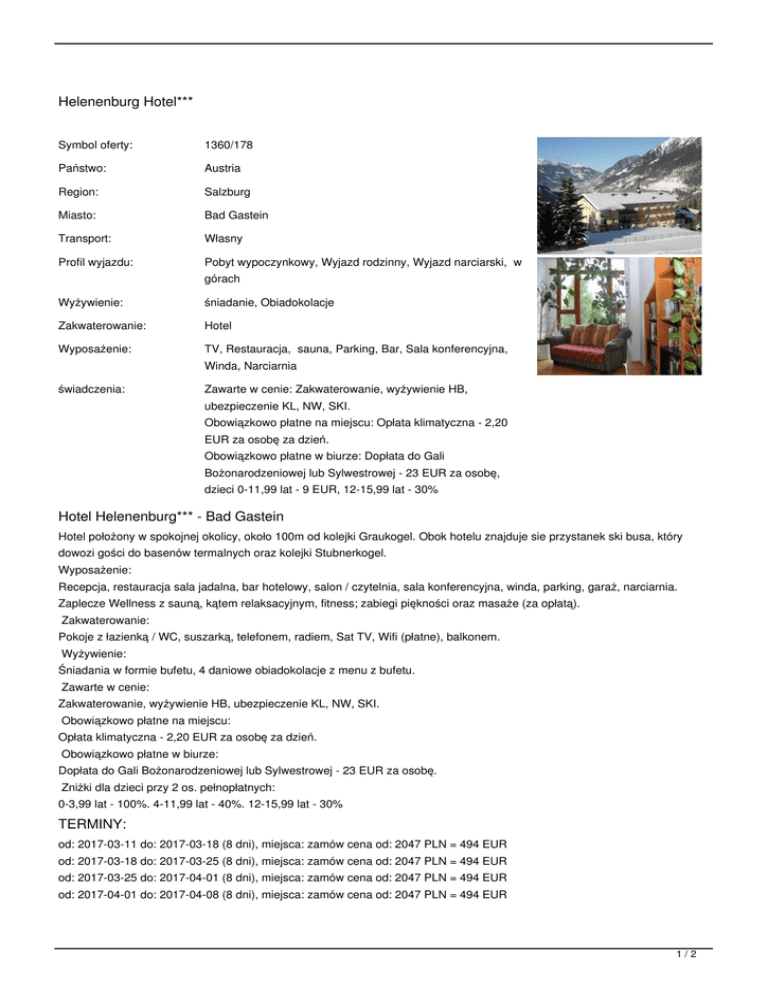 Helenenburg Hotel*** Symbol oferty: 1360/178 Państwo: Austria Region: Salzburg Miasto: Bad Gastein Transport: Własny Profil wyjazdu: Pobyt wypoczynkowy, Wyjazd rodzinny, Wyjazd narciarski, w Wyżywienie: śniadanie, Obiadokolacje Zakwaterowanie: Hotel Wyposażenie: TV, Restauracja, sauna, Parking, Bar, Sala konferencyjna, świadczenia: Zawarte w cenie: Zakwaterowanie, wyżywienie HB, górach Winda, Narciarnia ubezpieczenie KL, NW, SKI. Obowiązkowo płatne na miejscu: Opłata klimatyczna - 2,20 EUR za osobę za dzień. Obowiązkowo płatne w biurze: Dopłata do Gali Bożonarodzeniowej lub Sylwestrowej - 23 EUR za osobę, dzieci 0-11,99 lat - 9 EUR, 12-15,99 lat - 30% Hotel Helenenburg*** - Bad Gastein Hotel położony w spokojnej okolicy, około 100m od kolejki Graukogel. Obok hotelu znajduje sie przystanek ski busa, który dowozi gości do basenów termalnych oraz kolejki Stubnerkogel. Wyposażenie: Recepcja, restauracja sala jadalna, bar hotelowy, salon / czytelnia, sala konferencyjna, winda, parking, garaż, narciarnia. Zaplecze Wellness z sauną, kątem relaksacyjnym, fitness; zabiegi piękności oraz masaże (za opłatą). Zakwaterowanie: Pokoje z łazienką / WC, suszarką, telefonem, radiem, Sat TV, Wifi (płatne), balkonem. Wyżywienie: Śniadania w formie bufetu, 4 daniowe obiadokolacje z menu z bufetu. Zawarte w cenie: Zakwaterowanie, wyżywienie HB, ubezpieczenie KL, NW, SKI. Obowiązkowo płatne na miejscu: Opłata klimatyczna - 2,20 EUR za osobę za dzień. Obowiązkowo płatne w biurze: Dopłata do Gali Bożonarodzeniowej lub Sylwestrowej - 23 EUR za osobę. Zniżki dla dzieci przy 2 os. pełnopłatnych: 0-3,99 lat - 100%. 4-11,99 lat - 40%. 12-15,99 lat - 30% TERMINY: od: 2017-03-11 do: 2017-03-18 (8 dni), miejsca: zamów cena od: 2047 PLN = 494 EUR od: 2017-03-18 do: 2017-03-25 (8 dni), miejsca: zamów cena od: 2047 PLN = 494 EUR od: 2017-03-25 do: 2017-04-01 (8 dni), miejsca: zamów cena od: 2047 PLN = 494 EUR od: 2017-04-01 do: 2017-04-08 (8 dni), miejsca: zamów cena od: 2047 PLN = 494 EUR 1/2 CENNIK: Długość pobytu: 8 dni Grupa cenowa: A1 Ubezpieczenie (obligatoryjne) (*) Ubezpieczenie KL, NW, SKI 14 (*) Turystyczny Fundusz Gwarancyjny Pobyt w obiekcie (do wyboru) 2.5 (*) Pokój 2 osobowy standardowo dla osób: 3 minimalnie: 2 Inne (opcjonalne) Dopłata do Bożego Narodzenia Rodzaj osoby (do wyboru) Dziecko 4-11 Dziecko 0-3 (*) Osoba dorosła Dziecko 12-15 Inne (opcjonalne) Dopłata do Sylwestra (-) (-) 288 (-) 480 336 (-) Waluta: EUR Aktualne ceny z systemu S.A.R.T. (-) - cena usługi, podatku kalkulowana przy osobie lub gratis (*) - kwota wliczona w cenę standardową 2/2
