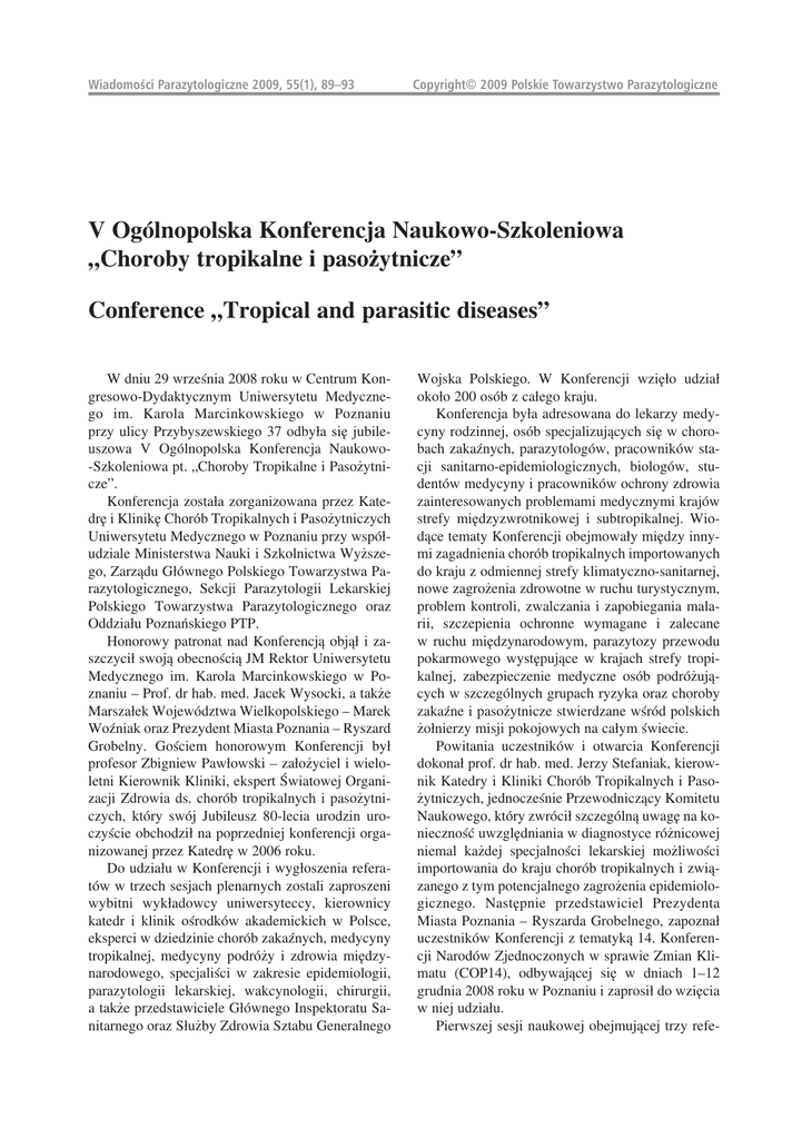 Wiadomoœci Parazytologiczne 2009, 55(1), 89–93 Copyright© 2009 Polskie Towarzystwo Parazytologiczne V Ogólnopolska Konferencja Naukowo-Szkoleniowa „Choroby tropikalne i pasożytnicze” Conference „Tropical and parasitic diseases” W dniu 29 września 2008 roku w Centrum Kongresowo-Dydaktycznym Uniwersytetu Medycznego im. Karola Marcinkowskiego w Poznaniu przy ulicy Przybyszewskiego 37 odbyła się jubileuszowa V Ogólnopolska Konferencja Naukowo-Szkoleniowa pt. „Choroby Tropikalne i Pasożytnicze”. Konferencja została zorganizowana przez Katedrę i Klinikę Chorób Tropikalnych i Pasożytniczych Uniwersytetu Medycznego w Poznaniu przy współudziale Ministerstwa Nauki i Szkolnictwa Wyższego, Zarządu Głównego Polskiego Towarzystwa Parazytologicznego, Sekcji Parazytologii Lekarskiej Polskiego Towarzystwa Parazytologicznego oraz Oddziału Poznańskiego PTP. Honorowy patronat nad Konferencją objął i zaszczycił swoją obecnością JM Rektor Uniwersytetu Medycznego im. Karola Marcinkowskiego w Poznaniu – Prof. dr hab. med. Jacek Wysocki, a także Marszałek Województwa Wielkopolskiego – Marek Woźniak oraz Prezydent Miasta Poznania – Ryszard Grobelny. Gościem honorowym Konferencji był profesor Zbigniew Pawłowski – założyciel i wieloletni Kierownik Kliniki, ekspert Światowej Organizacji Zdrowia ds. chorób tropikalnych i pasożytniczych, który swój Jubileusz 80-lecia urodzin uroczyście obchodził na poprzedniej konferencji organizowanej przez Katedrę w 2006 roku. Do udziału w Konferencji i wygłoszenia referatów w trzech sesjach plenarnych zostali zaproszeni wybitni wykładowcy uniwersyteccy, kierownicy katedr i klinik ośrodków akademickich w Polsce, eksperci w dziedzinie chorób zakaźnych, medycyny tropikalnej, medycyny podróży i zdrowia międzynarodowego, specjaliści w zakresie epidemiologii, parazytologii lekarskiej, wakcynologii, chirurgii, a także przedstawiciele Głównego Inspektoratu Sanitarnego oraz Służby Zdrowia Sztabu Generalnego Wojska Polskiego. W Konferencji wzięło udział około 200 osób z całego kraju. Konferencja była adresowana do lekarzy medycyny rodzinnej, osób specjalizujących się w chorobach zakaźnych, parazytologów, pracowników stacji sanitarno-epidemiologicznych, biologów, studentów medycyny i pracowników ochrony zdrowia zainteresowanych problemami medycznymi krajów strefy międzyzwrotnikowej i subtropikalnej. Wiodące tematy Konferencji obejmowały między innymi zagadnienia chorób tropikalnych importowanych do kraju z odmiennej strefy klimatyczno-sanitarnej, nowe zagrożenia zdrowotne w ruchu turystycznym, problem kontroli, zwalczania i zapobiegania malarii, szczepienia ochronne wymagane i zalecane w ruchu międzynarodowym, parazytozy przewodu pokarmowego występujące w krajach strefy tropikalnej, zabezpieczenie medyczne osób podróżujących w szczególnych grupach ryzyka oraz choroby zakaźne i pasożytnicze stwierdzane wśród polskich żołnierzy misji pokojowych na całym świecie. Powitania uczestników i otwarcia Konferencji dokonał prof. dr hab. med. Jerzy Stefaniak, kierownik Katedry i Kliniki Chorób Tropikalnych i Pasożytniczych, jednocześnie Przewodniczący Komitetu Naukowego, który zwrócił szczególną uwagę na konieczność uwzględniania w diagnostyce różnicowej niemal każdej specjalności lekarskiej możliwości importowania do kraju chorób tropikalnych i związanego z tym potencjalnego zagrożenia epidemiologicznego. Następnie przedstawiciel Prezydenta Miasta Poznania – Ryszarda Grobelnego, zapoznał uczestników Konferencji z tematyką 14. Konferencji Narodów Zjednoczonych w sprawie Zmian Klimatu (COP14), odbywającej się w dniach 1–12 grudnia 2008 roku w Poznaniu i zaprosił do wzięcia w niej udziału. Pierwszej sesji naukowej obejmującej trzy refe- 90 raty plenarne przewodniczyli profesorowie: Jacek Wysocki, Piotr Zaborowski (kierownik Kliniki Chorób Odzwierzęcych i Tropikalnych Warszawskiego Uniwersytetu Medycznego) oraz Jerzy Stefaniak. Profesor Z. Pawłowski w swoim wystąpieniu nt. „Parazytologii klinicznej, medycyny tropikalnej i zdrowia międzynarodowego” zwrócił uwagę, iż zmiany polityczne, ekonomiczne i socjalne zachodzące w szybko zmieniającym się świecie wymuszają również inne podejście do ochrony zdrowia, w tym także zdrowia międzynarodowego. Podkreślił, że medycyna tropikalna i problemy zdrowia międzynarodowego przez wiele lat były niedoceniane w naszym kraju i aby wyrównać dotychczasowe braki, należałoby wzmocnić istniejące ośrodki akademickie w Polsce zajmujące się tymi zagadnieniami, poszerzyć ich programy nauczania na przeddyplomowych studiach medycznych oraz zwiększyć liczbę specjalizacyjnych kursów podyplomowych, w tym także dla pracowników laboratoriów medycznych (rozpoznawanie malarii), biologów i epidemiologów. Profesor stwierdził, iż prowadzona w ośrodku poznańskim, szeroko zakrojona akcja „Stop malaria now” może służyć za przykład właściwej i koniecznej edukacji społecznej. Profesor J. Wysocki w swoim referacie pt. „Szczepienia wymagane i zalecane w ruchu międzynarodowym” zwrócił uwagę na istotną rolę szczepień ochronnych w profilaktyce chorób zakaźnych nabywanych w krajach odmiennej strefy klimatyczno-sanitarnej, w zależności od rejonu świata i warunków podróży tropikalnej. Podkreślił konieczność właściwego doboru szczepień profilaktycznych dla osób wyjeżdżających do wybranych obszarów strefy międzyzwrotnikowej i subtropikalnej, zgodnie z aktualnymi wytycznymi Światowej Organizacji Zdrowia i uwzględnieniem nowo pojawiających się zagrożeń zdrowotnych w ruchu turystycznym. Z kolei, z wystąpienia profesora J. Stefaniaka uczestnicy konferencji mogli dowiedzieć się, iż około 50 mln turystów rocznie podróżuje z krajów rozwiniętych do krajów strefy gorącej, spośród których aż 20–50% zapada na tzw. biegunkę podróżnych już w 