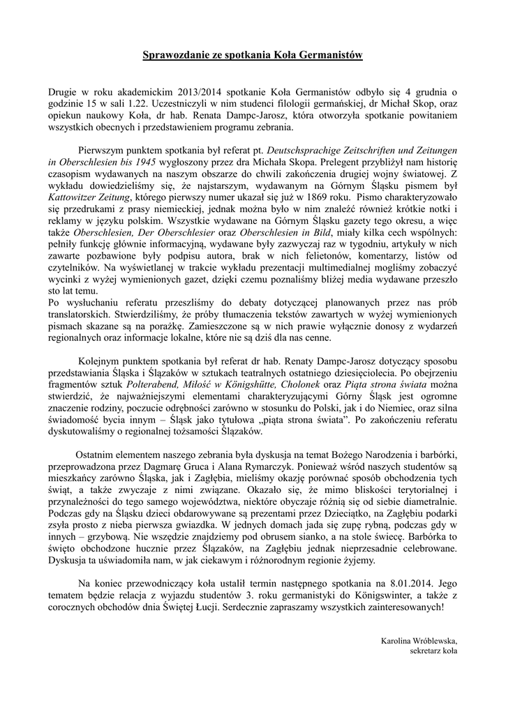 Sprawozdanie ze spotkania Koła Germanistów Drugie w roku akademickim 2013/2014 spotkanie Koła Germanistów odbyło się 4 grudnia o godzinie 15 w sali 1.22. Uczestniczyli w nim studenci filologii germańskiej, dr Michał Skop, oraz opiekun naukowy Koła, dr hab. Renata Dampc-Jarosz, która otworzyła spotkanie powitaniem wszystkich obecnych i przedstawieniem programu zebrania. Pierwszym punktem spotkania był referat pt. Deutschsprachige Zeitschriften und Zeitungen in Oberschlesien bis 1945 wygłoszony przez dra Michała Skopa. Prelegent przybliżył nam historię czasopism wydawanych na naszym obszarze do chwili zakończenia drugiej wojny światowej. Z wykładu dowiedzieliśmy się, że najstarszym, wydawanym na Górnym Śląsku pismem był Kattowitzer Zeitung, którego pierwszy numer ukazał się już w 1869 roku. Pismo charakteryzowało się przedrukami z prasy niemieckiej, jednak można było w nim znaleźć również krótkie notki i reklamy w języku polskim. Wszystkie wydawane na Górnym Śląsku gazety tego okresu, a więc także Oberschlesien, Der Oberschlesier oraz Oberschlesien in Bild, miały kilka cech wspólnych: pełniły funkcję głównie informacyjną, wydawane były zazwyczaj raz w tygodniu, artykuły w nich zawarte pozbawione były podpisu autora, brak w nich felietonów, komentarzy, listów od czytelników. Na wyświetlanej w trakcie wykładu prezentacji multimedialnej mogliśmy zobaczyć wycinki z wyżej wymienionych gazet, dzięki czemu poznaliśmy bliżej media wydawane przeszło sto lat temu. Po wysłuchaniu referatu przeszliśmy do debaty dotyczącej planowanych przez nas prób translatorskich. Stwierdziliśmy, że próby tłumaczenia tekstów zawartych w wyżej wymienionych pismach skazane są na porażkę. Zamieszczone są w nich prawie wyłącznie donosy z wydarzeń regionalnych oraz informacje lokalne, które nie są dziś dla nas cenne. Kolejnym punktem spotkania był referat dr hab. Renaty Dampc-Jarosz dotyczący sposobu przedstawiania Śląska i Ślązaków w sztukach teatralnych ostatniego dziesięciolecia. Po obejrzeniu fragmentów sztuk Polterabend, Miłość w Königshütte, Cholonek oraz Piąta strona świata można stwierdzić, że najważniejszymi elementami charakteryzującymi Górny Śląsk jest ogromne znaczenie rodziny, poczucie odrębności zarówno w stosunku do Polski, jak i do Niemiec, oraz silna świadomość bycia innym – Śląsk jako tytułowa „piąta strona świata”. Po zakończeniu referatu dyskutowaliśmy o regionalnej tożsamości Ślązaków. Ostatnim elementem naszego zebrania była dyskusja na temat Bożego Narodzenia i barbórki, przeprowadzona przez Dagmarę Gruca i Alana Rymarczyk. Ponieważ wśród naszych studentów są mieszkańcy zarówno Śląska, jak i Zagłębia, mieliśmy okazję porównać sposób obchodzenia tych świąt, a także zwyczaje z nimi związane. Okazało się, że mimo bliskości terytorialnej i przynależności do tego samego województwa, niektóre obyczaje różnią się od siebie diametralnie. Podczas gdy na Śląsku dzieci obdarowywane są prezentami przez Dzieciątko, na Zagłębiu podarki zsyła prosto z nieba pierwsza gwiazdka. W jednych domach jada się zupę rybną, podczas gdy w innych – grzybową. Nie wszędzie znajdziemy pod obrusem sianko, a na stole świecę. Barbórka to święto obchodzone hucznie przez Ślązaków, na Zagłębiu jednak nieprzesadnie celebrowane. Dyskusja ta uświadomiła nam, w jak ciekawym i różnorodnym regionie żyjemy. Na koniec przewodniczący koła ustalił termin następnego spotkania na 8.01.2014. Jego tematem będzie relacja z wyjazdu studentów 3. roku germanistyki do Königswinter, a także z corocznych obchodów dnia Świętej Łucji. Serdecznie zapraszamy wszystkich zainteresowanych! Karolina Wróblewska, sekretarz koła