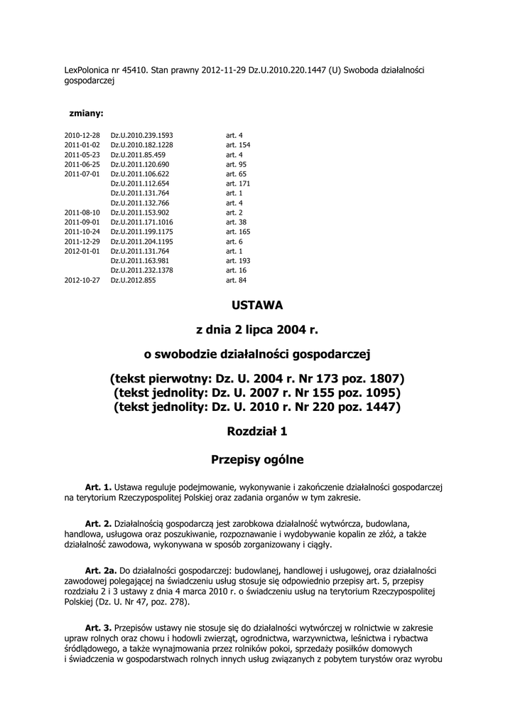 LexPolonica nr 45410. Stan prawny 2012-11-29 Dz.U.2010.220.1447 (U) Swoboda działalności gospodarczej zmiany: 2010-12-28 2011-01-02 2011-05-23 2011-06-25 2011-07-01 2011-08-10 2011-09-01 2011-10-24 2011-12-29 2012-01-01 2012-10-27 Dz.U.2010.239.1593 Dz.U.2010.182.1228 Dz.U.2011.85.459 Dz.U.2011.120.690 Dz.U.2011.106.622 Dz.U.2011.112.654 Dz.U.2011.131.764 Dz.U.2011.132.766 Dz.U.2011.153.902 Dz.U.2011.171.1016 Dz.U.2011.199.1175 Dz.U.2011.204.1195 Dz.U.2011.131.764 Dz.U.2011.163.981 Dz.U.2011.232.1378 Dz.U.2012.855 art. art. art. art. art. art. art. art. art. art. art. art. art. art. art. art. 4 154 4 95 65 171 1 4 2 38 165 6 1 193 16 84 USTAWA z dnia 2 lipca 2004 r. o swobodzie działalności gospodarczej (tekst pierwotny: Dz. U. 2004 r. Nr 173 poz. 1807) (tekst jednolity: Dz. U. 2007 r. Nr 155 poz. 1095) (tekst jednolity: Dz. U. 2010 r. Nr 220 poz. 1447) Rozdział 1 Przepisy ogólne Art. 1. Ustawa reguluje podejmowanie, wykonywanie i zakończenie działalności gospodarczej na terytorium Rzeczypospolitej Polskiej oraz zadania organów w tym zakresie. Art. 2. Działalnością gospodarczą jest zarobkowa działalność wytwórcza, budowlana, handlowa, usługowa oraz poszukiwanie, rozpoznawanie i wydobywanie kopalin ze złóż, a także działalność zawodowa, wykonywana w sposób zorganizowany i ciągły. Art. 2a. Do działalności gospodarczej: budowlanej, handlowej i usługowej, oraz działalności zawodowej polegającej na świadczeniu usług stosuje się odpowiednio przepisy art. 5, przepisy rozdziału 2 i 3 ustawy z dnia 4 marca 2010 r. o świadczeniu usług na terytorium Rzeczypospolitej Polskiej (Dz. U. Nr 47, poz. 278). Art. 3. Przepisów ustawy nie stosuje się do działalności wytwórczej w rolnictwie w zakresie upraw rolnych oraz chowu i hodowli zwierząt, ogrodnictwa, warzywnictwa, leśnictwa i rybactwa śródlądowego, a także wynajmowania przez rolników pokoi, sprzedaży posiłków domowych i świadczenia w gospodarstwach rolnych innych usług związanych z pobytem turystów oraz wyrobu wina przez producentów będących rolnikami wyrabiającymi mniej niż 100 hektolitrów wina w ciągu roku gospodarczego, o których mowa w art. 17 ust. 3 ustawy z dnia 12 maja 2011 r. o wyrobie i rozlewie wyrobów winiarskich, obrocie tymi wyrobami i organizacji rynku wina (Dz. U. Nr 120, poz. 690). Art. 4. 1. Przedsiębiorcą w rozumieniu ustawy jest osoba fizyczna, osoba prawna i jednostka organizacyjna niebędąca osobą prawną, której odrębna ustawa przyznaje zdolność prawną wykonująca we własnym imieniu działalność gospodarczą. 2. Za przedsiębiorców uznaje się także wspólników spółki cywilnej w zakresie wykonywanej przez nich działalności gospodarczej. Art. 5. Użyte w ustawie określenia oznaczają: 1) organ koncesyjny - organ administracji publicznej upoważniony na podstawie ustawy do udzielania, odmowy udzielania, zmiany i cofania koncesji; 2) osoba zagraniczna: a) osobę fizyczną nieposiadającą obywatelstwa polskiego, b) osobę prawną z siedzibą za granicą, c) jednostkę organizacyjną niebędącą osobą prawną posiadającą zdolność prawną, z siedzibą za granicą; 3) przedsiębiorca zagraniczny - osobę zagraniczną wykonującą działalność gospodarczą za granicą oraz obywatela polskiego wykonującego działalność gospodarczą za granicą; 4) oddział - wyodrębnioną i samodzielną organizacyjnie część działalności gospodarczej, wykonywaną przez przedsiębiorcę poza siedzibą przedsiębiorcy lub głównym miejscem wykonywania działalności; 5) działalność regulowana - działalność gospodarczą, której wykonywanie wymaga spełnienia szczególnych warunków, określonych przepisami prawa; 6) właściwy organ - właściwy w sprawach podejmowania, wykonywania lub zakończenia działalności gospodarczej organ administracji publicznej, samorządu zawodowego oraz inny organ władzy publicznej; 7) nadrzędny interes publiczny - nadrzędny interes publiczny w rozumieniu art. 2 ust. 1 pkt 7 ustawy z dnia 4 marca 2010 r. o świadczeniu usług na terytorium Rzeczypospolitej Polskiej. Art. 6. 1. Podejmowanie, wykonywanie i zakończenie działalności gospodarczej jest wolne dla każdego na równych prawach, z zachowaniem warunków określonych przepisami prawa. 2. Właściwy organ nie może żądać ani uzależniać swojej decyzji w sprawie podjęcia, wykonywania i zakończenia działalności gospodarczej przez zainteresowaną osobę od spełnienia przez nią dodatkowych warunków, w szczególności od przedłożenia dokumentów lub ujawnienia danych, nieprzewidzianych przepisami prawa. 3. Właściwy organ, z wyłączeniem sądu powszechnego, nie może żądać ani uzależnić swoich rozstrzygnięć w sprawie podjęcia, wykonywania lub zakończenia działalności gospodarczej od przedłożenia dokumentów w formie oryginału, poświadczonej kopii lub poświadczonego tłumaczenia, chyba że obowiązek taki jest przewidziany przepisami ustaw szczególnych z uwagi na nadrzędny interes publiczny lub wynika z bezpośrednio stosowanych przepisów powszechnie obowiązującego prawa wspólnotowego albo ratyfikowanych umów międzynarodowych. Art. 7. Państwo udziela przedsiębiorcom pomocy publicznej na zasadach i w formach określonych w odrębnych przepisach, z poszanowaniem zasad równości i konkurencji. Art. 8. 1. Organy administracji publicznej wspierają rozwój przedsiębiorczości, tworząc korzystne warunki do podejmowania i wykonywania działalności gospodarczej, w szczególności wspierają mikroprzedsiębiorców oraz małych i średnich przedsiębiorców. 2. Organy administracji publicznej, które wdrażają programy pomocowe w rozumieniu przepisów o postępowaniu w sprawach dotyczących pomocy publicznej, przekazują drogą elektroniczną informacje o warunkach i formach pomocy udzielanej przedsiębiorcom do Polskiej Agencji Rozwoju Przedsiębiorczości, która je gromadzi i udostępnia na stronie internetowej. 3. Informac