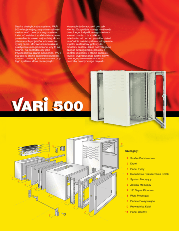 Szafka dystrybucyjna systemu VARI 500 oferuje najwy˝szà uniwersalnoÊç zastosowaƒ pojedynczego systemu. ¸atwoÊç instalacji szafki u∏atwia przeprowadzenie nawet najbardziej skomplikowanych projektów w konkurencyjnej cenie. Mo˝liwoÊci monta˝u sà praktycznie nieograniczone, czy to na Êcianie, na pod∏odze czy jako trzycz´Êciowa szafka naÊcienna. VARI 500 jest w stanie zadowoliç ka˝dego. apraNET rozwinà∏ 3 standardowe typy tego systemu które zaczerpnà∏ z w∏asnych doÊwiadczeƒ i potrzeb klienta. OczywiÊcie istnieje mo˝liwoÊç dowolnego, indywidualnego zastosowania i monta˝u tej szafki w zale˝noÊci od potrzeb projektu. Je˝eli zamówicie ca∏oÊç systemu, otrzymacie w pe∏ni zestawiony, gotowy do monta˝u zestaw. Je˝eli potrzebujecie czegoÊ szczególnego, prosimy o kontakt-jesteÊmy w stanie zaprojektowaç i wyprodukowaç szafki indywidualnego przeznaczenia lub na potrzeby pojedynczego projektu. 1 9 11 6 Szczegó∏y: 10 1 Szafka Podstawowa 2 Drzwi 3 Panel Tylny 4 Dodatkowe Rozszerzenie Szafki 4 5 System Mocujàcy 8 3 2 6 Zestaw Mocujàcy 2 7 19” Szyna Pionowa 1 8 P∏yta Mocujàca 9 Panele Pokrywajàce 7 7 10 Prowadnica Kabli 2 5 2 11 Panel Boczny 500 • 19” szafka Êcienna VARI 500 19” szafka Êcienna VARI 500, trzycz´Êciowa. 19” szafka Êcienna VARI 500 dwucz´Êciowa Dostawa: • szafka Êcienna z wahad∏owà cz´Êcià Êrodkowà o g∏´bokoÊci D = 400 mm. • 19” szyna pionowa od frontu • drzwi z szybà bezpiecznà i standardowym zamkiem • zestaw Êrub M 5 • kompletnie zmontowana Zamówienie paneli dla kabli oddzielnie! Dostawa: • szafka podstawowa (D = 400 mm) • 19” szyna pionowa od frontu • drzwi z szybà bezpiecznà i standardowym zamkiem • panel tylny-demontowany • zestaw do monta˝u na Êcianie • kompletnie zmontowana Zamówienie paneli dla kabli oddzielnie! Wymiary: (H x W x D): H x 600 x 590 mm Dostawa w opakowaniu z tektury. Kolor: RAL 7035 jasno-szary ( light-grey). Wymiary: (H x W x D): H x 600 x 400 mm 19” szafka kompaktowa 24 U • 19” stalowa szafka kompaktowa o wymiarach: H=1250 mm, W=600 mm, D=600 mm. • szklane drzwi frontowe z trzypunktowym zamkiem • zamkni´te drzwi tylne • mo˝liwoÊç przeprowadzenia okablowania z góry oraz z do∏u. • 19” szyna pionowa umo˝liwiajàca regulacj´ g∏´bokoÊci • podstawa z panelem dla kabli H = 100 mm i 3 panelami zamkni´tymi • zestaw Êrub monta˝owych M 5 Dostawa w opakowaniu z tektury. Kolor: RAL 7035 jasno-szary ( light-grey). H (mm): D (mm): Nr produktu H (mm): D (mm): Nr produktu 350 590 50-0201-06 350 400 50-0202-06 500 590 50-0201-09 500 400 50-0202-09 600 590 50-0201-12 600 400 50-0202-12 750 590 50-0201-15 750 400 50-0202-15 900 590 50-0201-18 900 400 50-0202-18 1150 590 50-0201-24 1150 400 50-0202-24 Dostawa: • podstawowa, wentylowana szafka (H = 1150 mm) • drzwi zamkni´te tylne • szklane drzwi przednie z zamkiem • 2 19” szyny pionowe od frontu wysokoÊci 24 U • podstawa H = 100 mm • zestaw Êrub M 5 • kompletnie zmontowana Dostawa w opakowaniu z tektury. Kolor: RAL 7035 jasno-szary ( light-grey). Dodatkowa rama • u˝ywana do zwi´kszenia g∏´bokoÊci szafki o 200 mm do ca∏kowitej g∏´bokoÊci 800 mm. 200 20 Nr produktu 50-0241-00 Nr produktu 50-0000-60