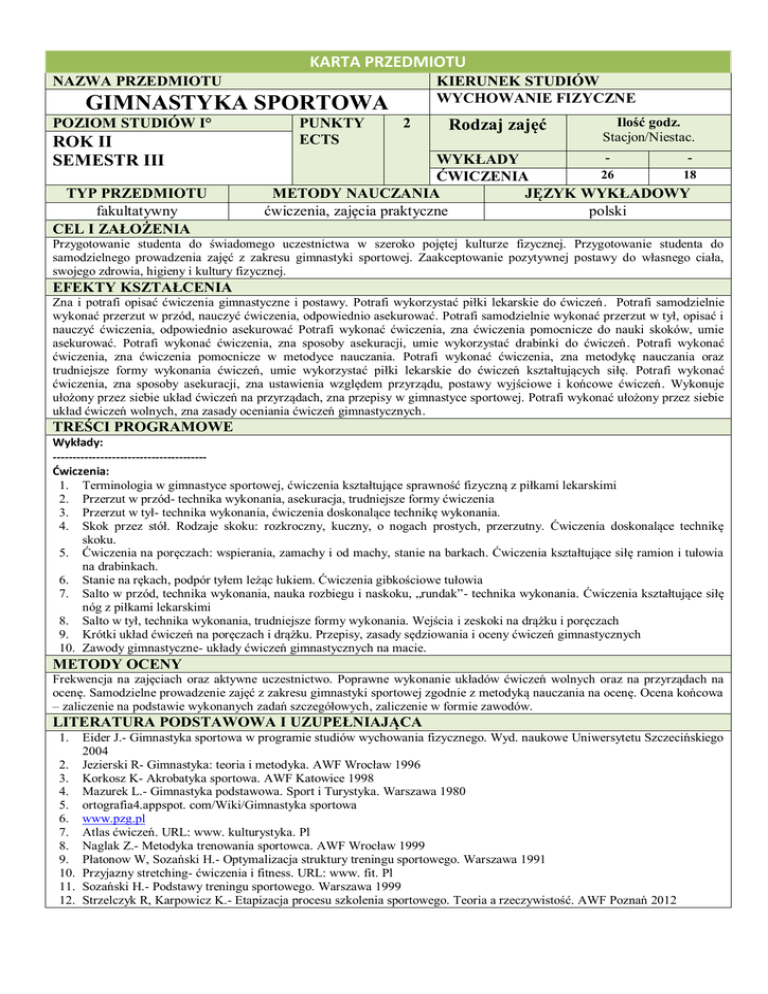 KARTA PRZEDMIOTU KIERUNEK STUDIÓW WYCHOWANIE FIZYCZNE NAZWA PRZEDMIOTU GIMNASTYKA SPORTOWA POZIOM STUDIÓW I° ROK II SEMESTR III TYP PRZEDMIOTU fakultatywny CEL I ZAŁOŻENIA PUNKTY ECTS 2 Rodzaj zajęć Ilość godz. Stacjon/Niestac. WYKŁADY 26 18 ĆWICZENIA METODY NAUCZANIA JĘZYK WYKŁADOWY ćwiczenia, zajęcia praktyczne polski Przygotowanie studenta do świadomego uczestnictwa w szeroko pojętej kulturze fizycznej. Przygotowanie studenta do samodzielnego prowadzenia zajęć z zakresu gimnastyki sportowej. Zaakceptowanie pozytywnej postawy do własnego ciała, swojego zdrowia, higieny i kultury fizycznej. EFEKTY KSZTAŁCENIA Zna i potrafi opisać ćwiczenia gimnastyczne i postawy. Potrafi wykorzystać piłki lekarskie do ćwiczeń. Potrafi samodzielnie wykonać przerzut w przód, nauczyć ćwiczenia, odpowiednio asekurować. Potrafi samodzielnie wykonać przerzut w tył, opisać i nauczyć ćwiczenia, odpowiednio asekurować Potrafi wykonać ćwiczenia, zna ćwiczenia pomocnicze do nauki skoków, umie asekurować. Potrafi wykonać ćwiczenia, zna sposoby asekuracji, umie wykorzystać drabinki do ćwiczeń. Potrafi wykonać ćwiczenia, zna ćwiczenia pomocnicze w metodyce nauczania. Potrafi wykonać ćwiczenia, zna metodykę nauczania oraz trudniejsze formy wykonania ćwiczeń, umie wykorzystać piłki lekarskie do ćwiczeń kształtujących siłę. Potrafi wykonać ćwiczenia, zna sposoby asekuracji, zna ustawienia względem przyrządu, postawy wyjściowe i końcowe ćwiczeń. Wykonuje ułożony przez siebie układ ćwiczeń na przyrządach, zna przepisy w gimnastyce sportowej. Potrafi wykonać ułożony przez siebie układ ćwiczeń wolnych, zna zasady oceniania ćwiczeń gimnastycznych. TREŚCI PROGRAMOWE Wykłady: --------------------------------------Ćwiczenia: 1. Terminologia w gimnastyce sportowej, ćwiczenia kształtujące sprawność fizyczną z piłkami lekarskimi 2. Przerzut w przód- technika wykonania, asekuracja, trudniejsze formy ćwiczenia 3. Przerzut w tył- technika wykonania, ćwiczenia doskonalące technikę wykonania. 4. Skok przez stół. Rodzaje skoku: rozkroczny, kuczny, o nogach prostych, przerzutny. Ćwiczenia doskonalące technikę skoku. 5. Ćwiczenia na poręczach: wspierania, zamachy i od machy, stanie na barkach. Ćwiczenia kształtujące siłę ramion i tułowia na drabinkach. 6. Stanie na rękach, podpór tyłem leżąc łukiem. Ćwiczenia gibkościowe tułowia 7. Salto w przód, technika wykonania, nauka rozbiegu i naskoku, „rundak”- technika wykonania. Ćwiczenia kształtujące siłę nóg z piłkami lekarskimi 8. Salto w tył, technika wykonania, trudniejsze formy wykonania. Wejścia i zeskoki na drążku i poręczach 9. Krótki układ ćwiczeń na poręczach i drążku. Przepisy, zasady sędziowania i oceny ćwiczeń gimnastycznych 10. Zawody gimnastyczne- układy ćwiczeń gimnastycznych na macie. METODY OCENY Frekwencja na zajęciach oraz aktywne uczestnictwo. Poprawne wykonanie układów ćwiczeń wolnych oraz na przyrządach na ocenę. Samodzielne prowadzenie zajęć z zakresu gimnastyki sportowej zgodnie z metodyką nauczania na ocenę. Ocena końcowa – zaliczenie na podstawie wykonanych zadań szczegółowych, zaliczenie w formie zawodów. LITERATURA PODSTAWOWA I UZUPEŁNIAJĄCA Eider J.- Gimnastyka sportowa w programie studiów wychowania fizycznego. Wyd. naukowe Uniwersytetu Szczecińskiego 2004 2. Jezierski R- Gimnastyka: teoria i metodyka. AWF Wrocław 1996 3. Korkosz K- Akrobatyka sportowa. AWF Katowice 1998 4. Mazurek L.- Gimnastyka podstawowa. Sport i Turystyka. Warszawa 1980 5. ortografia4.appspot. com/Wiki/Gimnastyka sportowa 6. www.pzg.pl 7. Atlas ćwiczeń. URL: www. kulturystyka. Pl 8. Naglak Z.- Metodyka trenowania sportowca. AWF Wrocław 1999 9. Płatonow W, Sozański H.- Optymalizacja struktury treningu sportowego. Warszawa 1991 10. Przyjazny stretching- ćwiczenia i fitness. URL: www. fit. Pl 11. Sozański H.- Podstawy treningu sportowego. Warszawa 1999 12. Strzelczyk R, Karpowicz K.- Etapizacja procesu szkolenia sportowego. Teoria a rzeczywistość. AWF Poznań 2012 1.