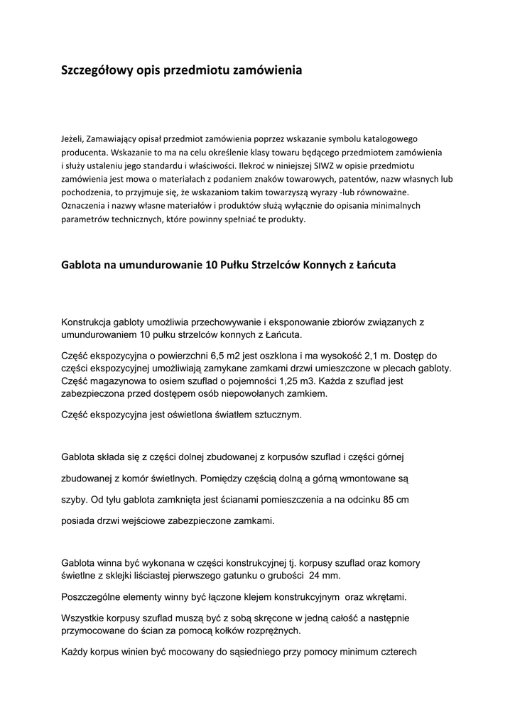 Szczegółowy opis przedmiotu zamówienia Jeżeli, Zamawiający opisał przedmiot zamówienia poprzez wskazanie symbolu katalogowego producenta. Wskazanie to ma na celu określenie klasy towaru będącego przedmiotem zamówienia i służy ustaleniu jego standardu i właściwości. Ilekrod w niniejszej SIWZ w opisie przedmiotu zamówienia jest mowa o materiałach z podaniem znaków towarowych, patentów, nazw własnych lub pochodzenia, to przyjmuje się, że wskazaniom takim towarzyszą wyrazy -lub równoważne. Oznaczenia i nazwy własne materiałów i produktów służą wyłącznie do opisania minimalnych parametrów technicznych, które powinny spełniad te produkty. Gablota na umundurowanie 10 Pułku Strzelców Konnych z Łaocuta Konstrukcja gabloty umożliwia przechowywanie i eksponowanie zbiorów związanych z umundurowaniem 10 pułku strzelców konnych z Łańcuta. Część ekspozycyjna o powierzchni 6,5 m2 jest oszklona i ma wysokość 2,1 m. Dostęp do części ekspozycyjnej umożliwiają zamykane zamkami drzwi umieszczone w plecach gabloty. Część magazynowa to osiem szuflad o pojemności 1,25 m3. Każda z szuflad jest zabezpieczona przed dostępem osób niepowołanych zamkiem. Część ekspozycyjna jest oświetlona światłem sztucznym. Gablota składa się z części dolnej zbudowanej z korpusów szuflad i części górnej zbudowanej z komór świetlnych. Pomiędzy częścią dolną a górną wmontowane są szyby. Od tyłu gablota zamknięta jest ścianami pomieszczenia a na odcinku 85 cm posiada drzwi wejściowe zabezpieczone zamkami. Gablota winna być wykonana w części konstrukcyjnej tj. korpusy szuflad oraz komory świetlne z sklejki liściastej pierwszego gatunku o grubości 24 mm. Poszczególne elementy winny być łączone klejem konstrukcyjnym oraz wkrętami. Wszystkie korpusy szuflad muszą być z sobą skręcone w jedną całość a następnie przymocowane do ścian za pomocą kołków rozprężnych. Każdy korpus winien być mocowany do sąsiedniego przy pomocy minimum czterech śrub łączących. Komory świetlne również muszą być skręcone w całość i mocowane do ścian kołkami rozprężnymi. Powierzchnia górna korpusów szuflad stanowi powierzchnię ekspozycyjną i należy ją wyłożyć płytami wiórowymi o grubości 16 mm obitymi naciągniętym na wierzchnią stronę zielonym prawdziwym suknem. Płyt nie należy mocować na stałe by istniała możliwość ich wyjmowania. Listwy do montażu szyb wykonać z drewna dębowego bezsęcznego i mocować do zespolonych korpusów szuflad oraz komór świetlnych klejem konstrukcyjnym oraz wkrętami. Listwy bejcować i lakierować natryskowo. Listwy od strony widocznej muszą mieć powierzchnię z frezowaniem ozdobnym. Szyby należy wykonać jako trójwarstwowe z dwóch szyb mineralnych o grubości 6 mm każda oraz folii wzmacniającej wlaminowanej pomiędzy obie szyby o grubości minimum 0,7mm. Krawędzie szyb szlifować i polerować. Szyby wstawiać w listwy dosuwając jedną do drugiej na styk bez szczelin. Szyby po zamontowaniu unieruchomić by uniemożliwić wyjęcie. Szuflady wykonać z płyty stolarskiej. Wszystkie krawędzie wykończyć litym drewnem dębowym. Fronty szuflad wykonać z drewna dębowego bezsęcznego. Całość bejcować i lakierować natryskowo. Front dookoła płaszczyzny obwiedziony jest ramą szerokości 70mm. W miejscu tym uzyskuje grubość 40mm. Widoczna krawędź ramy frezowana jest ozdobnie. Każda z ośmiu szuflad zamykana jest zamkiem z cylindrem ryglowym. Otwieranie szuflady następuje po pociągnięciu za klucz otwartego zamka. Szuflady mocowane są na prowadnicach z pełnym wysuwem o długości 91,5 cm. Nośność prowadnic powyżej 130kg. Za dwuskrzydłowymi zamykanymi czterema zamkami drzwiami otwieranymi na zewnątrz na zawiasach wpuszczanych, należy zamontować jednoskrzydłowe drzwi z białej płyty meblowej grubości 18 mm na zawiasie listwowym, które stanowić będą podłoże fotografii stanowiącej tło ekspozycji i również będą otwierane na zewnątrz. Komory świetlne (osiem 70x100 cm i jedna 100x100 cm) wyposażyć w lampy metalohalogenkowe o parametrach: trwałość minimum 50 tys. godzin, jasność 8000 lm, barwa 3000 K, oddawanie barw ponad 94%. Z każdej z komór należy odprowadzać ciepło wentylatorem o maksymalnym poziomie hałasu 7dB i wydajności minimum 90 m3/h montowanym do pokrywy zamykającej komorę od góry wykonaną z płyty meblowej białej grubości 10 mm. Wentylatory muszą być mocowane na amortyzatorach tłumiących drgania. Przed zaciąganiem do komory kurzu zabezpiecza filtr powietrza umieszczony w otworze pokrywy z przeciwległego brzegu w stosunku do wentylatora. Filtr musi być typowy ławo dostępny zarówno obecnie jak i w przyszłości. W komorach zamontować filtr zatrzymujący promieniowanie podczerwone i UV wytwarzane przez lampę. Filtr należy montować od strony wnętrza gabloty. Z uwagi na punktowe źródła światła, konieczne jest rozproszenie strumienia świetlnego filtrem, którego gęstość i rozproszenie należy dobrać eksperymentalnie po zainstalowaniu ekspozycji. Konieczne też jest doświetlenie eksponowanych przedmiotów od frontu. Do tego celu należy użyć elementu optycznego skupiającego światło i kierującego je w właściwą stronę eksponatów tj. od frontu w kierunku wnętrza gabloty. Zespół komór świetlnych wykańcza wieniec górny wysokości 200 mm. Wieniec wykonany jest z drewna dębowego bezsęcznego z frezowaniem ozdobnym. Wieniec mocowany jest do komór od strony niewidocznej wkrętami oraz bejcowany i lakierowany natryskowo. Zamki użyte do zabezpieczenia gabloty winny mieć cylindry minimum sześciosworzniowe o wysokim stopniu bezpieczeństwa. Wszystkie zamki winny być otwierane jednym kluczem. Gablota na uzbrojenie 10 Pułku Strzelców Konnych z Łaocuta Konstrukcja gabloty umożliwia przechowywanie i eksponowanie zbiorów związanych z uzbrojeniem 10 pułku strzelców konnych z Ł