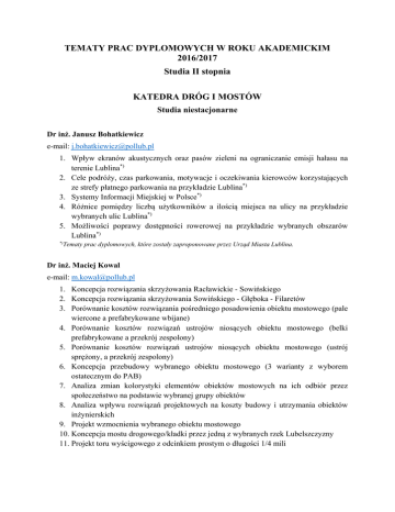 TEMATY PRAC DYPLOMOWYCH W ROKU AKADEMICKIM 2016/2017 Studia II stopnia KATEDRA DRÓG I MOSTÓW Studia niestacjonarne Dr inż. Janusz Bohatkiewicz e-mail: [email protected] 1. Wpływ ekranów akustycznych oraz pasów zieleni na ograniczanie emisji hałasu na terenie Lublina*) 2. Cele podróży, czas parkowania, motywacje i oczekiwania kierowców korzystających ze strefy płatnego parkowania na przykładzie Lublina*) 3. Systemy Informacji Miejskiej w Polsce*) 4. Różnice pomiędzy liczbą użytkowników a ilością miejsca na ulicy na przykładzie wybranych ulic Lublina*) 5. Możliwości poprawy dostępności rowerowej na przykładzie wybranych obszarów Lublina*) *) Tematy prac dyplomowych, które zostały zaproponowane przez Urząd Miasta Lublina. Dr inż. Maciej Kowal e-mail: [email protected] 1. Koncepcja rozwiązania skrzyżowania Racławickie - Sowińskiego 2. Koncepcja rozwiązania skrzyżowania Sowińskiego - Głęboka - Filaretów 3. Porównanie kosztów rozwiązania pośredniego posadowienia obiektu mostowego (pale wiercone a prefabrykowane wbijane) 4. Porównanie kosztów rozwiązań ustrojów niosących obiektu mostowego (belki prefabrykowane a przekrój zespolony) 5. Porównanie kosztów rozwiązań ustrojów niosących obiektu mostowego (ustrój sprężony, a przekrój zespolony) 6. Koncepcja przebudowy wybranego obiektu mostowego (3 warianty z wyborem ostatecznym do PAB) 7. Analiza zmian kolorystyki elementów obiektów mostowych na ich odbiór przez społeczeństwo na podstawie wybranej grupy obiektów 8. Analiza wpływu rozwiązań projektowych na koszty budowy i utrzymania obiektów inżynierskich 9. Projekt wzmocnienia wybranego obiektu mostowego 10. Koncepcja mostu drogowego/kładki przez jedną z wybranych rzek Lubelszczyzny 11. Projekt toru wyścigowego z odcinkiem prostym o długości 1/4 mili Dr inż. Stefan Firlej e-mail: [email protected] 1. Analiza wpływu połączenia warstw na trwałość nawierzchni 2. Ocena kolejności warstw w trwałości nawierzchni 3. Optymalizacja warstwy kruszywa łamanego w nawierzchni drogowej 4. Optymalizacja czasu robót ziemnych 5. Projektowanie niwelety drogi przy bilansowaniu robót ziemnych bezpośrednio 6. Frezowanie warstwy ścieralnej a trwałość nawierzchni w przebudowie 7. Ocena terminu przebudowy drogi istniejącej 8. Wariantowe rozwiązania konstrukcji nawierzchni drogowej 9. Ocena konstrukcji nawierzchni w zatoce komunikacji miejskiej 10. Ocena zmienności siły dośrodkowej w kolejowym łuku poziomym Dr inż. Sławomir Karaś e-mail: [email protected] 1. 2. 3. 4. 5. Drogowy most zespolony Przegląd szczegółowy wybranego obiektu mostowego Nieniszczące metody badania mostów betonowych Utrzymanie stalowych mostów kolejowych Uderzenia poziome w konstrukcje mostowe Dr inż. Jerzy Kukiełka e-mail: jerzy.kukieł[email protected] 1. Trwałość zmęczeniowa mieszanek mineralno-asfaltowych 2. Miał gumowy z recyklingu opon samochodowych i jego wykorzystanie w nawierzchniach asfaltowych 3. Katalogi typowych konstrukcji nawierzchni podatnych i półsztywnych krajowe i zagraniczne 4. Katalogi typowych nawierzchni sztywnych krajowe i zagraniczne 5. Trwałość nawierzchni o podbudowach z mieszanek mineralno-cementowoemulsyjnych Dr inż. Krzysztof Śledziewski e-mail: [email protected] 1. 2. 3. 4. 5. Technologia budowy mostu i jej wpływ na koszt inwestycji Analiza technologii montażu mostu zespolonego metodą nasuwania podłużnego Wpływ aspektów ekologicznych na rozwiązania projektowe obiektów inżynierskich Projekt mostu z elementami estetycznymi Trwałość i niezawodność obiektu mostowego Dr inż. Agnieszka Woszuk e-mail: [email protected] 1. Analiza wpływu rodzaju i ilości dodatku adhezyjnego na mrozoodporność mieszanek mineralno-asfaltowych 2. Projektowanie i badania wpływu rodzaju i zawartości asfaltu na sztywność mieszanek mineralno-asfaltowych. 3. Analiza wpływu zmian w strukturze rodzajowej pojazdów na wybranej sieci drogowej (powiat, województwo, kraj) na stan nawierzchni. 4. Temat własny studenta
