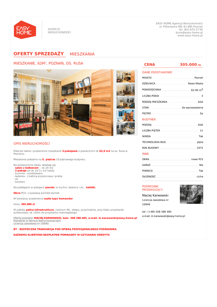 EASY-HOME Agencja Nieruchomości ul. Półwiejska 9/8, 61-885 Poznań tel. (61) 670 37 00 [email protected] www.easy-home.pl OFERTY SPRZEDAŻY MIESZKANIA MIESZKANIE, 62M 2, POZNAŃ, OS. RUSA CENA 305.000 ZŁ DANE PODSTAWOWE MIASTO Poznań DZIELNICA Nowe Miasto 62.90 m 2 POWIERZCHNIA LICZBA POKOI 3 RODZAJ MIESZKANIA STAN blok Do wprowadzenia PIĘTRO 5p BUDYNEK RODZAJ LICZBA PIĘTER WINDA OPIS NIERUCHOMOŚCI blok 11 Tak TECHNOLOGIA BUD. płyta ROK BUDOWY 1975 Polecam ładne i przestronne mieszkanie 3-pokojowe o powierzchni ok 62,9 m2 na os. Rusa w Poznaniu. INNE Mieszkanie położone na 5. piętrze 10-piętrowego budynku. OKNA Na powierzchnie lokalu składają się: - salon z balkonem - ok 20 m2 - 2 pokoje po ok 10-11 m2 każdy - kuchnia - umeblowana - łazienka - z kabiną prysznicową i pralką - wc - korytarz GARAŻ Nie PIWNICA Tak Na podłogach w pokojach panele; w kuchni, łazience i wc - kafelki. POŚREDNIK PROWADZĄCY Okna PCV, z wystawą wschód-zachód. W korytarzu przestronna szafa typu komandor. GŁOŚNOŚĆ Maciej Karwowski Licencja zawodowa nr Cena: 305.000 zł 10940 W pobliżu pełna infrastruktura, centrum M1, sklepy, przychodnia, przy bloku przystanek autobusowy, ok 100m do przystanku tramwajowego. tel.: (+48) 508 388 485 Ofertę prowadzi: MACIEJ KARWOWSKI, kom. 508 388-485, e-mail: [email protected] Pośrednik w Obrocie Nieruchomościami Licencja zawodowa nr 10940 BT - BEZPIECZNA TRANSAKCJA POD OPIEKĄ PROFESJONALNEGO POŚREDNIKA KAŻDEMU KLIENTOWI BEZPŁATNIE POMAGAMY W UZYSKANIU KREDYTU e-mail: [email protected] nowe PCV ciche