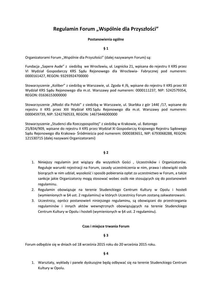 Regulamin Forum „Wspólnie dla Przyszłości” Postanowienia ogólne §1 Organizatorami Forum „Wspólnie dla Przyszłości” (dalej nazywanym Forum) są: Fundacja „Sapere Aude” z siedzibą we Wrocławiu, ul. Legnicka 21, wpisana do rejestru II KRS przez VI Wydział Gospodarczy KRS Sądu Rejonowego dla Wrocławia- Fabrycznej pod numerem: 0000161427, REGON: 93293924700000 Stowarzyszenie „Koliber” z siedzibą w Warszawie, ul. Zgoda 4 /6, wpisane do rejestru II KRS przez XII Wydział KRS Sądu Rejonowego dla m.st. Warszawy pod numerem: 0000111237, NIP: 5242579354, REGON: 01636153000000 Stowarzyszenie „Młodzi dla Polski” z siedzibą w Warszawie, ul. Skarbka z gór 144E /17, wpisane do rejestru II KRS przez XIII Wydział KRS Sądu Rejonowego dla m.st. Warszawy pod numerem: 0000459739, NIP: 5242760533, REGON: 14673446000000 Stowarzyszenie „Studenci dla Rzeczypospolitej” z siedzibą w Krakowie, ul. Batorego 25/834/909, wpisane do rejestru II KRS przez Wydział XI Gospodarczy Krajowego Rejestru Sądowego Sądu Rejonowego dla Krakowa- Śródmieścia pod numerem: 0000383651, NIP: 6793068288, REGON: 121530715 (dalej nazywani Organizatorami) §2 1. Niniejszy regulamin jest wiążący dla wszystkich Gości , Uczestników i Organizatorów. Reguluje warunki rejestracji na Forum, zasady uczestniczenia w nim, prawa i obowiązki osób biorących w nim udział, wysokość i sposób pobierania opłat za uczestnictwo w Forum, a także sankcje jakie Organizatorzy mogą stosować wobec osób nie stosujących się do postanowień regulaminu. 2. Regulamin obowiązuje na terenie Studenckiego Centrum Kultury w Opolu i hosteli (wymienionych w §4 ust. 2 regulaminu) w których Uczestnicy Forum zostaną zakwaterowani. 3. Uczestnicy, oprócz postanowień niniejszego regulaminu, są obowiązani do przestrzegania regulaminów i innych aktów wewnętrznych obowiązujących na terenie Studenckiego Centrum Kultury w Opolu i hosteli (wymienionych w §4 ust. 2 regulaminu). Czas i miejsce trwania Forum §3 Forum odbędzie się w dniach od 18 września 2015 roku do 20 września 2015 roku. §4 1. Warsztaty, wykłady i panele dyskusyjne będą odbywać się na terenie Studenckiego Centrum Kultury w Opolu. 2. Uczestnicy zostaną zakwaterowani w Domu Studenckim „Ikar”. Miejsce zakwaterowania może ulec zmianie. Za zmianę hosteli Organizatorzy nie ponoszą odpowiedzialności. Pokoje w hostelach nie są koedukacyjne. Rejestracja i uczestnictwo w Forum §5 1. Uczestnictwo w Forum ma charakter dobrowolny i odpłatny. 2. W Forum mogą uczestniczyć osoby, które najpóźniej w dniu rozpoczęcia Forum ukończyły 18 lat, posiadające pełną zdolność do czynności prawnych. W Forum mogą także uczestniczyć, za zgodą opiekunów prawnych i Komisji Rejestrującej, osoby, które ukończyły 16 rok życia najpóźniej w dniu rozpoczęcia Forum i posiadają co najmniej ograniczoną zdolność do czynności prawnych. §6 1. Warunkiem koniecznym uczestniczenia w Forum jest uprzednie zarejestrowanie się w sposób opisany w § 7 i uiszczenie opłaty o której mowa w ust. 2. 2. Opłata za uczestnictwo w Forum wynosi 100 zł (słownie: sto złotych). §7 1. Rejestracja do uczestniczenia w Forum polega na wykonaniu następujących czynności: a) wypełnienie formularza rejestracyjnego znajdującego się na stronie http://wspolniedlaprzyszlosci.pl/ i podjęcie dalszych kroków wskazanych na stronie internetowej; b) oczekiwanie na decyzję Komisji Rejestrującej o której mowa w §8; c) wniesienie opłaty na rachunek bankowy wskazany przez organizatorów wraz z informacją o zakwalifikowaniu uczestnika Forum, o której mowa w §8 ust. 4 w terminie określonym w §8 ust. 5; 2. Rejestracja odbywa się w dniach od 22 sierpnia 2015 roku do 10 września 2015 roku. 3. Organizatorzy mają prawo do przedłużenia terminu rejestracji. Informacja o przedłużeniu pojawi się nie zwłocznie na stronie internetowej Forum http://wspolniedlaprzyszlosci.pl/. §8 1. Zgłoszenie wysłanie za pomocą formularza rejestracyjnego jest rozpatrywane przez Komisję Rejestrującą. 2. Komisja Rejestrująca składa się po jednym przedstawicielu każdego z czterech Organizatorów. 3. Kryteria, którymi będzie się kierowała Komisja Rejestrująca przy selekcjonowaniu zgłoszeń będą: maksymalna możliwa liczba uczestników Forum (do 200 osób), uzasadnienie decyzji o wzięciu udziału w Forum, a także kolejność wysyłanych formularzy. Komisja Rejestrująca może odmówić udziału w Forum osobom, które ze względu na dotychczasowy tryb życia nie dają gwarancji przestrzegania postanowień regulaminów wymienionych w §2 ust. 3 i poleceń Organizatorów, a w szczególności popełniły przestępstwo, w inny sposób naruszyły porządek prawny lub rażąco naruszyły zasady współżycia społecznego. 4. Decyzje Komisji Rejestrującej zostaną wysłane aplikującym na podany przez nich w formularzu adres e-mail, najpóźniej do dnia 10 września 2015 roku. Decyzja Komisji jest ostateczna. 5. Po otrzymaniu pozytywnej decyzji Komisji Rejestrującej, aplikujący jest obowiązany do wniesienia w terminie 5 dni opłaty za uczestnictwo w Forum. Po niedotrzymaniu terminu wpłaty decyzja Komisji Rejestrującej wygasa. 6. Organizatorzy mają prawo do przedłużenia terminów o których mowa ust. 4 i 5 . Informacja o przedłużeniu pojawi się nie zwłocznie na stronie internetowej Forum http://wspolniedlaprzyszlosci.pl/. Prawa i obowiązki Organizatorów i Uczestników Forum §8 Uczestnicy Forum mają prawo brać aktywny udział we wszystkich warsztatach, wykładach i innych wydarzeniach przewidzianych przez program Forum i Organizatorów. §9 Uczestnicy Forum, w trakcie jego trwania, mają zagwarantowane bezpłatne noclegi i wyżywienie w hostelach wskazanych w § 4 ust. 2. § 10 Uczestnicy Forum mają zagwarantowany od Organizatorów i sponsorów projektu zestaw gadżetów związanych z uczestniczeniem w wydarzeniu. § 11 Uczestnicy Forum oraz w