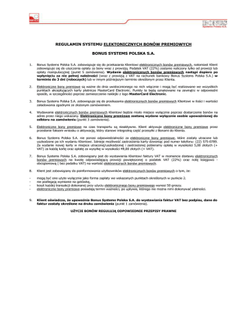 REGULAMIN SYSTEMU ELEKTONICZNYCH BONÓW PREMIOWYCH BONUS SYSTEMS POLSKA S.A. 1. Bonus Systems Polska S.A. zobowi zuje si do przekazania Klientowi elektronicznych bonów premiowych, natomiast Klient zobowi zuje si do uiszczenia op"aty za bony wraz z prowizj . Podatek VAT (22%) zostanie naliczony tylko od prowizji lub op"aty manipulacyjnej (punkt 5 zamówienia). Wydanie elektronicznych bonów premiowych nast,pi dopiero po wp-yni.ciu za nie pe-nej nale1no2ci (wraz z prowizj z VAT na rachunek bankowy Bonus Systems Polska S.A.) w terminie do 3 dni (roboczych) lub w innym pó*niejszym terminie okre+lonym przez Klienta. 2. Elektroniczne bony premiowe s wa-ne do dnia uwidocznionego na nich w" cznie i mog by/ realizowane we wszystkich punktach akceptuj cych karty p"atnicze MasterCard Electronic. Punkty te b d oznakowane na zewn trz w odpowiedni sposób, w szczególno+ci poprzez zamieszczenie naklejki z logo MasterCard Electronic. 3. Bonus Systems Polska S.A. zobowi zuje si do przekazania elektronicznych bonów premiowych Klientowi w ilo+ci i warto+ci za"adowania zgodnymi ze z"o-onym zamówieniem. 4. Wydawanie elektronicznych bonów premiowych Klientowi b dzie mia"o miejsce wy" cznie poprzez dostarczenie bonów na adres przez niego wskazany. Elektroniczne bony premiowe zostan, wydane wy-,cznie osobie upowa1nionej do odbioru na zamówieniu (punkt 3 zamówienia). 5. Elektroniczne bony premiowe na czas transportu s nieaktywne. Klient aktywuje elektroniczne bony premiowe przez przes"anie faksem wniosku o aktywacj , który stanowi integraln cz +/ przesy"ki z Bonami do Klienta. 6. Bonus Systems Polska S.A. nie ponosi odpowiedzialno+ci za elektroniczne bony premiowe, które zosta"y utracone lub uszkodzone po ich wydaniu Klientowi. Istnieje mo-liwo+/ zastrze-enia karty dzwoni c pod numer telefonu: (22) 575-0789. Za wydanie nowej karty w miejsce utraconej/uszkodzonej i zastrze-onej pobieramy op"at w wysoko+ci 5,00 z"otych (+ VAT) za ka-d kart oraz op"at za wysy"k w wysoko+ci 49,00 z"otych (+ VAT). 7. Bonus Systems Polska S.A. zobowi zany jest do wystawienia Klientowi faktury VAT w momencie dostawy elektronicznych bonów premiowych na kwot odpowiadaj c prowizji powi kszonej o podatek VAT (22%) oraz not ksi gowo obci -eniow ( bez podatku VAT) na warto+/ elektronicznych bonów premiowych. 8. Klient jest zobowi zany do poinformowania u-ytkowników elektronicznych bonów premiowych o tym, -e: - mog by/ one u-yte wy" cznie jako forma zap"aty we wskazanych punktach okre+lonych w punkcie 2. nie podlegaj wymianie na gotówk , koszt ka-dej transakcji dokonanej przy u-yciu elektronicznego bonu premiowego wynosi 50 groszy. elektroniczne bony premiowe posiadaj termin wa-no+ci, po up"ywie, którego nie mo-na nimi dokonywa/ p"atno+ci. 9. Klient o2wiadcza, 1e upowa1nia Bonus Systems Polska S.A. do wystawiania faktur VAT bez podpisu, dane do faktur zosta-y okre2lone na druku zamówienia (punkt 1 zamówienia). U9YCIE BONÓW REGULUJ; ODPOWIEDNIE PRZEPISY PRAWNE