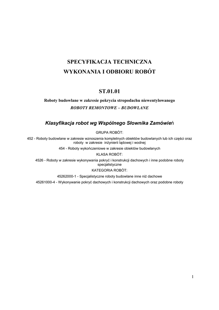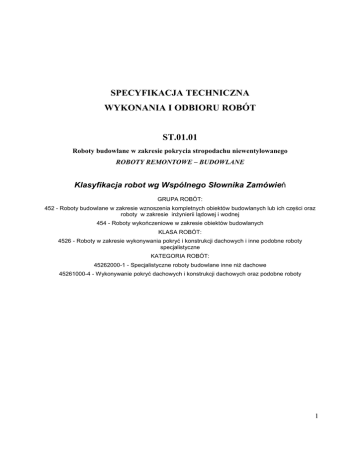 SPECYFIKACJA TECHNICZNA WYKONANIA I ODBIORU ROBÓT ST.01.01 Roboty budowlane w zakresie pokrycia stropodachu niewentylowanego ROBOTY REMONTOWE – BUDOWLANE Klasyfikacja robot wg Wspólnego Słownika Zamówień GRUPA ROBÓT: 452 - Roboty budowlane w zakresie wznoszenia kompletnych obiektów budowlanych lub ich części oraz roboty w zakresie inŜynierii lądowej i wodnej 454 - Roboty wykończeniowe w zakresie obiektów budowlanych KLASA ROBÓT: 4526 - Roboty w zakresie wykonywania pokryć i konstrukcji dachowych i inne podobne roboty specjalistyczne KATEGORIA ROBÓT: 45262000-1 - Specjalistyczne roboty budowlane inne niŜ dachowe 45261000-4 - Wykonywanie pokryć dachowych i konstrukcji dachowych oraz podobne roboty 1 1. WSTĘP 1.1. Przedmiot ST Przedmiotem niniejszej Specyfikacji Technicznej są wymagania dotyczące wykonania i odbioru robót remontowych pokrycia stropodachu niewentylowanego w zadaniu Remont pokrycia dachowego budynku Zespołu Szkół Samorządowych przy ul. Staszica 5 w Boguszowie-Gorcach. 1.2. Zakres stosowania ST Niniejsza Specyfikacja Techniczna jest stosowana jako dokument przetargowy i kontraktowy przy zlecaniu i realizacji robót wymienionych w p. 1.1. 1.3. Zakres robót objętych ST Specyfikacja techniczna obejmuj roboty budowlane do wykonania w ramach robót remontowych pokrycia dachu. 1.4. Określenia podstawowe Określenia podstawowe podane w niniejszej ST są zgodne z obowiązującymi odpowiednimi normami i ST-00 – „Wymagania ogólne”, warunkami technicznymi wykonania i odbioru robót budowlano-montaŜowych a takŜe instrukcją ITB. 1.5. Ogólne wymagania dotyczące robót Wykonawca robót jest odpowiedzialny za jakość ich wykonania oraz zgodność z dokumentacją projektową, ST i poleceniami inspektora nadzoru. Roboty prowadzić zgodnie z Rozporządzeniem Ministra Infrastruktury z dnia 6 lutego 2003 r. w sprawie bezpieczeństwa i higieny pracy podczas wykonywania robót budowlanych (Dz. U. z 2003 r. Nr 48, poz. 401).Wymagania ogólne dot. robót podano w części – Specyfikacja ogólna ST.00.00„Wymagania ogólne”. Szczegółowe wymagania dotyczące robót wynikają z zapisów dokumentacji projektowo-kosztorysowej oraz instrukcji technicznych ITB producentów i dostawców materiałów, aprobat technicznych i urządzeń oraz niniejszej specyfikacji. 2 2. MATERIAŁY 2.1 Ogólne wymagania dotyczące materiałów Ogólne wymagania dot. materiałów, ich pozyskiwania i składowania podano w części – „Wymagania ogólne”. Wykaz niezbędnych materiałów wynika z przyjętych w dokumentacji projektowej rozwiązań projektowych. 2.2 Szczegółowe wymagania dotyczące materiałów Szczegółowe wymagania dotyczącej materiałów zawarto w części opisowej i rysunkowej projektu. Do wykonania poszczególnych robót ogólnobudowlanych naleŜy stosować materiały zgodne z: - dokumentacją projektową. - odpowiadające parametrami technicznymi materiałom zgodnie z : - Aprobatą Techniczną AT/2000-11-0041, - Aprobatą Techniczną AT/2002-11-0233, Właściwości uŜytych materiałów muszą odpowiadać polskim normom, świadectwom oraz instrukcjom technicznym dopuszczenia do stosowania wydanym przez odpowiednie Instytuty Badawcze. Materiały przeznaczone do wbudowania muszą być dopuszczone do obrotu i powszechnego stosowania w budownictwie. Są to: 1. Wyroby budowlane, właściwie oznaczone, dla których zgodnie z odrębnymi przepisami: a) wydano certyfikat na znak bezpieczeństwa, b) dokonano oceny zgodności i wydano certyfikat zgodności lub deklarację zgodności z Polską Normą lub aprobatą techniczną. 2. Wyroby budowlane umieszczone w wykazie wyrobów nie mających istotnego wpływu na spełnienie wymagań podstawowych oraz wyrobów wytwarzanych i stosowanych wg tradycyjnie uznanych zasad sztuki budowlanej. Dopuszczone do jednostkowego stosowania w obiekcie budowlanym, mogą być wyroby wykonane wg indywidualnej dokumentacji technicznej sporządzonej przez projektanta obiektu lub z nim uzgodnionej, dla których dostawca wydał oświadczenie wskazujące, 3 Ŝe zapewniono zgodność wyrobu z tą dokumentacją oraz z obowiązującymi przepisami i normami. Materiał przed wbudowaniem kaŜdorazowo musi uzyskać akceptację Inspektora Nadzoru. Pap podkładowa - papa na osnowie z włókniny poliestrowej modyfikowana SBS. Od wierzchniej strony papa pokryta jest drobnoziarnistą posypką, wzdłuŜ jednego brzegu wstęgi znajduje się pas masy asfaltowej nie pokryty posypką, zabezpieczony folią z tworzywa sztucznego. Spodnia strona papy pokryta jest folią z tworzywa sztucznego. Druga warstwa (po warstwie podkładowej stanowiącej część styropapy), to papa asfaltowa zgrzewalna, wierzchniego krycia, modyfikowana SBS, na osnowie z włókniny poliestrowej o gramaturze 200 g/m2. Od wierzchniej strony papa pokryta jest gruboziarnistą posypką, wzdłuŜ jednego brzegu wstęgi znajduje się pas masy asfaltowej nie pokryty posypką, zabezpieczony folią z tworzywa sztucznego. Spodnia strona papy pokryta jest folią z tworzywa sztucznego. WŁAŚCIWOŚCI TECHNICZNE papy zgrzewalnej, modyfikowana SBS, podkładowej: − maks. siła rozciąg. na pasku szer. 5 cm wzdłuŜ/w poprzek, min900 / 700 N − wydłuŜenie przy maks. sile rozciąg. wzdłuŜ / poprzek, min. 50 / 60 % − giętkość w obniŜonych temperaturach - 25º C − odporność na działanie wysokiej temp., w ciągu 2 h +100º C − grubość 3,4 ±0,2 mm − długość rolki 7,5 m − szerokość rolki 1,0 m − gwarancja min.10 lat − reakcja na ogień – klasa F Papa przeznaczona jest do wykonywania podkładowej warstwy wielowarstwowych pokryć dachowych. 4 WŁAŚCIWOŚCI TECHNICZNE papy zgrzewalnej, modyfikowana SBS, wierzchniego krycia: − gramatura osnowy (włóknina poliestrowa) 200 g/m2 − zawartość asfaltu modyfikowanego elastomerem SBS, min. 2500 g/m2 − maks. siła rozciąg. na pasku szer. 5 cm wzdłuŜ/w poprzek, min700 / 500 N − wydłuŜenie przy maks. sile rozciąg. wzd