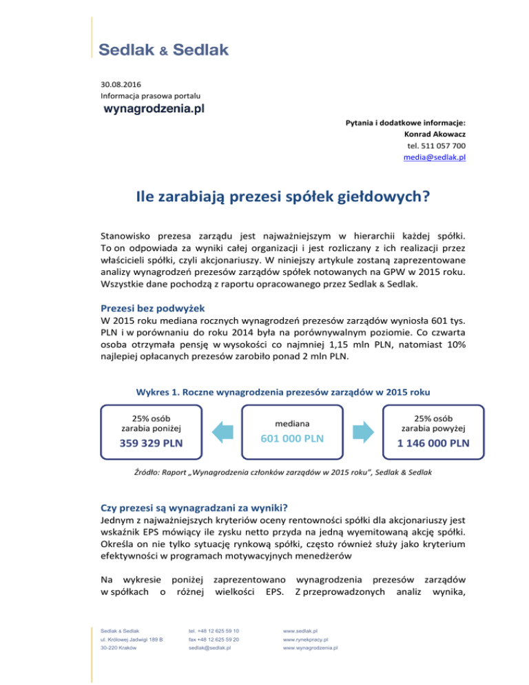 30.08.2016 Informacja prasowa portalu Pytania i dodatkowe informacje: Konrad Akowacz tel. 511 057 700 [email protected] Ile zarabiają prezesi spółek giełdowych? Stanowisko prezesa zarządu jest najważniejszym w hierarchii każdej spółki. To on odpowiada za wyniki całej organizacji i jest rozliczany z ich realizacji przez właścicieli spółki, czyli akcjonariuszy. W niniejszy artykule zostaną zaprezentowane analizy wynagrodzeń prezesów zarządów spółek notowanych na GPW w 2015 roku. Wszystkie dane pochodzą z raportu opracowanego przez Sedlak & Sedlak. Prezesi bez podwyżek W 2015 roku mediana rocznych wynagrodzeń prezesów zarządów wyniosła 601 tys. PLN i w porównaniu do roku 2014 była na porównywalnym poziomie. Co czwarta osoba otrzymała pensję w wysokości co najmniej 1,15 mln PLN, natomiast 10% najlepiej opłacanych prezesów zarobiło ponad 2 mln PLN. Wykres 1. Roczne wynagrodzenia prezesów zarządów w 2015 roku 25% osób zarabia poniżej mediana 601 000 PLN 359 329 PLN 25% osób zarabia powyżej 1 146 000 PLN Źródło: Raport „Wynagrodzenia członków zarządów w 2015 roku”, Sedlak & Sedlak Czy prezesi są wynagradzani za wyniki? Jednym z najważniejszych kryteriów oceny rentowności spółki dla akcjonariuszy jest wskaźnik EPS mówiący ile zysku netto przyda na jedną wyemitowaną akcję spółki. Określa on nie tylko sytuację rynkową spółki, często również służy jako kryterium efektywności w programach motywacyjnych menedżerów Na wykresie poniżej zaprezentowano wynagrodzenia prezesów zarządów w spółkach o różnej wielkości EPS. Z przeprowadzonych analiz wynika, Sedlak & Sedlak tel. +48 12 625 59 10 www.sedlak.pl ul. Królowej Jadwigi 189 B fax +48 12 625 59 20 www.rynekpracy.pl 30-220 Kraków [email protected] www.wynagrodzenia.pl iż wynagrodzenia prezesów zarządów rosły wraz ze wzrostem osiągniętego zysku na akcję. Najwyższe pensje – ponad 1,3 mln PLN – otrzymywali prezesi spółek, w których EPS był najwyższy i wyniósł 10 PLN i więcej. W spółkach o zysku na akcję wynoszącym od 2 – 9,9 PLN prezesi zarabiali o 14% mniej. Mediana ich wynagrodzeń wyniosła 1,1 mln PLN. Najniższe wynagrodzenia otrzymywali prezesi spółek w których zysk netto był ujemny – 430 tys. PLN. Zaniepokojenie inwestorów powinien budzić fakt, iż wynagrodzenia w spółkach, które generują straty były tylko o 17% niższe od wynagrodzeń w spółkach, które osiągnęły najniższy poziom zysków. Wykres 2. Wynagrodzenia prezesów zarządów w spółkach różnej wielkości wskaźnika EPS (osoby, które przepracowały cały rok) 1 304 318 1 116 000 602 500 517 000 429 640 ujemny 0-0,49 PLN 0,5-1,99 PLN 2-9,99 PLN 10 PLN i więcej Źródło: Raport „Wynagrodzenia członków zarządów w 2015 roku”, Sedlak & Sedlak Wynagrodzenia prezesów w spółkach z różnych branżach Najwyższe pensje otrzymywali zarządzający bankami, mediana ich rocznych zarobków wyniosła prawie 3 mln PLN. Na drugim miejscu w rankingu uplasowali się prezesi spółek z branży chemicznej, a na trzecim z branży motoryzacyjnej. Zarobili oni odpowiednio, 1,26 mln PLN i 1,21 mln PLN. Najniższe pensje otrzymały osoby pełniące funkcje prezesa zarządu w spółkach sektora finansowego – 364 tys. PLN. Ich pensje były 8 razy niższe niż wynagrodzenia prezesów banków. Sedlak & Sedlak tel. +48 12 625 59 10 www.sedlak.pl ul. Królowej Jadwigi 189 B fax +48 12 625 59 20 www.rynekpracy.pl 30-220 Kraków [email protected] www.wynagrodzenia.pl Tabela 1. Wynagrodzenia prezesów zarządów w spółkach z różnych branż mediana wynagrodzeń prezesów zarządów branża 1. banki 2 916 941 PLN 2. przemysł chemiczny 1 258 635 PLN 3. przemysł motoryzacyjny 1 210 774 PLN Źródło: Raport „Wynagrodzenia członków zarządów w 2015 roku”, Sedlak & Sedlak Kto zarobił najwięcej? Wśród prezesów, którzy przepracowali cały rok 2015 najwyższe wynagrodzenie otrzymał Janusz Filipiak – 15,4 mln PLN. Na drugim miejscu w rankingu znalazł się Luigi Lovaglio prezes Banku Pekao SA z roczną pensją 9,5 mln PLN. Trzecie miejsce, z roczną pensją w wysokości 7,5 mln PLN zajął prezes Wawel SA – Dariusz Orłowski. Pięciu najlepiej wynagradzanych prezesów łącznie otrzymało 42,3 mln PLN. Wykres3. Ranking najlepiej wynagradzanych prezesów zarządów spółek giełdowych w 2015 (osoby, które przepracowały cały rok) Janusz Filipiak Comarch SA 15 432 268 Luigi Lovaglio Bank Polska Kasa Opieki SA 9 489 000 Dariusz Orłowski Wawel SA 7 456 000 Tobias Solorz Cyfrowy Polsat SA 5 000 000 Maciej Formanowicz Fabryki Mebli FORTE SA 4 885 000 Źródło: Raport „Wynagrodzenia członków zarządów w 2015 roku”, Sedlak & Sedlak Sedlak & Sedlak tel. +48 12 625 59 10 www.sedlak.pl ul. Królowej Jadwigi 189 B fax +48 12 625 59 20 www.rynekpracy.pl 30-220 Kraków [email protected] www.wynagrodzenia.pl O raporcie Raport „Wynagrodzenia członków zarządów” ukazuje się po raz dwunasty. W tegorocznej edycji przeanalizowaliśmy dane na temat wynagrodzeń 1 361 menedżerów (w tym 932 osób, które przepracowały cały 2015 rok) z 353 spółek notowanych na Giełdzie Papierów Wartościowych w Warszawie. Raport składa się z sześciu części: Cześć I zawiera analizy ogólne na temat wynagrodzeń członków zarządów spółek giełdowych w 2015 roku. Ponadto przedstawiono w niej analizę struktury wynagrodzeń oraz popularności programów motywacyjnych. Część II zawiera analizy na temat wynagrodzeń członków zarządów spółek giełdowych zaliczanych do różnych indeksów m.in.. indeksów RESPECT INDEX, czy indeksów sektorowych. W części III przedstawiono wynagrodzenia menedżerów w spółkach o różnym poziomie zyskowności. Analizy przeprowadzono w oparciu o takie charakterystyki jak: zysk netto, zysk operacyjny, EBITDA czy zysk na akcję. W części IV zaprezentowano analizy wynagrodzeń menedżerów w spółkach o różnej wielkoś