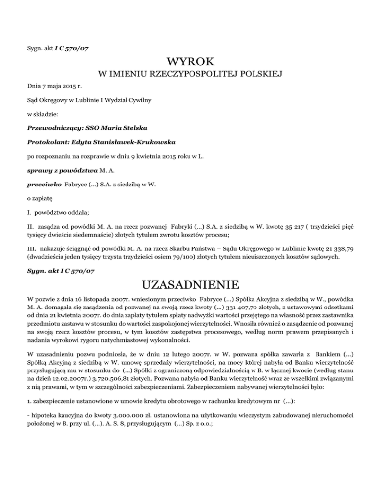 Sygn. akt I C 570/07 WYROK W IMIENIU RZECZYPOSPOLITEJ POLSKIEJ Dnia 7 maja 2015 r. Sąd Okręgowy w Lublinie I Wydział Cywilny w składzie: Przewodniczący: SSO Maria Stelska Protokolant: Edyta Stanisławek-Krukowska po rozpoznaniu na rozprawie w dniu 9 kwietnia 2015 roku w L. sprawy z powództwa M. A. przeciwko Fabryce (...) S.A. z siedzibą w W. o zapłatę I. powództwo oddala; II. zasądza od powódki M. A. na rzecz pozwanej Fabryki (...) S.A. z siedzibą w W. kwotę 35 217 ( trzydzieści pięć tysięcy dwieście siedemnaście) złotych tytułem zwrotu kosztów procesu; III. nakazuje ściągnąć od powódki M. A. na rzecz Skarbu Państwa – Sądu Okręgowego w Lublinie kwotę 21 338,79 (dwadzieścia jeden tysięcy trzysta trzydzieści osiem 79/100) złotych tytułem nieuiszczonych kosztów sądowych. Sygn. akt I C 570/07 UZASADNIENIE W pozwie z dnia 16 listopada 2007r. wniesionym przeciwko Fabryce (...) Spółka Akcyjna z siedzibą w W., powódka M. A. domagała się zasądzenia od pozwanej na swoją rzecz kwoty (...) 331 407,70 złotych, z ustawowymi odsetkami od dnia 21 kwietnia 2007r. do dnia zapłaty tytułem spłaty nadwyżki wartości przejętego na własność przez zastawnika przedmiotu zastawu w stosunku do wartości zaspokojonej wierzytelności. Wnosiła również o zasądzenie od pozwanej na swoją rzecz kosztów procesu, w tym kosztów zastępstwa procesowego, według norm prawem przepisanych i nadania wyrokowi rygoru natychmiastowej wykonalności. W uzasadnieniu pozwu podniosła, że w dniu 12 lutego 2007r. w W. pozwana spółka zawarła z Bankiem (...) Spółką Akcyjną z siedzibą w W. umowę sprzedaży wierzytelności, na mocy której nabyła od Banku wierzytelność przysługującą mu w stosunku do (...) Spółki z ograniczoną odpowiedzialnością w B. w łącznej kwocie (według stanu na dzień 12.02.2007r.) 3.720.506,81 złotych. Pozwana nabyła od Banku wierzytelność wraz ze wszelkimi związanymi z nią prawami, w tym w szczególności zabezpieczeniami. Zabezpieczeniem nabywanej wierzytelności było: 1. zabezpieczenie ustanowione w umowie kredytu obrotowego w rachunku kredytowym nr (...): - hipoteka kaucyjna do kwoty 3.000.000 zł. ustanowiona na użytkowaniu wieczystym zabudowanej nieruchomości położonej w B. przy ul. (...). A. S. 8, przysługującym (...) Sp. z o.o.; - weksel własny in blanco wystawiony przez (...) Sp. z o.o. poręczony przez (...) A. i M. A. do kwoty 500.000 zł., wraz z deklaracją wekslową; 2. zabezpieczenie ustanowione w umowie kredytu rewolwingowego nr (...): - hipoteka kaucyjna do kwoty 1.500.000 zł. ustanowiona na użytkowaniu wieczystym zabudowanej nieruchomości położonej w B. przy ul. (...). A. S. 8, przysługującym (...) Sp. z o.o.; - zastaw rejestrowy na rzeczach ruchomych stanowiących całość gospodarczą, o zmiennym składzie (wyroby gotowe – klosze i wazony) o wartości 1.334.401,04, wpisany w rejestrze zastawów pod nr (...); - weksel własny in blanco wystawiony przez (...) Sp. z o.o. wraz z deklaracją wekslową; - przelew na zabezpieczenie wierzytelności (...) Sp. z o.o. wobec (...) 10 CH-4460 (...) SWITZERLAND z tytułu umowy nr (...) z dnia 18 listopada 2003r. 3. zabezpieczenie ustanowione w ugodzie (...) z dnia 3 lutego 2005r.: - hipoteka kaucyjna do kwoty 3.500.000 zł. ustanowiona na użytkowaniu wieczystym zabudowanej nieruchomości położonej w A. przy ul. (...), przysługującym (...) Sp. z o.o. w A.; - zastaw rejestrowy na 22.512 udziałach w (...) Sp. z o.o. objętych przez M. A., o łącznej wartości nominalnej 11.256.000 zł., wpisany w rejestrze zastawów pod nr (...); 4. zabezpieczenie ustanowione w umowie kredytowej nr (...) kredytu inwestycyjnego w rachunku kredytowym: - hipoteka kaucyjna do kwoty 1.750.000 zł. ustanowiona na użytkowaniu wieczystym zabudowanej nieruchomości położonej w B. przy ul. (...). A. S.(...) przysługującym (...) Sp. z o.o.; - hipoteka kaucyjna do kwoty 1.000.000 zł. ustanowiona na użytkowaniu wieczystym zabudowanej nieruchomości położonej w A. przy ul. (...), przysługującym (...) Sp. z o.o. w A.; - zastaw rejestrowy na rzeczach ruchomych oznaczonych co do tożsamości (wiertarka pionowa typu M. B. o wartości 26.330 zł.), wpisany w rejestrze zastawów pod nr (...); - weksel własny in blanco wystawiony przez (...) Sp. z o.o. wraz z deklaracją wekslową. Po dokonanej transakcji zakupu wierzytelności pozwana dokonała zmian w księgach wieczystych oraz rejestrze zastawów wpisując siebie jako wierzyciela (...) Sp. z o.o. w miejsce dotychczasowego wierzyciela. W celu zaspokojenia nabytej wierzytelności w pełnej wysokości, mogła, według własnego uznania, realizować swoją wierzytelność ze wszystkich ustanowionych na jej rzecz zabezpieczeń. W dniu 29 marca 2007 r. pozwana skierowała do M. A. pismo, w którym zawiadomiła, iż „stosownie do art. 25 ustawy z dnia 06 grudnia 1996r. o zastawie rejestrowym i rejestrze zastawów, zamierza podjąć działania zmierzające do zaspokojenia swoich roszczeń, wynikające z zastawu rejestrowego, poprzez przejęcie 22.512 udziałów M. A. w spółce (...) Sp. z o.o., stosownie do pkt. 10 ust. 2 umowy z dnia 28.10.2005r…”. Zgodnie z umową o ustanowieniu zastawu rejestrowego na udziałach w spółce z dnia 28 października 2005r., M. A. ustanowiła na rzecz Banku (...) S.A. zastaw rejestrowy na swoich 22.512 udziałach w Spółce (...), o wartości nominalnej 500 zł. każdy i o łącznej wartości 11.256.000 zł., a Bank ten zastaw przyjął (pkt. 3 umowy). Umowa przewidywała też możliwość zaspokojenia się przez wierzyciela z przedmiotu zastawu, według jego wyboru ( pkt. 10 umowy) w trybie sądowego postępowania egzekucyjnego, przez przejęcie przedmiotu zastawu na własność, albo przez sprzedaż przedmiotu zastawu w drodze przetargu publicznego przeprowadzonego przez notariusza lub komornika. W odpowiedzi na pismo pozwanej, powódka M. A. złożyła pozwanej propozycję dotyczącą u