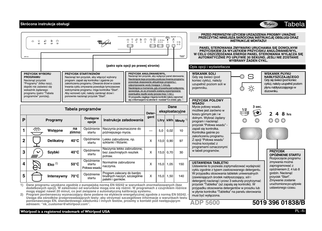 Tabela Skrócona instrukcja obsługi PRZED PIERWSZYM UŻYCIEM URZĄDZENIA PROSIMY UWAŻNIE PRZECZYTAĆ NINIEJSZĄ SKRÓCONĄ INSTRUKCJĘ OBSŁUGI ORAZ INSTRUKCJE MONTAŻU! PANEL STEROWANIA ZMYWARKI URUCHAMIA SIĘ DOWOLNYM PRZYCISKIEM ZA WYJĄTKIEM PRZYCISKU ANULOWANIE/WYŁ. W CELU OSZCZĘDZANIA ENERGII PANEL STEROWANIA WYŁĄCZA SIĘ AUTOMATYCZNIE PO UPŁYWIE 30 SEKUND, JEŚLI NIE ZOSTANIE WYBRANY ŻADEN CYKL. (patrz opis opcji po prawej stronie) PRZYCISK WYBORU PROGRAMU Nacisnąć przycisk “Programy” (kilka razy), dopóki nie zaświeci się wskaźnik żądanego programu (patrz “Tabela programów” poniżej). PRZYCISK START/WZNÓW Nacisnąć ten przycisk, aby włączyć wybrany program: zapali się kontrolka i zgaśnie po zakończeniu programu. Otwarcie drzwi w czasie trwania cyklu zmywania powoduje tymczasowe wstrzymanie programu: miga kontrolka “Start”. Aby wznowić cykl, należy zamknąć drzwi i ponownie nacisnąć przycisk “Start”. PRZYCISK ANULOWANIE/WYŁ. Nacisnąć ten przycisk, aby wyłączyć panel sterowania. Naciśnięcie tego przycisku podczas trwania programu powoduje skasowanie aktualnego programu i odpompowanie wody trwające 1 minutę. Naciśnięcie w momencie, gdy zmywarka jest wyłączona, spowoduje, że ze zmywarki zostaną wypompowane ewentualne resztki wody (proces trwa 1 min.). W przypadku ciągłego migania kontrolki należy zapoznać się z informacjami na stronie 6 - rozdział “Co zrobić, gdy...”. Tabela programów Dostępne opcje P Programy 1 Wstępne 2 Delikatny 40°C 3 Szybki 40°C 4 Eko 2) 5 Intensywny 70°C Opis opcji i wyświetlacza Instrukcje załadowania Opóźnienie Naczynia przeznaczone do na startu późniejszego mycia. zimno Opóźnienie Lekko zabrudzone, np. szklanki i filiżanki. startu Naczynia lekko zabrudzone, Opóźnienie bez zaschniętych resztek startu potraw. Opóźnienie Normalnie zabrudzone startu 50°C naczynia. Połowa wsadu Opóźnienie Program zalecany do bardzo brudnych naczyń, szczególnie startu patelni i garnków. Detergent Dane eksploatacyjne Litry kWh Minuty 1) — 5,0 0,02 10 X 13,0 0,90 97 X 13,0 0,70 30 X 15,0 1,05 150 X 15,0 1,50 140 1) Dane programu uzyskano zgodnie z europejską normą EN 50242 w warunkach znormalizowanych (bez dodatkowych opcji). W zależności od warunków mogą one się różnić. W programach z czujnikiem różnice mogą sięgać nawet 20 minut, co jest związane z automatyczną kalibracją systemu. 2) Program porównawczy wyznaczający dane podane na etykiecie energetycznej zgodnie z normą EN 50242. Uwaga dla ośrodków przeprowadzających testy: aby otrzymać szczegółowe informacje o warunkach testu porównawczego EN, standardowego załadunku i innych testów, prosimy o kontakt pod następującym adresem: “[email protected]”. WSKANIK SOLI Gdy się świeci (pod koniec cyklu), należy uzupełnić poziom soli w pojemniku. WSKANIK PŁYNU NABŁYSZCZAJĄCEGO Gdy się świeci (pod koniec cyklu), należy uzupełnić poziom płynu nabłyszczającego w dozowniku. PRZYCISK POŁOWY WSADU Mycie połowy wsadu możliwe jest zarówno w koszu górnym jak i w dolnym. Wybrać żądany program i nacisnąć przycisk “Połowa wsadu” zapali się kontrolka. Kontrolka gaśnie po zakończeniu programu. Z opcji “Połowa wsadu” można korzystać z programami oznaczonymi w tabeli programów. USTAWIENIA TABLETKI Ustawienie to pozwala zoptymalizować wydajność cyklu zgodnie z typem zastosowanego detergentu. W przypadku stosowania tabletek uniwersalnych (zawierających środek nabłyszczający, sól i detergent) nacisnąć i przez 3 sekundy przytrzymać przycisk “Tabletka” (aż zapalą się kontrolki). W przypadku stosowania detergentów w proszku lub w płynie kontrolka “Tabletka” na panelu sterowania musi być wyłączona. ADP 5600 PRZYCISK OPÓźNIENIE STARTU Rozpoczęcie programu zmywania można zaprogramować z opóźnieniem 2, 4 lub 8 godzin. Nacisnąć przycisk “Start”. Zmywanie zostanie uruchomione po upływie ustawionego czasu. 5019 396 01838/B PL -1- Pierwsze użycie Prawidłowa regulacja ustawienia twardości wody w celu zapewnienia optymalnych wyników zmywania Stopień twardości wody powinno się ustawiać przez pierwszym zmywaniem lub jeśli się on zmienił. - Jednocześnie nacisnąć i przez co najmniej 3 sekundy przytrzymać przyciski Programy oraz ANULOWANIE/WYŁ. Diody programów pokażą ustawienie stopnia twardości wody. Nacisnąć przycisk Programy, aby zwiększyć ustawienie (po osiągnięciu poziomu 7 kolejne naciśnięcie przycisku powoduje przejście do poziomu 1). Odczekać 30 sekund (panel sterowania wyłączy się) lub nacisnąć przycisk START/Wznów, aby zapisać ustawienie. - 1. Zasięgnąć informacji o stopniu twardości wody w miejskich zakładach wodociągowych ... Stopnie niemieckie °dH Stopnie francuskie °fH Stopnie angielskie °eH 0-5 0-9 0 - 6,3 Poziom twardości wody Miękka 1 6 - 10 10 - 18 7 - 12,6 Średnia 2 11 - 15 19 - 27 13,3 - 18,9 Umiarkowana 3 16 - 21 28 - 37 19,6 - 25,9 Średnio twarda 4 22 - 28 38 - 50 26,6 - 35 Twarda 5 29 - 35 51 - 63 35,7 - 44,1 Bardzo twarda 6 36 - 60 64 - 107 44,8 - 74,9 Wyjątkowo twarda 7 2. ...wprowadzić wartość Sugestie dotyczące stosowania detergentów do zmywarki 3 pierwsze diody Żel lub proszek PROGRAMU zapalają (płyn Tabletki się na panelu (patrz tabela programów) nabłyszczający i sól) P1 P2 P3 przejść do kroku 1 (patrz “Codzienna kontrola”) Poziom twardości wody jest ustawiony fabrycznie na 4 (średnio-twarda). Nawet jeśli stosowane tabletki zawierają sól, należy wciąż stosować sól, ponieważ takie detergenty nie są wystarczające do zmiękczania twardej wody. jeśli woda jest TWARDA, należy dodać więcej soli (przejść do kroku 1, “Codzienna kontrola”) Po pierwszym użyciu należy napełnić zbiornik soli niezależnie od poziomu twardości wody (patrz opis poniżej w kroku 1 “Codzienna kontrola”). Napełnianie pojemnika na sól - Rozpuszczanie kamienia (nie j