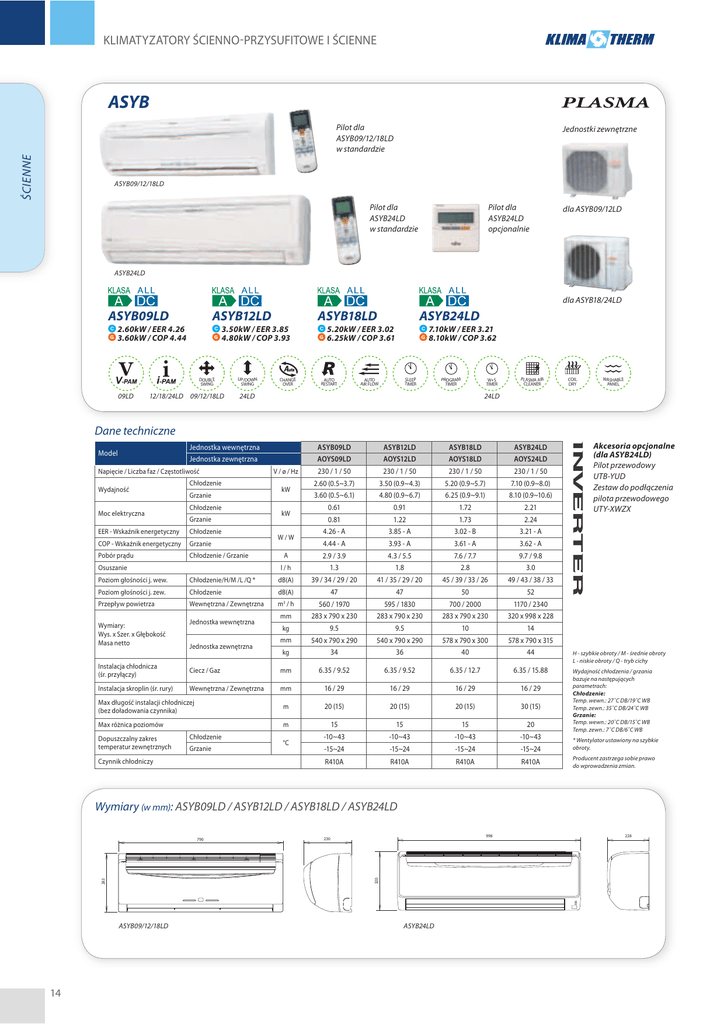 KLIMATYZATORY ŚCIENNO-PRZYSUFITOWE I ŚCIENNE ASYB ŚCIENNE Pilot dla ASYB09/12/18LD w standardzie Jednostki zewnętrzne ASYB09/12/18LD Pilot dla ASYB24LD w standardzie Pilot dla ASYB24LD opcjonalnie dla ASYB09/12LD ASYB24LD dla ASYB18/24LD ASYB09LD ASYB12LD 2.60kW / EER 4.26 3.60kW / COP 4.44 3.50kW / EER 3.85 4.80kW / COP 3.93 DOUBLE SWING 09LD ASYB18LD 12/18/24LD 09/12/18LD UP/DOWN SWING CHANGE OVER ASYB24LD 5.20kW / EER 3.02 6.25kW / COP 3.61 AUTO RESTART 7.10kW / EER 3.21 8.10kW / COP 3.62 SLEEP TIMER AUTO AIR FLOW PROGRAM TIMER W+S TIMER 24LD PLASMA AIR CLEANER COIL DRY WASHABLE PANEL 24LD Dane techniczne Model Jednostka wewnętrzna ASYB09LD ASYB12LD ASYB18LD ASYB24LD Jednostka zewnętrzna AOYS09LD AOYS12LD AOYS18LD AOYS24LD Napięcie / Liczba faz / Częstotliwość Wydajność Moc elektryczna Chłodzenie Grzanie Chłodzenie Grzanie EER - Wskaźnik energetyczny Chłodzenie COP - Wskaźnik energetyczny Grzanie Pobór prądu Chłodzenie / Grzanie Osuszanie V / ø / Hz kW kW W/W 230 / 1 / 50 230 / 1 / 50 230 / 1 / 50 230 / 1 / 50 2.60 (0.5~3.7) 3.50 (0.9~4.3) 5.20 (0.9~5.7) 7.10 (0.9~8.0) 3.60 (0.5~6.1) 4.80 (0.9~6.7) 6.25 (0.9~9.1) 8.10 (0.9~10.6) 0.61 0.91 1.72 2.21 0.81 1.22 1.73 2.24 4.26 - A 3.85 - A 3.02 - B 3.21 - A 4.44 - A 3.93 - A 3.61 - A 3.62 - A 9.7 / 9.8 A 2.9 / 3.9 4.3 / 5.5 7.6 / 7.7 l/h 1.3 1.8 2.8 3.0 dB(A) 39 / 34 / 29 / 20 41 / 35 / 29 / 20 45 / 39 / 33 / 26 49 / 43 / 38 / 33 Poziom głośności j. wew. Chłodzenie/H/M /L /Q * Poziom głośności j. zew. Chłodzenie dB(A) 47 47 50 52 Przepływ powietrza Wewnętrzna / Zewnętrzna m3 / h 560 / 1970 595 / 1830 700 / 2000 1170 / 2340 Jednostka wewnętrzna mm 283 x 790 x 230 283 x 790 x 230 283 x 790 x 230 320 x 998 x 228 Wymiary: Wys. x Szer. x Głębokość Masa netto kg 9.5 9.5 10 14 mm 540 x 790 x 290 540 x 790 x 290 578 x 790 x 300 578 x 790 x 315 kg 34 36 40 44 Jednostka zewnętrzna Instalacja chłodnicza (śr. przyłączy) Ciecz / Gaz mm 6.35 / 9.52 6.35 / 9.52 6.35 / 12.7 6.35 / 15.88 Instalacja skroplin (śr. rury) Wewnętrzna / Zewnętrzna mm 16 / 29 16 / 29 16 / 29 16 / 29 Max długość instalacji chłodniczej (bez doładowania czynnika) m 20 (15) 20 (15) 20 (15) 30 (15) Max różnica poziomów m Dopuszczalny zakres temperatur zewnętrznych Chłodzenie Grzanie Czynnik chłodniczy °C 15 15 15 20 -10~43 -10~43 -10~43 -10~43 -15~24 -15~24 -15~24 -15~24 R410A R410A R410A R410A Akcesoria opcjonalne (dla ASYB24LD) Pilot przewodowy UTB-YUD Zestaw do podłączenia pilota przewodowego UTY-XWZX H - szybkie obroty / M - średnie obroty L - niskie obroty / Q - tryb cichy Wydajność chłodzenia / grzania bazuje na następujących parametrach: Chłodzenie: Temp. wewn.: 27˚C DB/19˚C WB Temp. zewn.: 35˚C DB/24˚C WB Grzanie: Temp. wewn.: 20˚C DB/15˚C WB Temp. zewn.: 7˚C DB/6˚C WB * Wentylator ustawiony na szybkie obroty. Producent zastrzega sobie prawo do wprowadzenia zmian. Wymiary (w mm): ASYB09LD / ASYB12LD / ASYB18LD / ASYB24LD 283 ASYB09/12/18LD 14 998 230 320 790 ASYB24LD 228 KLIMATYZATORY ŚCIENNO-PRZYSUFITOWE I ŚCIENNE Unikalny moduł filtra plazmowego efektywnie oczyszcza powietrze w pomieszczeniu Filtr plazmowy jest zamontowany wewnątrz jednostki. Najdrobniejsze cząsteczki kurzu są zatrzymywane przez filtr elektrostatyczny, a nieprzyjemne zapachy zostają zneutralizowane za pomocą jonów ujemnych. Dzięki zastosowaniu filtra o niższych oporach przepływu powietrza, w odniesieniu do dotychczas montowanych w jednostkach klimatyzacyjnych, osiągnięty został lepszy wskaźnik przepływu powietrza oraz wyższa sprawność neutralizacji zanieczyszczeń. Pole elektryczne Filtr plazmowy Ozonowanie Filtr plazmowy generuje jony i ozon, które wspomagają proces neutralizacji nieprzyjemnych zapachów i dymu papierosowego. Siatka filtracyjna Filtr elektrostatyczny Ujemnie naładowane cząsteczki kurzu itp. przyciągane są do uziemionej siatki, gromadzone na powierzchni filtra oczyszczającego i usuwającego nieprzyjemne zapachy. Proces wykroplenia Po zakończeniu pracy urządzenia uaktywnienie na pilocie funkcji COIL DRY (osuszanie wymiennika) uruchamia proces szybkiego schłodzenia wnętrza jednostki i wkroplenie całej wilgoci zawartej w powietrzu. Proces odparowania wilgoci Strumienie gorącego powietrza odparowują wykroploną wilgoć (osuszają wnętrze urządzenia). Funkcja aktywna jest przez około 15 minut. Zakres usuwania zanieczyszczeń: kurz, sierść i łupież zwierzęcy, dym papierosowy, roztocza, zarodniki pleśni, pyłki. Zakres usuwania zapachów: zapach dymu papierosowego, zapach zwierząt, woń odpadków kuchennych, pot i zapach ciała. stopień zanieczyszczenia [%] Klimatyzatory ścienne z serii ASYB wyposażone są w funkcję osuszania wnętrza urządzenia. Usuwanie wilgoci z jednostki skutecznie chroni urządzenie i pomieszczenie przed rozwojem niebezpiecznych bakterii, pleśni i grzybów. Proces oczyszczania klimatyzatora realizowany jest automatycznie. Skuteczność filtra plazmowego 100 Skuteczność usuwania zanieczyszczeń Dym papierosowy 80 60 40 60 50 40 0 5 10 15 20 25 30 czas [minuty] stopień zanieczyszczenia [%] Czyste urządzenie = czyste pomieszczenie 100 Metoda badań: JEM 1417; Pomieszczenie: 30 m3, szczelnie zaizolowane; Warunki pomiarowe: Dym papierosowy (5 papierosów palonych jednocześnie) Skuteczność usuwania nieprzyjemnych zapachów Kwas octowy 80 60 40 Metoda badań: JEM 1467 Pomieszczenie: 1 m3, szczelny pojemnik zaizolowany silikonem akrylowym 60 50 40 0 5 10 15 20 25 30 Skuteczność filtra plazmowego Moduł filtra plazmowego eliminuje bakterie oraz usuwa nieprzyjemne zapachy. Funkcja aktywna jest przez około 15 minut. stopień zanieczyszczenia [%] czas [minuty] Skuteczność usuwania nieprzyjemnych zapachów Amoniak 100 80 60 40 Metoda badań: JEM 1467 Pomieszczenie: 1 m3, szczelny pojemnik zaizolowany silikonem akrylowym 20 0 0 5 10 15 20 25 30 czas [minuty] 15 KLIMATYZATORY ŚCIENNO-PRZYSUFITOWE I ŚCIENNE ASYA Jednostki zewnętrzne ŚCIENNE Pilot bezprze