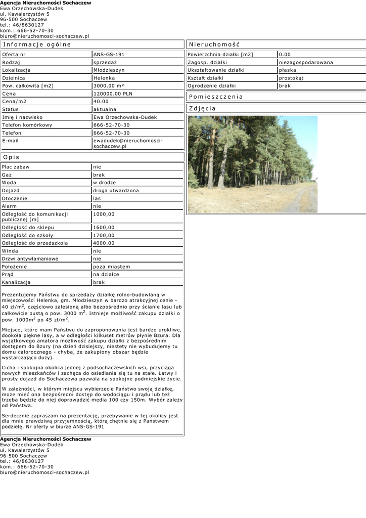 Agencja Nieruchomości Sochaczew Ewa Orzechowska-Dudek ul. Kawalerzystów 5 96-500 Sochaczew tel.: 46/8630127 kom.: 666-52-70-30 [email protected] Informacje ogólne Nieruchomość Oferta nr ANS-GS-191 Powierzchnia działki [m2] 0.00 Rodzaj sprzedaż Zagosp. działki niezagospodarowana Lokalizacja Młodzieszyn Ukształtowanie działki płaska Dzielnica Helenka Kształt działki prostokąt Pow. całkowita [m2] 3000.00 m² Ogrodzenie działki brak Cena 120000.00 PLN Cena/m2 40.00 Status aktualna Imię i nazwisko Ewa Orzechowska-Dudek Telefon komórkowy 666-52-70-30 Telefon 666-52-70-30 E-mail [email protected] Opis Plac zabaw nie Gaz brak Woda w drodze Dojazd droga utwardzona Otoczenie las Alarm nie Odległość do komunikacji publicznej [m] 1000,00 Odległość do sklepu 1600,00 Odległość do szkoły 1700,00 Odległość do przedszkola 4000,00 Winda nie Drzwi antywłamaniowe nie Położenie poza miastem Prąd na działce Kanalizacja brak Prezentujemy Państwu do sprzedaży działkę rolno-budowlaną w miejscowości Helenka, gm. Młodzieszyn w bardzo atrakcyjnej cenie 40 zł/m2, częściowo zalesioną albo bezpośrednio przy ścianie lasu lub całkowicie pustą o pow. 3000 m2. Istnieje możliwość zakupu działki o pow. 1000m2 po 45 zł/m2. Miejsce, które mam Państwu do zaproponowania jest bardzo urokliwe, dookoła piękne lasy, a w odległości kilkuset metrów płynie Bzura. Dla wyjątkowego amatora możliwość zakupu działki z bezpośrednim dostępem do Bzury (na dzień dzisiejszy, niestety nie wybudujemy tu domu całorocznego - chyba, że zakupiony obszar będzie wystarczająco duży). Cicha i spokojna okolica jednej z podsochaczewskich wsi, przyciąga nowych mieszkańców i zachęca do osiedlania się tu na stałe. Łatwy i prosty dojazd do Sochaczewa pozwala na spokojne podmiejskie życie. W zależności, w którym miejscu wybierzecie Państwo swoją działkę, może mieć ona bezpośredni dostęp do wodociągu i prądu lub też trzeba będzie do niej doprowadzić media 100 czy 150m. Wybór zależy od Państwa. Serdecznie zapraszam na prezentację, przebywanie w tej okolicy jest dla mnie prawdziwą przyjemnością, którą chętnie się z Państwem podzielę. Nr oferty w biurze ANS-GS-191 Agencja Nieruchomości Sochaczew Ewa Orzechowska-Dudek ul. Kawalerzystów 5 96-500 Sochaczew tel.: 46/8630127 kom.: 666-52-70-30 [email protected] Pomieszczenia Zdjęcia
