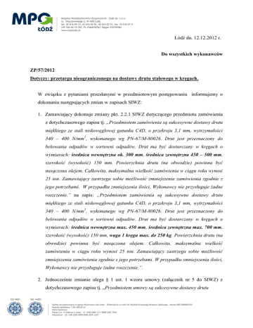 Łódź dn. 12.12.2012 r. Do wszystkich wykonawców ZP/57/2012 Dotyczy: przetargu nieograniczonego na dostawy drutu stalowego w kręgach. W związku z pytaniami przesłanymi w przedmiotowym postępowaniu informujemy o dokonaniu następujących zmian w zapisach SIWZ: 1. Zamawiający dokonuje zmiany pkt. 2.2.1 SIWZ dotyczącego przedmiotu zamówienia z dotychczasowego zapisu tj. „Przedmiotem zamówienia są sukcesywne dostawy drutu miękkiego ze stali niskowęglowej gatunku C4D, o przekroju 3,1 mm, wytrzymałości 340 – 400 N/mm2, wykonanego wg PN-67/M-80026. Drut jest przeznaczony do belowania odpadów w sortowni odpadów. Drut ma być dostarczany w kręgach o wymiarach: średnica wewnętrzna ok. 300 mm, średnica zewnętrzna 450 – 500 mm, szerokość (wysokość) 150 mm. Powierzchnia drutu (na obwodzie) powinna być nasączona olejem. Całkowita, maksymalna wielkość zamówienia w ciągu roku wynosi 25 ton. Zamawiający zastrzega sobie możliwość zmniejszenia zamówienia zgodnie z jego potrzebami. W przypadku zmniejszenia ilości, Wykonawcy nie przysługuje żadne roszczenie.” na zapis: „Przedmiotem zamówienia są sukcesywne dostawy drutu miękkiego ze stali niskowęglowej gatunku C4D, o przekroju 3,1 mm, wytrzymałości 340 – 400 N/mm2, wykonanego wg PN-67/M-80026. Drut jest przeznaczony do belowania odpadów w sortowni odpadów. Drut ma być dostarczany w kręgach o wymiarach: średnica wewnętrzna max. 450 mm, średnica zewnętrzna max. 700 mm, szerokość (wysokość) 150 mm, waga 1 kręgu max. do 250 kg. Powierzchnia drutu (na obwodzie) powinna być nasączona olejem. Całkowita, maksymalna wielkość zamówienia w ciągu roku wynosi 25 ton. Zamawiający zastrzega sobie możliwość zmniejszenia zamówienia zgodnie z jego potrzebami. W przypadku zmniejszenia ilości, Wykonawcy nie przysługuje żadne roszczenie.”. 2. Jednocześnie zmianie ulega § 1 ust. 1 wzoru umowy (załącznik nr 5 do SIWZ) z dotychczasowego zapisu tj. „Przedmiotem umowy są sukcesywne dostawy drutu miękkiego ze stali niskowęglowej gatunku C4D, o przekroju 3,1 mm, wytrzymałości 340 – 400 N/mm2, wykonanego wg PN-67/M-80026. Drut jest przeznaczony do belowania odpadów w sortowni odpadów. Drut ma być dostarczany w kręgach o wymiarach: średnica wewnętrzna ok. 300 mm, średnica zewnętrzna 450 – 500 mm, szerokość (wysokość) 150 mm. Powierzchnia drutu (na obwodzie) powinna być nasączona olejem.” na zapis: „Przedmiotem umowy są sukcesywne dostawy drutu miękkiego ze stali niskowęglowej gatunku C4D, o przekroju 3,1 mm, wytrzymałości 340 – 400 N/mm2, wykonanego wg PN-67/M-80026. Drut jest przeznaczony do belowania odpadów w sortowni odpadów. Drut ma być dostarczany w kręgach o wymiarach: średnica wewnętrzna max. 450 mm, średnica zewnętrzna max. 700 mm, szerokość (wysokość) 150 mm, waga 1 kręgu max. do 250 kg. Powierzchnia drutu (na obwodzie) powinna być nasączona olejem.” Informujemy, że w związku z ww. zmianą SIWZ Zamawiający przesuwa termin składania ofert z 14.12.2012 r. godz. 10:00 na 18.12.2012 r. godz. 11:00 oraz termin otwarcia ofert z 14.12.2012 r. godz. 10:30 na 18.12.2012 r. godz. 11:30.