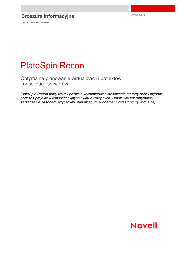 Broszura informacyjna www.novell.pl ZARZĄDZANIE ZASOBAMI IT PlateSpin Recon Optymalne planowanie wirtualizacji i projektów konsolidacji serwerów PlateSpin Recon firmy Novell pozwala wyeliminować stosowanie metody prób i błędów podczas projektów konsolidacyjnych i wirtualizacyjnych. Umożliwia też optymalne zarządzanie zasobami fizycznymi stanowiącymi fundament infrastruktury wirtualnej. str. 2 PlateSpin Recon: przejrzysty obraz centrum danych Osiągnięcie maksimum zwrotu z inwestycji we wdrożenie rozwiązań wirtualizacyjnych wymaga poprzedzenia ich starannym planowaniem. To jednak nie wszystko. Ponieważ wykorzystanie zasobów zmienia się w czasie, dla zachowania optymalnej wydajności niezbędna jest regularna ocena sytuacji i skuteczne zarządzanie. PlateSpin Recon firmy Novell to wyrafinowane narzędzie umożliwiające analizowanie, planowanie oraz zarządzanie obciążeniami (procesami uruchamianymi na serwerach), zapewniające bezprecedensowy poziom optymalizacji centrum danych. PlateSpin Recon wyróżnia się możliwością obsługi różnorodnych platform. Zbiera dane o posiadanej infrastrukturze IT oraz poziomie wykorzystania jej przez poszczególne systemy i aplikacje. Następnie PlateSpin Recon udostępnia przejrzysty obraz całości zasobów zgromadzonych w serwerowni czy centrum danych oraz działających tam usług, łącznie z danymi o sposobie i czasie wykorzystania zasobów. PlateSpin Recon pozwala zrezygnować z metody prób i błędów podczas projektów konsolidacyjnych i planowania wirtualizacji, pozwala też skutecznie zarządzać zasobami fizycznymi stanowiącymi fundament infrastruktury wirtualnej oraz wiążącymi się z jej eksploatacją kosztami. Rysunek 1. PlateSpin Recon udostępnia mechanizmy zaawansowanego modelowania scenariuszy, badania trendów, prognozowania i planowania, pozwalając zrezygnować z metody prób i błędów podczas zarządzania centrum danych. Skuteczne funkcje modelowania wariantowego pozwalają określić optymalne kombinacje sprzętu i serwerów wirtualnych, zapewniające maksymalne wykorzystanie zasobów. Najważniejsze korzyści PlateSpin Recon odznacza się szerokimi możliwościami obsługi platform Windows, Linux i UNIX oraz skalowalnością umożliwiającą zastosowanie go nawet w największych centrach danych. Dlatego stanowi prawdziwie korporacyjne narzędzie do analizowania, planowania i zarządzania obciążeniami serwerów fizycznych i wirtualnych. str. 3 Optymalna konsolidacja dzięki kompleksowemu profilowaniu obciążeń Dotychczas osoby zarządzające centrami danych zazwyczaj zmuszone były do posługiwania się intuicją przy znajdowaniu niedostatecznie obciążonych serwerów fizycznych i wirtualnych oraz przydzielaniu zasobów zgodnie z bieżącymi i przyszłymi potrzebami. Zawarty w PlateSpin Recon unikalny mechanizm profilowania obciążeń śledzi na bieżąco rzeczywiste wykorzystanie procesorów, dysków, pamięci i sieci dla serwerów fizycznych i wirtualnych. Każde obciążenie i każdy serwer wirtualny ma okresowe szczyty i spadki wykorzystania zasobów, zaś PlateSpin Recon jest w stanie tworzyć scenariusze konsolidacji z uwzględnieniem tych fluktuacji. Możliwość ta minimalizuje konflikty zasobów i zapewnia większą skuteczność w projektach konsolidacji, niż w przypadku podejść opartych jedynie na pojedynczych obrazach migawkowych lub rejestrowaniu szczytowego wykorzystania. Większy stopień konsolidacji oznacza zaś lepsze wykorzystanie i dłuższą eksploatację posiadanego sprzętu oraz mniejsze zapotrzebowanie na zakupy nowych serwerów. Pełne wykorzystanie infrastruktury wirtualnej Brak skutecznego zarządzania może prowadzić do gwałtownego wzrostu liczby maszyn wirtualnych i w konsekwencji do złego wykorzystania zasobów. Mechanizmy zarządzania potencjałem środowiska wirtualnego zawarte w PlateSpin Recon odnajdują niewykorzystane zasoby zwirtualizowanych środowisk informatycznych nawet wtedy, gdy platformy wirtualizacyjne wykazują stuprocentowe przydzielenie zasobów. PlateSpin Recon udostępnia informacje o rzeczywistym wykorzystaniu zasobów i umożliwia odzyskanie oraz powtórne przydzielenie zasobów – nowym maszynom wirtualnym lub maszynom wirtualnym wymagającym zwiększenia przydzielonych zasobów – pozwalając odsunąć w czasie konieczność zakupu nowego sprzętu i przedłużając okres eksploatacji posiadanych zasobów. Wierny obraz środowiska IT składającego się z różnych platform PlateSpin Recon zapewnia obsługę platform Windows, Linux i UNIX oraz skalowalność umożliwiającą zastosowanie nawet w największych centrach danych. Duże firmy na pewno zainteresuje możliwość agregacji danych z wielu źródeł tworzonych przez PlateSpin Recon w celu zgromadzenia ich w centralnej hurtowni danych, analizowania i wykorzystania przy planowaniu. W połączeniu z oferowanym przez Novella wieloplatformowym narzędziem do migracji obciążeń PlateSpin Migrate przedsiębiorstwa zyskują całościowe rozwiązanie umożliwiające sprawną eksploatację centrów danych. Rysunek 2. PlateSpin Recon udostępnia konfigurowalny mechanizm graficznego raportowania. Wspomaga on zarządzanie obciążeniami i wykorzystaniem zasobów. Prezentuje informacje podsumowujące liczbę i zakres obciążeń serwerów, zapotrzebowanie na zasilanie i chłodzenie, inne szczegółowe dane – wszystko to w postaci tabel lub wykresów czasowych. str. 4 Najważniejsze cechy Zdalne gromadzenie danych. PlateSpin Recon zdalnie gromadzi informacje o elementach infrastruktury IT i ich wydajności, tym samym eliminuje konieczność ich ręcznego zbierania. PlateSpin Recon wyposażony jest w jednokrotnie uruchamiany mechanizm wykrywania serwerów, gromadzący szczegółowe dane na temat zasobów sprzętowych w serwerowni czy centrum danych, zaś do zbierania danych o wydajności wykorzystywane są standardowe funkcje raportujące systemów operacyjnych. Można również bezpośre