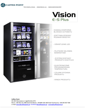 TECHNOLOGIA - INNOWACJA - NIEZAWODNOŚĆ - WANDALOODPORNA BLOKADA AUTOMATU - ZOPTYMALIZOWANY ROZMIAR MASZYNY - OŚWIETLENIE LED - PŁATNOŚĆ BILONEM, BANKNOTAMI - SYSTEM DOSTAWY PRODUKTU EASYFLEX - ELEKTRONICZNIE PROGRAMOWANA TEMPERATURA - CZUJNIK WYDANIA PRODUKTU - WINDA PRODUKTU Caffee Point 03-303 Warszawa ul. Jagiellońska 67A Biuro: +48 502 151 388 Dział Handlowy: +48 884 320 180 Dział Techniczny: +48 505 067 938 e-mail: [email protected] [email protected] [email protected] TECHNOLOGIA - INNOWACJA - NIEZAWODNOŚĆ VISION ES PLUS Moduły Vision ES Plus pozwalają na istotny wzrost liczby kanałów i pojemność urządzenia, aby pomieścić praktycznie każdy produkt (narzędzia, dużą elektronikę, oraz standardowe „snaki” wraz z napojami ...). Posiada 8 tac do 10 kanałów . Maszyna Vision ES Plus współpracuje z każda maszyną Master z gamy produktów firmy Jofemar gdzie usytuowane są systemy sterowania oraz systemy płatności. Największą funkcjonalność moduł uzyskuje przy współpracy z kioskiem multimedialnym, w takim przypadku istnieje możliwość podłączenia do czterech urządzeń do MSK, w którym odbywa się całe sterowanie oraz podłączone są systemy płatności. Taki system pozwala na użycie automatów w każdej branży oraz sprzedaż dowolnego produktu . . CECHY Temperatura: z lub bez modułu chłodzenia ( ustawiana elektronicznie do 5 C) Pojemność do 8 tac do 10 kanałów regulowanej wysokości. FIFO (First In First Out). Kontrola terminu produktu Detekcja poprawnego sprzedaż przez fotokomórki Oświetlenie diodami LED programowania systemu Przód Transparent 1169 x 714 mm. Auto test ciągłej pracy. Programowalne systemy bezpieczeństwa, które zapobiegają sprzedaży produktów nie nadające się do spożycia, Pamięć ustawień, zmieniając pozycję kanałów i partycji bez użycia narzędzi. Ciąg silników programowalnych Każdy kanał z urządzeniem głównym. Zasilanie: 230 V, 50 Hz Caffee Point 03-303 Warszawa ul. Jagiellońska 67A Biuro: +48 502 151 388 Dział Handlowy: +48 884 320 180 Dział Techniczny: +48 505 067 938 e-mail: [email protected] [email protected] [email protected] TECHNOLOGIA - INNOWACJA - NIEZAWODNOŚĆ DANE TECHNICZNE VISION ES Plus Temperatura Maksymalna pojemność Winda produktu Wymiary Waga Zasilanie Ustawiana elektronicznie do 5 C Do 8 tac po 10 kanałów Tak 1830 x 803 x 970 mm 325 kg. 230v.50 Hz OPCJA Instalacja kluczy dostępowych JOFEMAR Montaż zewnętrznych kuchenek mikrofalowych Montaż interfejsu komunikacyjnego on-line Montaż wandaloodpornego wlotu monet Caffee Point 03-303 Warszawa ul. Jagiellońska 67A Biuro: +48 502 151 388 Dział Handlowy: +48 884 320 180 Dział Techniczny: +48 505 067 938 e-mail: [email protected] [email protected] [email protected]