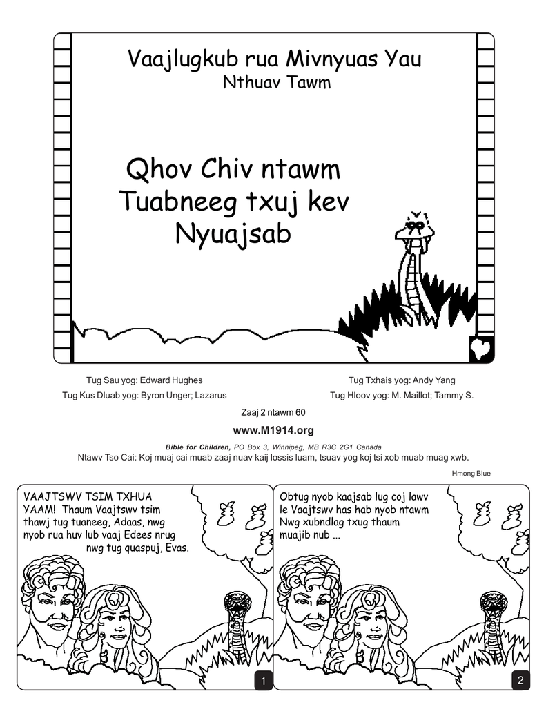 Vaajlugkub rua Mivnyuas Yau Nthuav Tawm Qhov Chiv ntawm Tuabneeg txuj kev Nyuajsab Tug Sau yog: Edward Hughes Tug Txhais yog: Andy Yang Tug Kus Dluab yog: Byron Unger; Lazarus Tug Hloov yog: M. Maillot; Tammy S. Zaaj 2 ntawm 60 www.M1914.org Bible for Children, PO Box 3, Winnipeg, MB R3C 2G1 Canada Ntawv Tso Cai: Koj muaj cai muab zaaj nuav kaij lossis luam, tsuav yog koj tsi xob muab muag xwb. Hmong Blue VAAJTSWV TSIM TXHUA YAAM! Thaum Vaajtswv tsim thawj tug tuaneeg, Adaas, nwg nyob rua huv lub vaaj Edees nrug nwg tug quaspuj, Evas. Obtug nyob kaajsab lug coj lawv le Vaajtswv has hab nyob ntawm Nwg xubndlag txug thaum muajib nub ... 1 2 “Puas yog Vaajtswv txwv kuam meb tsi xob noj txhua yaam ntxiv ntoo?” tug naab nug Evas. “Wb yeej noj tau txhua yaam txiv ntoo tshwj ib tso xwb,” tug quaspuj teb. “Yog has tas wb noj lossis kov tsob txiv ntawd, wb yuav tuag.” “Meb yuav tsi tuag,” tug naab luag chim ntsuav. “Meb yuav zoo le Vaajtswv.” Evas txawm xaav noj tsob txiv ntawd. Nwg cale noog tug naab lug hab noj tsob txiv. 3 4 Tomqaab Evaas tsi noog Vaajtswv lug lawm nwg ntxag Adaas noj tsob txiv ntawd hab. Tsimnyog kws Adaas yuavtsum has tas, “Tsi yog! Kuv yuav tsi tawmtsaam Vaajtswv cov Lug.” 5 Thaum Adaas hab Evas ua kev txhum lawm, obtug obleeg txawm paub has tas obtug labqaab. 6 Thaum nub poobqho kws laaj quas ntxag Vaajtswv lug rua huv lub vaaj. Nwg tubyeej paub yaam kws Adaas hab Evas obtug ua lawm. Adaas lam Evas. Evas lam tug naab. Obtug muab nplooj ntoo xaws ua dlaim npua, obtug muab lug npua hab tsivnkaum huv tej nrojtsuag tawm ntawm Vaajtswv lub xubndlag. 7 8 Vaajtswv has tas, “Tug naab raug foom tsi zoo lawm. Tug quaspuj yuav yug mivnyuas.” “Adaas, vim rua qhov koj ua txhum lawm, thaaj aav raug foom tsi zoo kuam tuaj xuavpaug hab tuaj nroj. Koj yuav tau khwv txug lub fws nrug koj txhaj tau zaubmov noj txhua nub.” 9 Vaajtswv ntab Adaas hab Evas tawm huv lub vaaj kws zoo heev moog. Vim obtug ua txhum lawm, obtug raug cais tawm ntawm tug Vaajtswv kws muab tau txujsa. 10 Tsi ntev tomqaab, Adaas hab Evas obtug muaj tubki. Obtug thawj tug tub, Ka-ees, yog ib tug ua qoobloo. Obtug tug tub thib ob, Anpees, yog ib tug yug yaaj. Muaj ib nub Ka-ees nqaa ib cov qoobloo tuaj fij rua Vaajtswv. Vaajtswv ua ib raab ntaaj nplaim suavtawg lug cais obtug tawm. Vaajtswv muab tawv tsaj lug ua rigtsho rua Adaas hab Evas naav. Vaajtswv muab cov tawv tsaj qhov twg lug? 12 11 Anpees nqaa nwg tej yaaj kws zoo tshaaj tuaj fij rua Vaajtswv. Vaajtswv txaus sab rua Anpees cov khoom fij. Vaajtswv tsi txaus sab rua Ka-ees cov khoom fij. Ka-ees txawm npautawg heev. Tabsis Vaajtswv has tas, “Yog koj yeej ua qhov zoo, kuv yuav txais yuav koj xwb puas yog?” 13 14 Ka-ees txuj kev chim tsi tawm ntawm nwg le. Tsi ntev tomqaab thaum nyob nraag dlaim teb, nwg ntaus Anpees – hab tua nwg tuag lawm. Vaajtswv lug has rua Ka-ees. “Koj tug kwv Anpees moog rua twg lawm?” “Kuv tsi paub,” Ka-ees teb. “Kuv yog tug kws tsomkwm kuv tug kwv lov?” Vaajtswv rau txim rua Ka-ees kuam nwg tsi muaj peevxwm ua laj ua teb lawm hab kuam nwg ua ib tug tuabneeg ncig moog ncig lug. 15 16 Obtug muaj tubki hab peevtsheej ua ib tsev tuabneeg. Tomqaab nuav, Ka-ees cov xeebntxwv hab tub-xeebntxwv fuamvaam puv lub nroog kws nwg chiv muaj. Ka-ees tsiv tawm ntawm Vaajtswv lug xubndlag moog. Nwg yuav Adaas hab Evas ib tug ntxhais ua quaspuj. 18 17 Thaum nwg tug tub Xej yug lug, Evas has tas, “Vaajtswv muab Xej lug hloov Anpees chaw.” Xej yog ib tug tuabneeg ncaaj nceeg kws muaj noobnyoog 912 xyoos hab muaj mivnyuas coob. Tuab lug sijhawm ntawd, Adaas hab Evas tsev tuabneeg fuamvaam sai heev. Nyob rua tam ntawd, tuabneeg muaj sa nyob ntev dlua le nwgnuav. 19 20 ... txhua yaam tsaj hab noog. Vaajtswv tu sab kws Nwg tsim tuabneeg. Tabsis muaj ib tug tuabneeg ua rua Vaajtswv txaus sab ... Nyob huv lub nplajteb, tuabneeg ua phem luj zujzug ib tam dlhau ib tam. Txug thaum xaus, Vaajtswv txav txim sab muab tuabneeg ua kuam puamtsuaj moog hab ... 21 Tug tuabneeg nuav yog Nau-es. Yog Xej ib tug xeebntxwv, Nau-es yog ib tug ncaaj nceeg hab nwg yeej ibtxwm ua zoo taag nwg sim neej. Nwg nrug Vaajtswv taugkev uake. 22 Nwg qha kuam nwg peb tug tub ua lawv le Vaajtswv qha hab. Zag nuav Vaajtswv npaaj siv Nau-es lug ua ib yaam txawv hab zoo kawg nkaus le! 24 23 Qhov Chiv ntawm Tuabneeg txuj kev Nyuajsab Ib zaaj huv Vaajtswv Txujlug, phoo Vaajlugkub, yog nyob rua huv Chivkeeb 3-6 “Lub chaw rua Koj cov Lug nkaag kws muaj teeb ci.” Ntawv Nkauj 119:130 Vaajtswv paub has tas peb ua ntau yaam phem, kws Nwg hu ua kev txhum. Txuj kev rau txim rua kev txhum yog kev tuag. Vaajtswv hlub peb kawg le kws Nwg xaa Nwg Leejtub, Yexus, lug tuag sau tug Ntoo Khaublig hab them peb lub txim. Yexus sawv rov lug muaj sa hab rov moog sau Ntuj Ceebtsheej! Nwgnuav Vaajtswv muaj peevxwm zaam tau peb tej kev txhum. Yog koj xaav tsiv tawm ntawm koj tej kev txhum, has le nuav rua Vaajtswv: Aub Vaajtswv, kuv ntseeg has tas Yexus tuag txhwv kuv hab nwgnuav tseem muaj sa nyob. Thov Koj lug nyob huv kuv lub neej hab zaam kuv tej kev txhum, sub kuv txhaj le muaj txujsa tshab, hab ib nub moog nrug Koj nyob moog ib txhis. Thov paab kuam kuv ua neej rua Koj le Koj tug mivnyuas. Nyeem phoo Vaajlugkub hab nrug Vaajtswv sibthaam txhua nub!