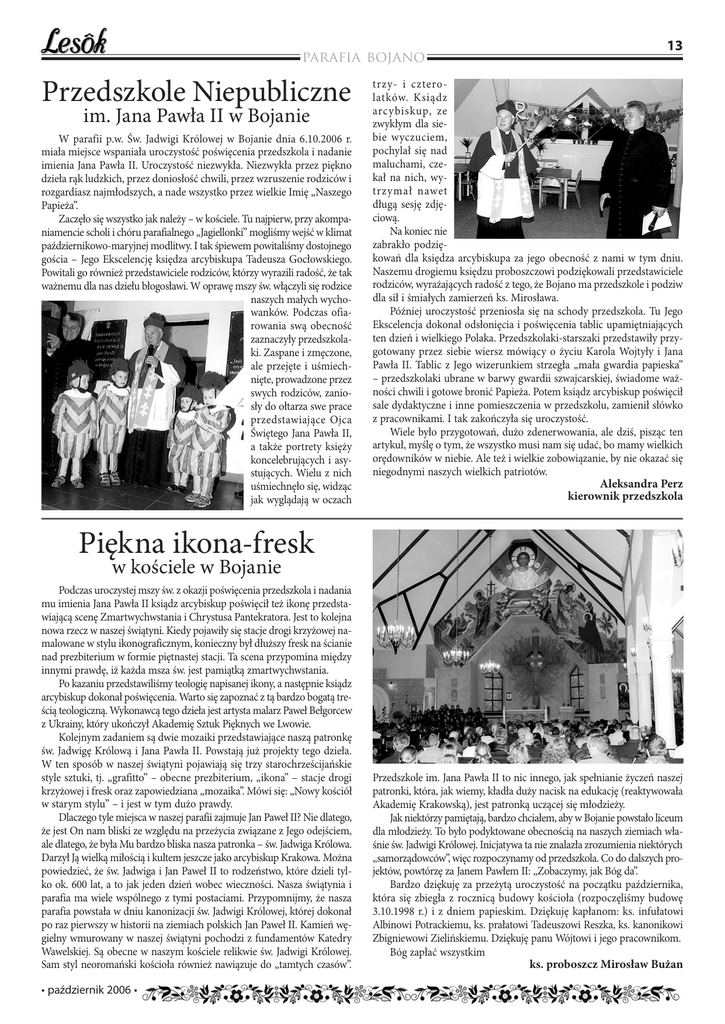 parafia bojano Przedszkole Niepubliczne im. Jana Pawła II w Bojanie W parafii p.w. Św. Jadwigi Królowej w Bojanie dnia 6.10.2006 r. miała miejsce wspaniała uroczystość poświęcenia przedszkola i nadanie imienia Jana Pawła II. Uroczystość niezwykła. Niezwykła przez piękno dzieła rąk ludzkich, przez doniosłość chwili, przez wzruszenie rodziców i rozgardiasz najmłodszych, a nade wszystko przez wielkie Imię „Naszego Papieża”. Zaczęło się wszystko jak należy – w kościele. Tu najpierw, przy akompaniamencie scholi i chóru parafialnego „Jagiellonki” mogliśmy wejść w klimat październikowo-maryjnej modlitwy. I tak śpiewem powitaliśmy dostojnego gościa – Jego Ekscelencję księdza arcybiskupa Tadeusza Gocłowskiego. Powitali go również przedstawiciele rodziców, którzy wyrazili radość, że tak ważnemu dla nas dziełu błogosławi. W oprawę mszy św. włączyli się rodzice naszych małych wychowanków. Podczas ofiarowania swą obecność zaznaczyły przedszkolaki. Zaspane i zmęczone, ale przejęte i uśmiechnięte, prowadzone przez swych rodziców, zaniosły do ołtarza swe prace przedstawiające Ojca Świętego Jana Pawła II, a także portrety księży koncelebrujących i asystujących. Wielu z nich uśmiechnęło się, widząc jak wyglądają w oczach 13 trzy- i czterolatków. Ksiądz arcybiskup, ze zwykłym dla siebie wyczuciem, pochylał się nad maluchami, czekał na nich, wytrzymał nawet długą sesję zdjęciową. Na koniec nie zabrakło podziękowań dla księdza arcybiskupa za jego obecność z nami w tym dniu. Naszemu drogiemu księdzu proboszczowi podziękowali przedstawiciele rodziców, wyrażających radość z tego, że Bojano ma przedszkole i podziw dla sił i śmiałych zamierzeń ks. Mirosława. Później uroczystość przeniosła się na schody przedszkola. Tu Jego Ekscelencja dokonał odsłonięcia i poświęcenia tablic upamiętniających ten dzień i wielkiego Polaka. Przedszkolaki-starszaki przedstawiły przygotowany przez siebie wiersz mówiący o życiu Karola Wojtyły i Jana Pawła II. Tablic z Jego wizerunkiem strzegła „mała gwardia papieska” – przedszkolaki ubrane w barwy gwardii szwajcarskiej, świadome ważności chwili i gotowe bronić Papieża. Potem ksiądz arcybiskup poświęcił sale dydaktyczne i inne pomieszczenia w przedszkolu, zamienił słówko z pracownikami. I tak zakończyła się uroczystość. Wiele było przygotowań, dużo zdenerwowania, ale dziś, pisząc ten artykuł, myślę o tym, że wszystko musi nam się udać, bo mamy wielkich orędowników w niebie. Ale też i wielkie zobowiązanie, by nie okazać się niegodnymi naszych wielkich patriotów. Aleksandra Perz kierownik przedszkola Piękna ikona-fresk w kościele w Bojanie Podczas uroczystej mszy św. z okazji poświęcenia przedszkola i nadania mu imienia Jana Pawła II ksiądz arcybiskup poświęcił też ikonę przedstawiającą scenę Zmartwychwstania i Chrystusa Pantekratora. Jest to kolejna nowa rzecz w naszej świątyni. Kiedy pojawiły się stacje drogi krzyżowej namalowane w stylu ikonograficznym, konieczny był dłuższy fresk na ścianie nad prezbiterium w formie piętnastej stacji. Ta scena przypomina między innymi prawdę, iż każda msza św. jest pamiątką zmartwychwstania. Po kazaniu przedstawiliśmy teologię napisanej ikony, a następnie ksiądz arcybiskup dokonał poświęcenia. Warto się zapoznać z tą bardzo bogatą treścią teologiczną. Wykonawcą tego dzieła jest artysta malarz Paweł Bełgorcew z Ukrainy, który ukończył Akademię Sztuk Pięknych we Lwowie. Kolejnym zadaniem są dwie mozaiki przedstawiające naszą patronkę św. Jadwigę Królową i Jana Pawła II. Powstają już projekty tego dzieła. W ten sposób w naszej świątyni pojawiają się trzy starochrześcijańskie style sztuki, tj. „grafitto” – obecne prezbiterium, „ikona” – stacje drogi krzyżowej i fresk oraz zapowiedziana „mozaika”. Mówi się: „Nowy kościół w starym stylu” – i jest w tym dużo prawdy. Dlaczego tyle miejsca w naszej parafii zajmuje Jan Paweł II? Nie dlatego, że jest On nam bliski ze względu na przeżycia związane z Jego odejściem, ale dlatego, że była Mu bardzo bliska nasza patronka – św. Jadwiga Królowa. Darzył Ją wielką miłością i kultem jeszcze jako arcybiskup Krakowa. Można powiedzieć, że św. Jadwiga i Jan Paweł II to rodzeństwo, które dzieli tylko ok. 600 lat, a to jak jeden dzień wobec wieczności. Nasza świątynia i parafia ma wiele wspólnego z tymi postaciami. Przypomnijmy, że nasza parafia powstała w dniu kanonizacji św. Jadwigi Królowej, której dokonał po raz pierwszy w historii na ziemiach polskich Jan Paweł II. Kamień węgielny wmurowany w naszej świątyni pochodzi z fundamentów Katedry Wawelskiej. Są obecne w naszym kościele relikwie św. Jadwigi Królowej. Sam styl neoromański kościoła również nawiązuje do „tamtych czasów”. • październik 2006 • Przedszkole im. Jana Pawła II to nic innego, jak spełnianie życzeń naszej patronki, która, jak wiemy, kładła duży nacisk na edukację (reaktywowała Akademię Krakowską), jest patronką uczącej się młodzieży. Jak niektórzy pamiętają, bardzo chciałem, aby w Bojanie powstało liceum dla młodzieży. To było podyktowane obecnością na naszych ziemiach właśnie św. Jadwigi Królowej. Inicjatywa ta nie znalazła zrozumienia niektórych „samorządowców”, więc rozpoczynamy od przedszkola. Co do dalszych projektów, powtórzę za Janem Pawłem II: „Zobaczymy, jak Bóg da”. Bardzo dziękuję za przeżytą uroczystość na początku października, która się zbiegła z rocznicą budowy kościoła (rozpoczęliśmy budowę 3.10.1998 r.) i z dniem papieskim. Dziękuję kapłanom: ks. infułatowi Albinowi Potrackiemu, ks. prałatowi Tadeuszowi Reszka, ks. kanonikowi Zbigniewowi Zielińskiemu. Dziękuję panu Wójtowi i jego pracownikom. Bóg zapłać wszystkim ks.