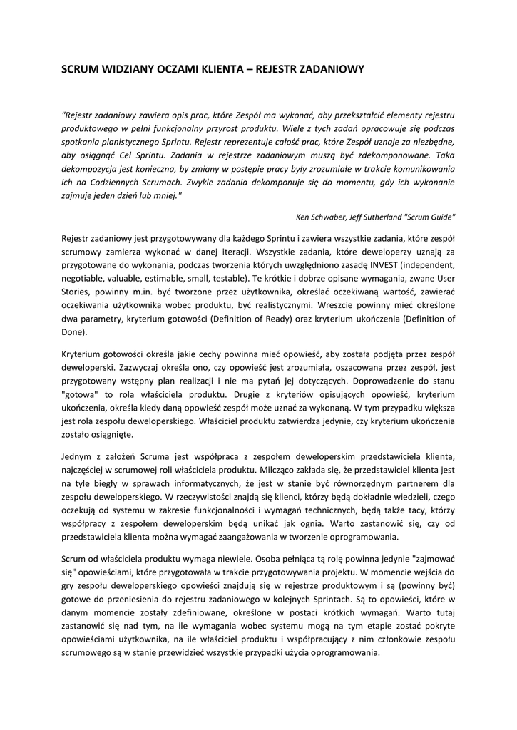 SCRUM WIDZIANY OCZAMI KLIENTA – REJESTR ZADANIOWY