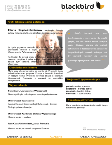 phone: +48 22 828 15 01 mobile: +48 501 29 93 38 [email protected] Profil lektora języka polskiego Maria Stąsiek-Smirnow ukończyła filologię polską, historię sztuki oraz etnologię i antropologię kultury. „ Każdy kursant ma inne predyspozycje i motywacje do nauki języka, nie ma dwóch takich samych Jej życie prywatne związało ją z Rosją. Przez sześć lat prowadziła lektorat z języka polskiego na Twerskim Uniwersytecie Państwowym w Rosji. Podchodzi do swojej pracy z radością i pasją. Jest osobą otwartą, cierpliwą i pełną energii. Robi wszystko, by jej zajęcia były ciekawe, atrakcyjne i przede wszystkim efektywne. grup. Dlatego staram się unikać schematów i dostosowywać zajęcia do indywidualnych potrzeb każdego, tak by kursant nauczył się języka polskiego efektywnie i bez stresu. ” Doświadczenie lektora Maria uczy obcokrajowców od ośmiu lat. Prowadzi kursy indywidualne oraz grupowe. Pracuje z dziećmi i dorosłymi w każdym wieku. Prowadzi również zajęcia z klientami biznesowymi. Pracowała z osobami ze wszystkich kontynentów. Wykształcenie Polonicum, Uniwersytet Warszawski Glottodydaktyka polonistyczna - studia podyplomowe Znajomość języków obcych polski – native speaker angielski – bardzo dobra rosyjski – bardzo dobra francuski – podstawowa Pozostała aktywność Uniwersytet Warszawski Instytut Etnologii i Antropologii Kulturowej - licencjat Filologia polska – licencjat Maria ma duże zamiłowanie do sztuki, innych kultur oraz podróży. Uniwersytet Kardynała Stefana Wyszyńskiego Historia sztuki – magister Ioan Cuza Universitate, Jassy, Rumunia Historia sztuki, w ramach programu Erasmus EXPATRIATES SERVICE by Blackbird Academy ACADEMY TRANSLATION AGENCY
