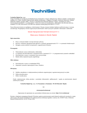 TechniSat Digital Sp. z o.o. Grupa TechniSat jest wiodącym przedsiębiorstwem niemieckim w branży elektronicznej. Główna siedziba i centrala firmy znajduje się w Daun. Ponadto Grupa posiada zakłady produkcyjne w Dippach (Turyngia), Schöneck (Saksonia), Staßfurt (Saksonia-Anhalt) i od lipca 2006 r. również w Siemianicach k.Obornik Śląskich w Polsce. TechniSat jest znany z innowacyjnych produktów o wysokiej jakości. Należy do czołowych producentów: odbiorników dla telewizji cyfrowej, modułów CI CAM, telewizorów LCD HD oraz osprzętu instalacyjnego dla SMATV i CATV. Nasza firma jest otwarta na współpracę z absolwentami. Chcemy stwarzać młodym ludziom możliwości pracy i rozwoju zawodowego. Przyjmujemy również tegorocznych absolwentów szkół wyższych wydziałów informatyki i elektroniki Inżynier Oprogramowania Telewizji Cyfrowej (C/C++) Miejsce pracy: Siemianice k. Obornik Śląskich Opis stanowiska: • • • Praca w obszarze badań i rozwoju telewizji cyfrowej Rozwój i wdrażanie oprogramowania głównie w językach oprogramowania C/C++ w systemach wbudowanych Dostępny system szkoleń wewnętrznych i zagranicznych (Niemcy) Wymagania: • • • • Wykształcenie wyższe (informatyka, elektronika) Co najmniej rok doświadczenia w programowaniu w językach C/C++ i w programowaniu systemów embedded Doświadczenie w pracy z systemami czasu rzeczywistego Bardzo dobra znajomość języka angielskiego Mile widziane: • • Doświadczenie w pracy ze standardami DVB Znajomość systemów operacyjnych Linux, Windows Oferujemy: • • • Stabilne zatrudnienie w międzynarodowej strukturze organizacyjnej o ugruntowanej pozycji na rynku Dobra atmosferę pracy Dobre warunki pracy Osoby zainteresowane ofertą prosimy o przesłanie dokumentów aplikacyjnych i zgodą na przetwarzanie danych osobowych na adres: TechniSat Digital Sp. z o.o. Ul. Poznańska 2; Siemianice 55-120 Oborniki Śląskie lub [email protected] Zapraszamy do zapoznania się z pozostałymi ofertami pracy na stronie: http://www.technisat.pl Prosimy o dopisanie następującej klauzuli: Wyrażam zgodę na przetwarzanie moich danych osobowych zawartych w mojej ofercie pracy dla potrzeb niezbędnych do realizacji procesu rekrutacji (zgodnie z ustawą z dn. 29.08.97 roku o Ochronie Danych Osobowych Dz. Ust Nr 133 poz. 883)