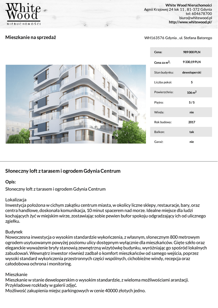White Wood Nieruchomości Armii Krajowej 24 lok 11 , 81-372 Gdynia tel: 604678700 [email protected] http://www.whitewood.pl/ Mieszkanie na sprzedaż WH163576 Gdynia , ul. Stefana Batorego Cena: 989 000 PLN Cena za m2: 9 330,19 PLN Stan budynku: deweloperski Liczba pokoi: 5 Powierzchnia: 106 m2 Piętro: 5/5 Winda: nie Rok budowy: 2017 Balkon: tak Garaż: nie Słoneczny loft z tarasem i ogrodem Gdynia Centrum Opis: Słoneczny loft z tarasem i ogrodem Gdynia Centrum Lokalizacja Inwestycja położona w cichym zakątku centrum miasta, w okolicy liczne sklepy, restauracje, bary, oraz centra handlowe, doskonała komunikacja, 10 minut spacerem nad morze. Idealne miejsce dla ludzi kochających żyć w miejskim wirze, zostawiając sobie pewien bufor spokoju odgradzający ich od ulicznego zgiełku. Budynek Nowoczesna inwestycja o wysokim standardzie wykończenia, z własnym, słonecznym 800 metrowym ogrodem usytuowanym powyżej poziomu ulicy dostępnym wyłącznie dla mieszkańców. Gięte szkło oraz eleganckie wyważenie bryły stanowią zewnętrzną wizytówkę budynku, wyróżniając go spośród lokalnych zabudowań. Wewnątrz inwestor również zadbał o komfort mieszkańców od samego wejścia, poprzez wysoki standard wykończenia przestronnych części wspólnych, cichobieżne windy, recepcja oraz całodobowa ochrona i monitoring. Mieszkanie Mieszkanie w stanie deweloperskim o wysokim standardzie, z wieloma możliwościami aranżacji. Przykładowe rozkłady w galerii zdjęć. Możliwość zakupienia miejsc parkingowych w cenie 40000 złotych jedno. White Wood Nieruchomości Armii Krajowej 24 lok 11 , 81-372 Gdynia tel: 604678700 [email protected] http://www.whitewood.pl/ kontakt Paweł Wysocki +48-606-109-020 Paweł Wysocki +48-606-109-020 White Wood Nieruchomości Paweł Wysocki Armii Krajowej 24 lok 11 , 81-372 Gdynia +48-606-109-020 [email protected] http://www.whitewood.pl/