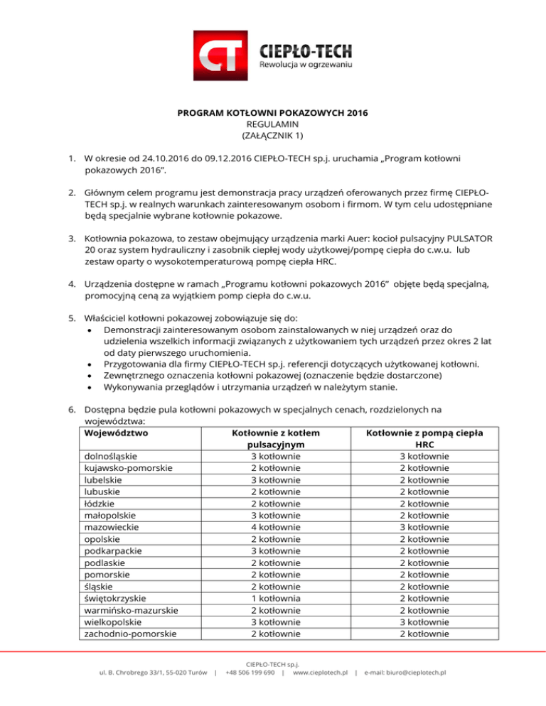 PROGRAM KOTŁOWNI POKAZOWYCH 2016 REGULAMIN (ZAŁĄCZNIK 1) 1. W okresie od 24.10.2016 do 09.12.2016 CIEPŁO-TECH sp.j. uruchamia „Program kotłowni pokazowych 2016”. 2. Głównym celem programu jest demonstracja pracy urządzeń oferowanych przez firmę CIEPŁOTECH sp.j. w realnych warunkach zainteresowanym osobom i firmom. W tym celu udostępniane będą specjalnie wybrane kotłownie pokazowe. 3. Kotłownia pokazowa, to zestaw obejmujący urządzenia marki Auer: kocioł pulsacyjny PULSATOR 20 oraz system hydrauliczny i zasobnik ciepłej wody użytkowej/pompę ciepła do c.w.u. lub zestaw oparty o wysokotemperaturową pompę ciepła HRC. 4. Urządzenia dostępne w ramach „Programu kotłowni pokazowych 2016” objęte będą specjalną, promocyjną ceną za wyjątkiem pomp ciepła do c.w.u. 5. Właściciel kotłowni pokazowej zobowiązuje się do: Demonstracji zainteresowanym osobom zainstalowanych w niej urządzeń oraz do udzielenia wszelkich informacji związanych z użytkowaniem tych urządzeń przez okres 2 lat od daty pierwszego uruchomienia. Przygotowania dla firmy CIEPŁO-TECH sp.j. referencji dotyczących użytkowanej kotłowni. Zewnętrznego oznaczenia kotłowni pokazowej (oznaczenie będzie dostarczone) Wykonywania przeglądów i utrzymania urządzeń w należytym stanie. 6. Dostępna będzie pula kotłowni pokazowych w specjalnych cenach, rozdzielonych na województwa: Województwo Kotłownie z kotłem Kotłownie z pompą ciepła pulsacyjnym HRC dolnośląskie 3 kotłownie 3 kotłownie kujawsko-pomorskie 2 kotłownie 2 kotłownie lubelskie 3 kotłownie 2 kotłownie lubuskie 2 kotłownie 2 kotłownie łódzkie 2 kotłownie 2 kotłownie małopolskie 3 kotłownie 2 kotłownie mazowieckie 4 kotłownie 3 kotłownie opolskie 2 kotłownie 2 kotłownie podkarpackie 3 kotłownie 2 kotłownie podlaskie 2 kotłownie 2 kotłownie pomorskie 2 kotłownie 2 kotłownie śląskie 2 kotłownie 2 kotłownie świętokrzyskie 1 kotłownia 2 kotłownie warmińsko-mazurskie 2 kotłownie 2 kotłownie wielkopolskie 3 kotłownie 3 kotłownie zachodnio-pomorskie 2 kotłownie 2 kotłownie ul. B. Chrobrego 33/1, 55-020 Turów | CIEPŁO-TECH sp.j. +48 506 199 690 | www.cieplotech.pl | e-mail: [email protected] 7. Aby uzyskać prawo zakupu kotłowni, należy złożyć odpowiednie zamówienie do 02.12.2016 roku oraz opłacić je najpóźniej do dnia 09.12.2016 roku z okazaniem potwierdzenia przelewu. Podstawą do zapłaty jest załączona do umowy wycena kotłowni pokazowej. Zamówienia nie opłacone do tego dnia zostaną anulowane. CIEPŁO-TECH sp.j. dostarczy urządzenia zamówione w ramach „Programu kotłowni pokazowych 2016” do dnia 31.01.2017 roku. 8. Kotłownie pokazowe instalowane będą w różnych miejscach Polski, w budynkach o standardzie umożliwiającym prezentację urządzeń w jak najlepszych warunkach i zlokalizowanych w taki sposób aby zapewnić dostępnych dla jak największej ilości potencjalnie zainteresowanych osób. Pomieszczenie kotłowni powinno być czyste i zadbane, sprzyjające promocji urządzeń. 9. Wybór obiektów przeznaczonych do instalacji kotłowni pokazowych będzie dokonany przez firmę CIEPŁO-TECH sp.j., w oparciu o warunki opisane w punkcie 8. 10. Dane kontaktowe do właścicieli kotłowni pokazowych będę przekazywane firmie CIEPŁO-TECH sp.j. 11. Firma CIEPŁO-TECH sp.j. zobowiązuje się do zabezpieczenia danych o kotłowniach pokazowych, wcześniejszego powiadomienia właściciela kotłowni pokazowej o planowanej wizycie zainteresowanych osób, zapytania o wyrażenie zgody na przekazanie danych kontaktowych oraz do pośredniczenia w ustaleniu dogodnej daty wizytacji kotłowni. 12. W przypadku utrudnienia lub odmowy udostępnienia kotłowni pokazowej przez użytkownika, wystawiona zostanie korekta faktury za kotłownię pokazową, wyrównująca cenę do cen katalogowych urządzeń zamontowanych w kotłowni. 13. Kotłownia pokazowa dostępna jest dla wszystkich zainteresowanych i nie ogranicza się tylko do klientów instalatora, który zainstalował kotłownię. 14. Złożenie zamówienia na kotłownię pokazową jest równoznaczne z akceptacją niniejszego regulaminu. ul. B. Chrobrego 33/1, 55-020 Turów | CIEPŁO-TECH sp.j. +48 506 199 690 | www.cieplotech.pl | e-mail: [email protected]