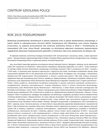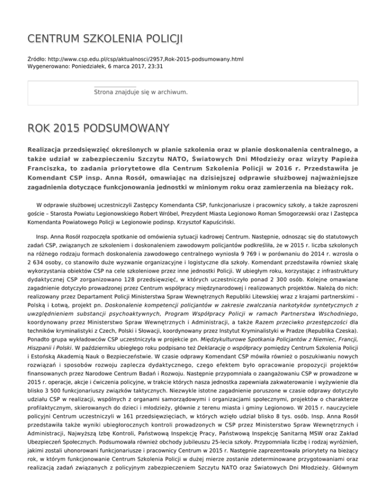 CENTRUM SZKOLENIA POLICJI Źródło: http://www.csp.edu.pl/csp/aktualnosci/2957,Rok-2015-podsumowany.html Wygenerowano: Poniedziałek, 6 marca 2017, 23:31 Strona znajduje się w archiwum. ROK 2015 PODSUMOWANY Realizacja przedsięwzięć określonych w planie szkolenia oraz w planie doskonalenia centralnego, a także udział w zabezpieczeniu Szczytu NATO, Światowych Dni Młodzieży oraz wizyty Papieża Franciszka, to zadania priorytetowe dla Centrum Szkolenia Policji w 2016 r. Przedstawiła je Komendant CSP insp. Anna Rosół, omawiając na dzisiejszej odprawie służbowej najważniejsze zagadnienia dotyczące funkcjonowania jednostki w minionym roku oraz zamierzenia na bieżący rok. W odprawie służbowej uczestniczyli Zastępcy Komendanta CSP, funkcjonariusze i pracownicy szkoły, a także zaproszeni goście – Starosta Powiatu Legionowskiego Robert Wróbel, Prezydent Miasta Legionowo Roman Smogorzewski oraz I Zastępca Komendanta Powiatowego Policji w Legionowie podinsp. Krzysztof Kapuściński. Insp. Anna Rosół rozpoczęła spotkanie od omówienia sytuacji kadrowej Centrum. Następnie, odnosząc się do statutowych zadań CSP, związanych ze szkoleniem i doskonaleniem zawodowym policjantów podkreśliła, że w 2015 r. liczba szkolonych na różnego rodzaju formach doskonalenia zawodowego centralnego wyniosła 9 769 i w porównaniu do 2014 r. wzrosła o 2 634 osoby, co stanowiło duże wyzwanie organizacyjne i logistyczne dla szkoły. Komendant przedstawiła również skalę wykorzystania obiektów CSP na cele szkoleniowe przez inne jednostki Policji. W ubiegłym roku, korzystając z infrastruktury dydaktycznej CSP zorganizowano 128 przedsięwzięć, w których uczestniczyło ponad 2 300 osób. Kolejne omawiane zagadnienie dotyczyło prowadzonej przez Centrum współpracy międzynarodowej i realizowanych projektów. Należą do nich: realizowany przez Departament Policji Ministerstwa Spraw Wewnętrznych Republiki Litewskiej wraz z krajami partnerskimi Polską i Łotwą, projekt pn. Doskonalenie kompetencji policjantów w zakresie zwalczania narkotyków syntetycznych z uwzględnieniem substancji psychoaktywnych, Program Współpracy Policji w ramach Partnerstwa Wschodniego, koordynowany przez Ministerstwo Spraw Wewnętrznych i Administracji, a także Razem przeciwko przestępczości dla techników kryminalistyki z Czech, Polski i Słowacji, koordynowany przez Instytut Kryminalistyki w Pradze (Republika Czeska). Ponadto grupa wykładowców CSP uczestniczyła w projekcie pn. Międzykulturowe Spotkania Policjantów z Niemiec, Francji, Hiszpanii i Polski. W październiku ubiegłego roku podpisano też Deklarację o współpracy pomiędzy Centrum Szkolenia Policji i Estońską Akademią Nauk o Bezpieczeństwie. W czasie odprawy Komendant CSP mówiła również o poszukiwaniu nowych rozwiązań i sposobów rozwoju zaplecza dydaktycznego, czego efektem było opracowanie propozycji projektów finansowanych przez Narodowe Centrum Badań i Rozwoju. Następnie przypomniała o zaangażowaniu CSP w prowadzone w 2015 r. operacje, akcje i ćwiczenia policyjne, w trakcie których nasza jednostka zapewniała zakwaterowanie i wyżywienie dla blisko 3 500 funkcjonariuszy związków taktycznych. Niezwykle istotne zagadnienie poruszone w czasie odprawy dotyczyło udziału CSP w realizacji, wspólnych z organami samorządowymi i organizacjami społecznymi, projektów o charakterze profilaktycznym, skierowanych do dzieci i młodzieży, głównie z terenu miasta i gminy Legionowo. W 2015 r. nauczyciele policyjni Centrum uczestniczyli w 161 przedsięwzięciach, w których wzięło udział blisko 8 tys. osób. Insp. Anna Rosół przedstawiła także wyniki ubiegłorocznych kontroli prowadzonych w CSP przez Ministerstwo Spraw Wewnętrznych i Administracji, Najwyższą Izbę Kontroli, Państwową Inspekcję Pracy, Państwową Inspekcję Sanitarną MSW oraz Zakład Ubezpieczeń Społecznych. Podsumowała również obchody jubileuszu 25-lecia szkoły. Przypomniała liczbę i rodzaj wyróżnień, jakimi zostali uhonorowani funkcjonariusze i pracownicy Centrum w 2015 r. Następnie zaprezentowała priorytety na bieżący rok, w którym funkcjonowanie Centrum Szkolenia Policji w dużej mierze zostanie zdeterminowane przygotowaniami oraz realizacją zadań związanych z policyjnym zabezpieczeniem Szczytu NATO oraz Światowych Dni Młodzieży. Głównym zadaniem spoczywającym na CSP będzie uruchomienie Policyjnego Centrum Dowodzenia na potrzeby koordynacji działań służb i podmiotów zaangażowanych w zapewnienie bezpieczeństwa obu wydarzeń. Wiąże się to z realizacją zadań inwestycyjnych, remontowych i teleinformatycznych, wyznaczeniem i przygotowaniem kadry Centrum Szkolenia Policji do realizacji zadań w Policyjnym Centrum Dowodzenia, a także zakwaterowaniem i wyżywieniem sił policyjnych. To dodatkowe, bardzo ważne zadanie spowoduje konieczność stalej analizy planów szkolenia i doskonalenia zawodowego opracowanego dla naszej jednostki na 2016 r. Należy przy tym pamiętać o szczególnym znaczeniu zadań szkoleniowych, wynikających z Priorytetów i zadań priorytetowych Komendanta Głównego Policji na lata 2016-2018. Na koniec swojego wystąpienia insp. Anna Rosół podziękowała wszystkim funkcjonariuszom i pracownikom za zaangażowanie w wykonywane zadania statutowe oraz różnego rodzaju przedsięwzięcia i projekty. Obszar związany z realizacją procesu dydaktycznego omówiła p.o. Zastępca Komendanta ds. Dydaktycznych podinsp. dr Iwona Klonowska. Przypomniała, że w 2015 r. CSP powierzono do realizacji oprócz szkolenia zawodowego podstawowego, 69 rodzajów kursów specjalistycznych, w tym 36 na wyłączność oraz 13 rodzajów warsztatów, na podstawie opracowanych w Centrum nowatorskich programów ukierunkowanych na doskonalenie umiejętności zawodowych policjantów. Podkreśliła, że porównując kolejne lata funkcjonowania CSP, możemy zaobserwować ogromny wzrost liczby absolwe