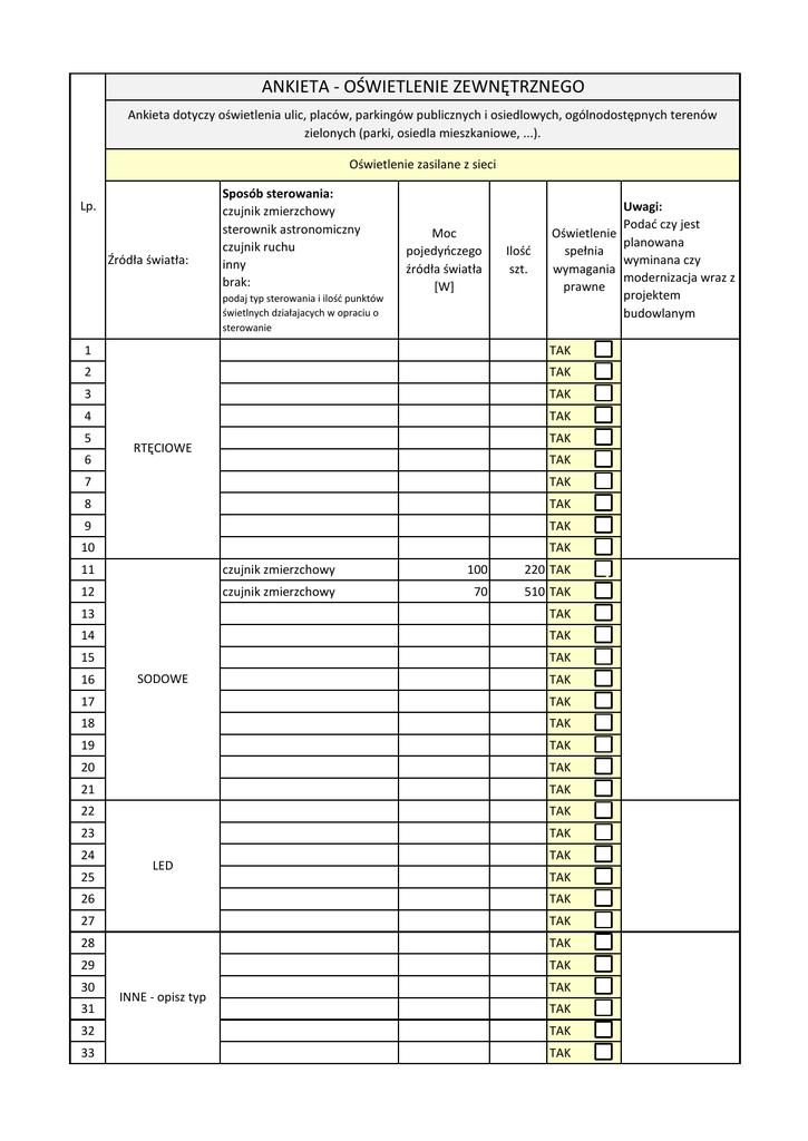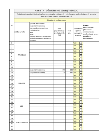 ANKIETA - OŚWIETLENIE ZEWNĘTRZNEGO Ankieta dotyczy oświetlenia ulic, placów, parkingów publicznych i osiedlowych, ogólnodostępnych terenów zielonych (parki, osiedla mieszkaniowe, ...). Oświetlenie zasilane z sieci Lp. Źródła światła: Sposób sterowania: czujnik zmierzchowy sterownik astronomiczny czujnik ruchu inny brak: podaj typ sterowania i ilość punktów świetlnych działajacych w opraciu o sterowanie Moc pojedyńczego źródła światła [W] Ilość szt. Uwagi: Podać czy jest Oświetlenie planowana spełnia wyminana czy wymagania modernizacja wraz z prawne projektem budowlanym 1 TAK 2 TAK 3 TAK 4 TAK 5 6 TAK RTĘCIOWE TAK 7 TAK 8 TAK 9 TAK 10 TAK 11 czujnik zmierzchowy 100 220 TAK 12 czujnik zmierzchowy 70 510 TAK 13 TAK 14 TAK 15 TAK 16 SODOWE TAK 17 TAK 18 TAK 19 TAK 20 TAK 21 TAK 22 TAK 23 TAK 24 25 LED TAK TAK 26 TAK 27 TAK 28 TAK 29 TAK 30 31 INNE - opisz typ TAK TAK 32 TAK 33 TAK x 34 35 Źródła światła: Oświetlenie zasilane z OZE ( panele PV, watraki…) Sposób sterowania: czujnik zmierzchowy sterownik astronomiczny czujnik ruchu inny brak: podaj typ sterowania i ilość punktów świetlnych działajacych w opraciu o sterowanie Moc pojedyńczego źródła światła [W] Ilość szt. Rok budowy instalcji 36 RTĘCIOWE 37 38 39 SODOWE 40 41 42 LED 43 44 45 INNE - opisz typ Sporządził ankietę: telefon: e-mail: ………………………………………… ………………………………………… ………………………………………… Uwagi użytkowe:
