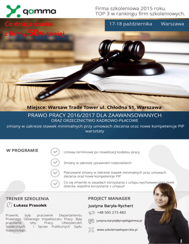 Co druga osoba z firmy 50% taniej 19-20 maja 17-18 października 13 maja Warszawa Warszawa Poznań Co druga osoba z firmy 50% taniej Miejsce: Warsaw Trade Tower ul. Chłodna 51, Warszawa PRAWO PRACY 2016/2017 DLA ZAAWANSOWANYCH ORAZ ORZECZNICTWO KADROWO-PŁACOWE zmiany w zakresie stawek minimalnych przy umowach zlecenia oraz nowe kompetencje PIP warsztaty Umowy terminowe po nowelizacji kodeksu pracy Zmiany w zakresie uprawnień rodzicielskich Planowane zmiany w zakresie stawek minimalnych przy umowach zlecenia oraz nowe kompetencje PIP Co się zmieniło w zasadach korzystania z urlopu wychowawczego (wiek dziecka, wspólne korzystanie z urlopu)? Łukasz Prasołek Prawnik, były pracownik Departamentu Prawnego Głównego Inspektoratu Pracy. Były pracownik Izby Pracy, Ubezpieczeń Społecznych i Spraw Publicznych Sądu Najwyższego. PRAWO PRACY 2016/2017 DLA ZAAWANSOWANYCH ORAZ ORZECZNICTWO KADROWO-PŁACOWE zmiany w zakresie stawek minimalnych przy umowach zlecenia oraz nowe kompetencje PIP warsztaty Rok 2016 przyniósł wiele zmian w prawie pracy, które już obrosły stanowiskami urzędowymi wyjaśniającymi nieprecyzyjne przepisy związane z rodzicielstwem i umowami terminowymi, bez których w zasadzie nie da się zrozumieć sensu nowych instytucji. Dlatego chcemy zaprosić Państwa na unikalne szkolenie ułatwiające zrozumieć wszystkie zmiany już wprowadzone w 2016 r. i przygotowujące do zmian związanych z minimalnymi stawkami godzinowymi wprowadzanymi od stycznia 2017 r. w umowach cywilnoprawnych. Drugi dzień szkolenia zostanie poświęcony omówieniu orzecznictwa kadrowo-płacowego z okresu 2015-2016, co pozwoli być na bieżąco z aktualnymi trendami w kadrach i płacach i podejmować jak najbardziej wyważone decyzje nienarażające pracodawców na ryzyko sporów sądowych. PONADTO W TRAKCIE SZKOLENIA ZAPOZNAMY PAŃSTWA Z DOSTĘPNYMI NA RYNKU OFICJALNYMI INTERPRETACJAMI ZNOWELIZOWANYCH PRZEPISÓW!!! Szkolenie skierowane jest do: Dyrektorów Personalnych, Dyrektorów/Kierowników działów kadr i płac, specjalistów ds. kadr i płac, pracowników firm payrollowych, menagerów nadzorujących działy HR; 2 PRAWO PRACY 2016/2017 DLA ZAAWANSOWANYCH ORAZ ORZECZNICTWO KADROWO-PŁACOWE zmiany w zakresie stawek minimalnych przy umowach zlecenia oraz nowe kompetencje PIP warsztaty 17 października ZMIANY W PRAWIE PRACY PROJEKTOWANE ZMIANY • Kiedy trzeba będzie potwierdzać umowę o pracę z nowym pracownikiem? • Jakie dokumenty trzeba będzie podpisać przed dopuszczeniem pracownika do pracy? • Na czym będą polegały zmiany związane z zakazem prac wzbronionych dla kobiet? • Czy w związku ze zmianami dotyczącymi prac wzbronionych konieczne będą zmiany w regulaminach pracy firm? • Kogo obejmą planowane zmiany dotyczące minimalnego wynagrodzenia na umowie zlecenia? • Jak będzie ustalana minimalna stawka przy umowach zlecenia? • Czy konieczna będzie zmiana treści dotychczasowych umów zlecenia? • Czy będzie należało prowadzić ewidencję godzin przepracowanych na zleceniu? • Jakie nowe kompetencjo otrzyma PIP w związku ze zmianami zasad wynagradzania umów zleceń? UMOWY O PRACĘ • Jak liczyć wypowiedzenia umów terminowych zawartych przed 22 lutego i po wejściu w życie nowelizacji? • Czy ze starych umów na czas określony powinno się powykreślać klauzule o 2-tygodniowym wypowiedzeniu? • Do kiedy powinno się pozmieniać informacje o podstawowych warunkach zatrudnienia osobom mającym umowy na czas określony? • Czy uzupełnienie umów na zastępstwo musi mieć formę aneksu do umowy, czy możliwe jest w tym zakresie wypowiedzenie zmieniające? • Czy zgłoszenie do PIP umowy zawartej w związku z obiektywnymi przyczynami uzasadniającymi przekroczenie 33 miesięcy oznacza kontrolę w firmie? • Czy możliwe jest zawarcie więcej niż 2 umów o pracę na okres próbny z tym samym pracownikiem? ZMIANY ZWIĄZANE Z RODZICIELSTWEM • Czy zwolnienie na opiekę nad dzieckiem może być wykorzystywane w minutach? • Jak obliczyć wymiar zwolnienia w godzinach, jeśli pracownik zmienia wymiar etatu w trakcie roku kalendarzowego? • Czy rodzice mogą się nierówno podzielić uprawnieniem do opieki nad dzieckiem? • Jak ustalić proporcjonalne wydłużenie urlopu rodzicielskiego w przypadku łączenia pracy na część etatu z urlopem rodzicielskim? • Jak udzielać pracownikom wydłużeń urlopów rodzicielskich? • Czy wydłużenie urlopu rodzicielskiego jest jego kolejną częścią? • Jak obliczać wynagrodzenia pracownikom łączącym urlopy rodzicielskie z pracą? • Kiedy pracownik może zmieniać wymiar etatu, który łączy z urlopem rodzicielskim? 3 Łukasz Prasołek były pracownik Departamentu Prawnego Głównego Inspektoratu Pracy, specjalizujący się w praktycznych aspektach czasu pracy oraz czasu pracy kierowców i koordynujący kontrole z tego zakresu, w latach 2006-2010 . Wykładowca prawa pracy na Wydziale Zarządzania UW. Były pracownik Izby Pracy, Ubezpieczeń Społecznych i Spraw Publicznych Sądu Najwyższego. Jest współpracownikiem Rzeczpospolitej oraz Gazety Prawnej i wielu innych wydawnictw branżowych skierowanych do kadr i płac oraz firm transportowych. Przeprowadził kilkaset szkoleń z zakresu prawa pracy zarówno otwartych, jak i zamkniętych, od kilku lat zajęcia z tego zakresu prowadzi również na kursach dla specjalistów ds. kadr i płac. PRAWO PRACY 2016/2017 DLA ZAAWANSOWANYCH ORAZ ORZECZNICTWO KADROWO-PŁACOWE zmiany w zakresie stawek minimalnych przy umowach zlecenia oraz nowe kompetencje PIP warsztaty Łukasz Prasołek ELEKTRONICZNE ZWOLNIENIA LEKARSKIE • Czy system elektronicznych zwolnień lekarskich wymusza zmiany w regulaminach pracy? • Czy elektroniczne zwolnienie może być wystawiona na urządzeniu mobilnym? • Czy pracodawca będzie mógł elektronicznie za pośrednictwem profilu wystąpić do ZUS o kontrolę zwolnienia lekarskiego? • Czy wydruk zwolnienia lekarskiego musi mie