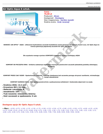 Informacje o produkcie Utworzono 06-03-2017 Air Optix Aqua 6 sztuk. Cena : 79,99 zł er m ar k Producent : Alcon Dostępność : Dostępny Stan magazynowy : bardzo wysoki Średnia ocena : brak recenzji NOWOŚĆ! AIR OPTIX™ AQUA - silikonowo-hydrożelowe soczewki kontaktowe nowej generacji dla zdrowia Twoich oczu. Air Optix Aqua to nowsza generacja popularnej soczewki Air optix (O2 Optix). Dla uzyskania nowego wymiaru KOMFORTU dodaliśmy system nawilżający AQUA KOMFORT OD POCZĄTKU DNIA - Unikalna substancja nawilżająca tworzy na powierzchni soczewki jedwabistą powłokę ułatwiającą mruganie. at KOMFORT PRZEZ CAŁY DZIEŃ - Opatentowany materiał, z którego zbudowana jest soczewka pomaga utrzymać nawilżenie, minimalizując tempo odwodnienia. KOMFORT KAŻDEGO DNIA - Ultra gładka powierzchnia o podwyższonej zwilżalności i doskonałej odporności na osady ● ● ● ● ● Średnica (DIA): 14.2 mm Krzywizna (BC): 8.6 mm Materiał: Lotrafilcon B Uwodnienie: 33% Tryb noszenia: miesięczny dzienny Ilość soczewek w opakowaniu: 6 szt. w ● ● Dostępne opcje Air Optix Aqua 6 sztuk. » Moc:: +0.50, +0.75, +1.00, +1.25, +1.50, +1.75, +2.00, +2.25, +2.50, +2.75, +3.00, +3.25, +3.50, +3.75, +4.00, +4.25, +4.50, +4.75, +5.00, +5.25, +5.50, +5.75, +6.00, -0.50, -0.75, -1.00, -1.25, -1.50, -1.75, -2.00, -2.25, -2.50, -2.75, -3.00, -3.25, -3.50, -3.75, -4.00, -4.25, -4.50, -4.75, -5.00, -5.25, -5.50, -5.75, -6.00, -6.50, -7.00, -7.50, -8.00, -8.50, -9.00, -9.50, -10.00. Wygenerowano w programie www.oscGold.com