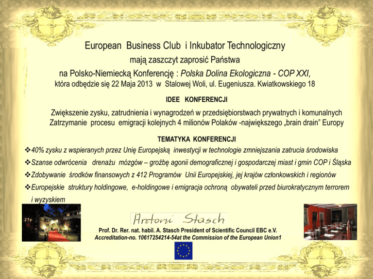 European Business Club i Inkubator Technologiczny mają zaszczyt zaprosić Państwa na Polsko-Niemiecką Konferencję : Polska Dolina Ekologiczna - COP XXI, która odbędzie się 22 Maja 2013 w Stalowej Woli, ul. Eugeniusza. Kwiatkowskiego 18 IDEE KONFERENCJI Zwiększenie zysku, zatrudnienia i wynagrodzeń w przedsiębiorstwach prywatnych i komunalnych Zatrzymanie procesu emigracji kolejnych 4 milionów Polaków -największego „brain drain” Europy TEMATYKA KONFERENCJI 40% zysku z wspieranych przez Unię Europejską inwestycji w technologie zmniejszania zatrucia środowiska Szanse odwrócenia drenażu mózgów – groźbę agonii demograficznej i gospodarczej miast i gmin COP i Śląska Zdobywanie środków finansowych z 412 Programów Unii Europejskiej, jej krajów członkowskich i regionów Europejskie struktury holdingowe, e-holdingowe i emigracja ochroną obywateli przed biurokratycznym terrorem i wyzyskiem Prof. Dr. Rer. nat. habil. A. Stasch President of Scientific Council EBC e.V. Accreditation-no. 10617254214-54at the Commission of the European Union1 Cele , zadania i problematyka konferencji : I. Umożliwienie Uczestnikom indywidualnego consultingu specjalistów z zespołów: Zbigniewa Rocha, prof. dr Antoniego Stasch´a Zagadnienia: europejskie holdingi i e-holdingi- zakładanie, maksymalizacja zysku, minimalizacja ZUS i podatku finansowanie działalności gospodarczej w ramach programów pomocy Unii Europejskiej prof. dr Zbigniewa Bochniarza, Zbigniewa Rocha , prof. dr Antoniego Stasch´a Zagadnienia: Inwestycje w sektorze Odnawialnych Źródeł Energii, szanse rozwoju Biznesu w holdingach i klastrach.:pn. amerykanskich, szwajcarskich, niemieckih i polskich dr n. med. Krystyny Anioł Strzyżewskiej , prof. dr Antoniego Stasch`a Zagadnienia:Usługi Zdrowotne XXI wieku najwyżej rozwiniętych społeczeństw Europy i pozostałych kontynentów: biomedycyna, medycyna naturalna, profilaktyka, terapia i rehabilitacja psychomotoryczna, medycyna laserowa prof. dr Romualda Szeremietiewa, prof. dr Antoniego Stasch`a Zagadnienia: finansowane przez NATO i Unię Europejską odnawialne, decentralne źródła energii jako: podstawa bezpieczeństwa obywateli i obronności kraju szansa strategicznej energetycznej i politycznej niezależności od gazu i ropy naftowej w epoce terroryzmu i zagrożeń militarnych II. Prezentacja na stoiskach biznesu i w formie sesji posterowych osiagnięc Biznesu i Nauki COP oraz Wielkiej Szwajcarji w obszarach: produkty i usługi , nauka i technologia, eksport i kooperacja w nastepujacyh obszarach: Strategia 6. krotnego zwiększenia zysku polskich przedsiębiorstw dzięki wykorzystaniu efektu „made in Germany” polsko-niemiecko-szwajcarskich holdingów i środkom finansowym Unii Europejskiej e-Studia w Polsce z niemieckim dyplomem szansą pracy i akumulacji 1. go miliona € na rozwój swojego biznesu e-biznes i e-eksport wysokokwalifikowanych produktów i usług w modelu Bangalure-Wielka Szwajcaria- zamiast emigracji milionów wykształconych Polaków do IV Rzeszy Niemieckiej Nowa medycyna XXI wieku- najwiekszy, nowy sektor usług najbardziej rozwiniętych społeczeństw: bioanalityka,biomedycyna, medycyna naturalna, terapia i rehabilitacja psychomotoryczna w walce ze schorzeniami cywilizacji XXI wieku Odnawialne Źródła Energii-największy, najnowocześniejszy biznes XXI wieku: Niemiec, Austrii, Szwecji, Szwajcarii i USA- zysk w wysokości 6 miliardów € rocznie 2,5 milionów obywateli z: Pd. Niemiec, Szwajcarii i Austrii – szans i zagrożenie dla 1,7mln. polskich przedsiębiorstw prywatnych i tysięcy komunalnych 1200 miliardow US $ inwestycji ekologicznych:Bila Gatesa, Warrena Buffeta General Electric, Siemensa- szansą dla polskich podwykonawców i producentów Wysoko opłacalne inwestycje ekologiczne przedsiębiorstw oraz gospodarstw domowych Dolin Technologicznych Europy w: Elektrociepłownie fotowoltaiczne i termo solarne zamiast: wiatru, rozbijqania jąder, gazu Putina i gazu (gł)upkowego Elektrociepłownie geoplutoniczne – technologia 29 patentów USA polskiego wynalazcy i amerykańskiego milionera prof. dr inż. Bohdana Żakiewicza niezawodne źródło czystej energii dla miast, gmin i Średnich oraz Dużych Przedsiębiorstw Biznes produkcji i dystrybucji czystej i taniej zielonej energii dla motoryzacji i napędu maszyn przemysłowych: biogaz, biodiesel, diesel z trudno utylizowalnych odpadów, bioetanol z wierzby energetycznej i kukurydzy Rada Naukowa Konferencji President, prof. dr Andrew Targowski (USA), Western Michigan University, President of Advisory Council of the IRMA, ( Information Resources Management Association) Vice President , prof. dr Zbigniew Bochniarz (USA) Washington University Vice President prof. dr Romuald Szeremietiew (Poland) Prof. dr Jacek Lapinski (Poland), John Paul II, Catholic University Prof. dr Antoni Magdoń (Poland), John Paul II, Catholic University Prof. dr Piotr Moncarz (USA), Stanford University Prof. dr Tomasz Rakoczy (Poland), John Paul II, Catholic University Prof dr Anton Stasch (FRG,Poland), President of Scientific Council European Business Club e.V. (FRG), Prof. dr Jan Zimny (Poland), John Paul II, Catholic University Dr Barbara Lubas (Poland), J.P II. Catholic University Dr Beata Piasny, J.P II. Catholic University Dr. Tomasz Dziechciarz, J.P II. Catholic University Dr J. W. Przybytniowski, Jan Kochanowski University, Kielce mgr Weronika Kuczek, European Business Club e.V. mgr Anna Krawczyk-Sawicka, John Paul II, Catholic University Rada Programowa Konferencji Prof. dr Jan Dobrowolski Prof dr Antoni.Stasch Dipl. Jurist Zbigniew Roch Prof. dr Zbigniew . Bochniarz Dr J. W. Przybytniowski Sekretarz mgr Anna Krawczyk-Sawicka Referaty I Sesji Plenarnej (20 minut) COP XXI , Polsko - Amerykański Cluster Innowacyjnych Technologii- Zbigniew Bochniarz ( Washington University) Elektrocieplownie Geoplutoniczne Bohdana Żakiewicza - Piotr Moncarz (Stanford University) Dipl. Jurist Zbigniew Roch (European B