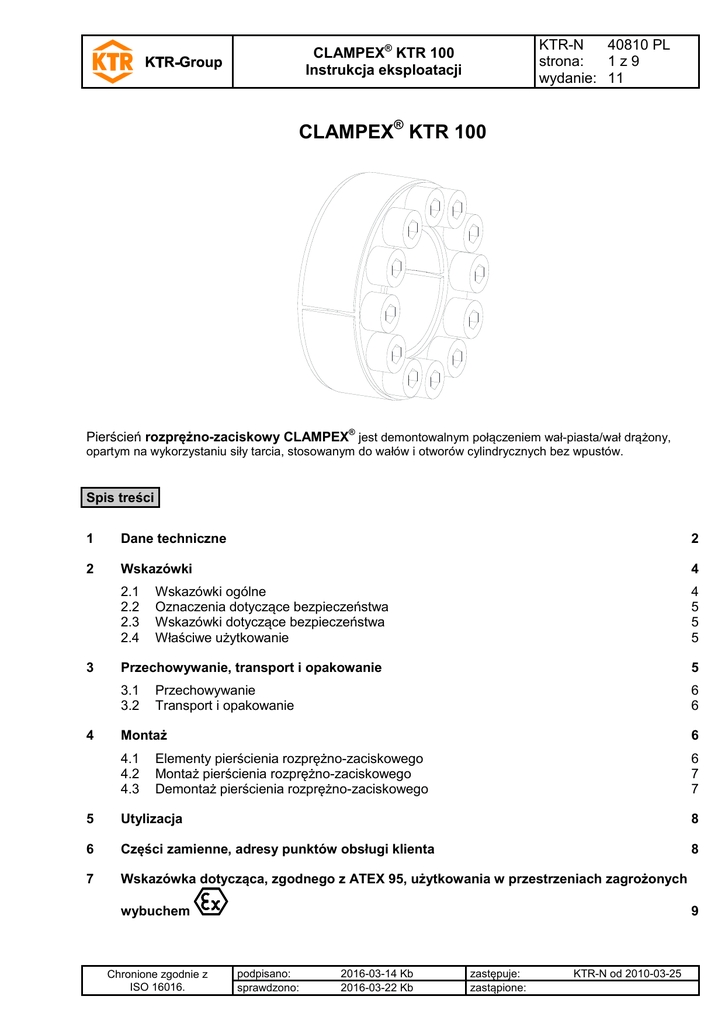 KTR-N 40810 PL strona: 1z9 wydanie: 11 CLAMPEX® KTR 100 Instrukcja eksploatacji CLAMPEX® KTR 100 Pierścień rozprężno-zaciskowy CLAMPEX® jest demontowalnym połączeniem wał-piasta/wał drążony, opartym na wykorzystaniu siły tarcia, stosowanym do wałów i otworów cylindrycznych bez wpustów. Spis treści 1 Dane techniczne 2 2 Wskazówki 4 2.1 2.2 2.3 2.4 4 5 5 5 3 4 Wskazówki ogólne Oznaczenia dotyczące bezpieczeństwa Wskazówki dotyczące bezpieczeństwa Właściwe użytkowanie Przechowywanie, transport i opakowanie 5 3.1 3.2 6 6 Przechowywanie Transport i opakowanie Montaż 4.1 4.2 4.3 6 Elementy pierścienia rozprężno-zaciskowego Montaż pierścienia rozprężno-zaciskowego Demontaż pierścienia rozprężno-zaciskowego 6 7 7 5 Utylizacja 8 6 Części zamienne, adresy punktów obsługi klienta 8 7 Wskazówka dotycząca, zgodnego z ATEX 95, użytkowania w przestrzeniach zagrożonych wybuchem Chronione zgodnie z ISO 16016. 9 podpisano: sprawdzono: 2016-03-14 Kb 2016-03-22 Kb zastępuje: zastąpione: KTR-N od 2010-03-25 KTR-N 40810 PL strona: 2z9 wydanie: 11 CLAMPEX® KTR 100 Instrukcja eksploatacji 1 Dane techniczne rysunek 1: CLAMPEX® KTR 100 Tabela 1: dane techniczne śruby zaciskające DIN EN ISO 4762 – 12.9 całkowite = 0,14 wymiary [mm] dxD B B1 B2 Mxl 17 x 47 18 x 47 19 x 47 20 x 47 22 x 47 24 x 50 25 x 50 28 x 55 30 x 55 32 x 60 35 x 60 38 x 65 40 x 65 42 x 75 45 x 75 48 x 80 50 x 80 55 x 85 60 x 90 65 x 95 70 x 110 75 x 115 80 x 120 85 x 125 90 x 130 95 x 135 100 x 145 110 x 155 120 x 165 130 x 180 140 x 190 150 x 200 160 x 210 170 x 225 180 x 235 190 x 250 26 26 26 26 26 26 26 26 26 26 26 26 26 32 32 32 32 32 32 32 38 38 38 38 38 38 44 44 44 50 50 50 50 58 58 66 20 20 20 20 20 20 20 20 20 20 20 20 20 24 24 24 24 24 24 24 28 28 28 28 28 28 32 32 32 38 38 38 38 44 44 52 17 17 17 17 17 17 17 17 17 17 17 17 17 20 20 20 20 20 20 20 24 24 24 24 24 24 26 26 26 34 34 34 34 38 38 46 M6x18 M6x18 M6x18 M6x18 M6x18 M6x18 M6x18 M6x18 M6x18 M6x18 M6x18 M6x18 M6x18 M8x22 M8x22 M8x22 M8x22 M8x22 M8x22 M8x22 M10x25 M10x25 M10x25 M10x25 M10x25 M10x25 M12x30 M12x30 M12x30 M12x30 M12x30 M12x30 M12x30 M14x45 M14x45 M14x45 1) 2) z liczba 8 8 8 8 8 8 8 12 12 12 12 15 15 12 12 12 12 15 15 15 15 15 15 15 15 18 15 15 16 20 22 24 26 22 24 28 2) TA [Nm] 16 16 16 16 16 16 16 16 16 16 16 16 16 40 40 40 40 40 40 40 78 78 78 78 78 78 135 135 135 135 135 135 135 215 215 215 nacisk powierzprzenoszony chniowy moment obrotowy pomiędzy pierścilub siła osiowa 2 eniem a [N/mm ] T Fax wał piasta [Nm] [kN] PW PN 260 30 281 102 280 31 270 103 290 30 251 101 310 31 242 103 340 30 219 103 370 30 200 96 390 31 195 97 650 46 259 132 700 46 243 132 750 46 229 122 820 46 209 122 1100 57 238 139 1170 58 228 140 1670 79 251 141 1790 79 234 141 1900 79 219 131 1990 79 211 132 2740 99 240 155 2990 99 220 147 3240 99 203 139 5550 158 250 159 5950 158 234 152 6350 158 219 146 6740 158 206 140 7140 158 195 135 9000 189 220 155 11600 232 237 163 12750 231 215 153 14800 246 210 153 20150 310 186 134 23850 340 190 140 27850 371 193 145 32200 402 196 150 40300 474 195 147 46600 517 201 154 57300 603 183 139 masa ~ kg 0,2 0,2 0,2 0,2 0,2 0,3 0,3 0,3 0,3 0,3 0,3 0,4 0,3 0,6 0,5 0,6 0,6 0,6 0,7 0,8 1,3 1,2 1,4 1,4 1,5 1,6 2,2 2,3 2,4 3,5 3,8 4,0 4,4 5,7 6,0 8,0 wymiar DN: należy obliczyć, wskazówki w katalogu sprzęgieł KTR Są to maksymalne wartości momentów dokręcania śrub. Można je zmniejszyć o 40% wyżej podanych wartości, przy czym nastąpi odpowiednio proporcjonalne zmniejszenie wartości T, Fax, PW oraz PN. Chronione zgodnie z ISO 16016. podpisano: sprawdzono: 2016-03-14 Kb 2016-03-22 Kb zastępuje: zastąpione: KTR-N od 2010-03-25 KTR-N 40810 PL strona: 3z9 wydanie: 11 CLAMPEX® KTR 100 Instrukcja eksploatacji 1 Dane techniczne rysunek 1: CLAMPEX® KTR 100 Tabela 1: dane techniczne śruby zaciskające DIN EN ISO 4762 – 12.9 całkowite = 0,14 wymiary [mm] dxD B B1 B2 Mxl 200 x 260 220 x 285 240 x 305 260 x 325 280 x 355 300 x 375 320 x 405 340 x 425 360 x 455 380 x 475 400 x 495 420 x 515 440 x 545 460 x 565 480 x 585 500 x 605 520 x 630 540 x 650 560 x 670 580 x 690 600 x 710 620 x 730 640 x 750 660 x 770 680 x 790 700 x 810 720 x 830 740 x 850 760 x 870 780 x 890 800 x 910 820 x 930 840 x 950 860 x 970 880 x 990 900 x 1010 66 72 72 72 84 84 98 98 112 112 112 112 130 130 130 130 130 130 130 130 130 130 130 130 130 130 130 130 130 130 130 130 130 130 130 130 52 56 56 56 66 66 78 78 90 90 90 90 102 102 102 102 102 102 102 102 102 102 102 102 102 102 102 102 102 102 102 102 102 102 102 102 46 50 50 50 60 60 72 72 84 84 84 84 96 96 96 96 96 96 96 96 96 96 96 96 96 96 96 96 96 96 96 96 96 96 96 96 M14x45 M16x50 M16x50 M16x50 M18x60 M18x60 M20x70 M20x70 M22x80 M22x80 M22x80 M22x80 M24x90 M24x90 M24x90 M24x90 M24x90 M24x90 M24x90 M24x90 M24x90 M24x90 M24x90 M24x90 M24x90 M24x90 M24x90 M24x90 M24x90 M24x90 M24x90 M24x90 M24x90 M24x90 M24x90 M24x90 1) 2) z liczba 30 26 30 34 32 36 36 36 36 36 36 40 40 40 42 44 45 45 48 50 50 52 54 56 56 60 60 62 64 65 66 68 70 72 74 75 2) TA [Nm] 215 335 335 335 465 465 660 660 900 900 900 900 1130 1130 1130 1130 1130 1130 1130 1130 1130 1130 1130 1130 1130 1130 1130 1130 1130 1130 1130 1130 1130 1130 1130 1130 nacisk powierzprzenoszony chniowy moment obrotowy pomiędzy pierścilub siła osiowa 2 eniem a [N/mm ] T Fax wał piasta [Nm] [kN] PW PN 71000 710 205 157 93200 847 204 158 117300 977 216 170 144000 1107 226 181 177700 1269 200 158 214100 1427 210 168 295800 1848 213 168 314300 1848 200 160 413300 2296 201 159 436300 2296 191 153 459300 2296 181 147 535800 2551 192 156 647600 2943 185 149 677000 2943 177 144 741800 3090 178 146 809500 3238 179 148 861000 3311 176 145 894000 3311 169 141 989000 3532 174 146 1067000 3679 175 147 1103800 3679 169 143 1186200 3826 171 145 1271600 3973 172 146 1359900 4120 173 148 1401100 4120 167 144 1545400 4415 174 151 1589500 4415 169 147 1688100 4562 170 148 1789700 4709 171 150 1865500 4783 169 149 1942700 4856 168 147 2051600 