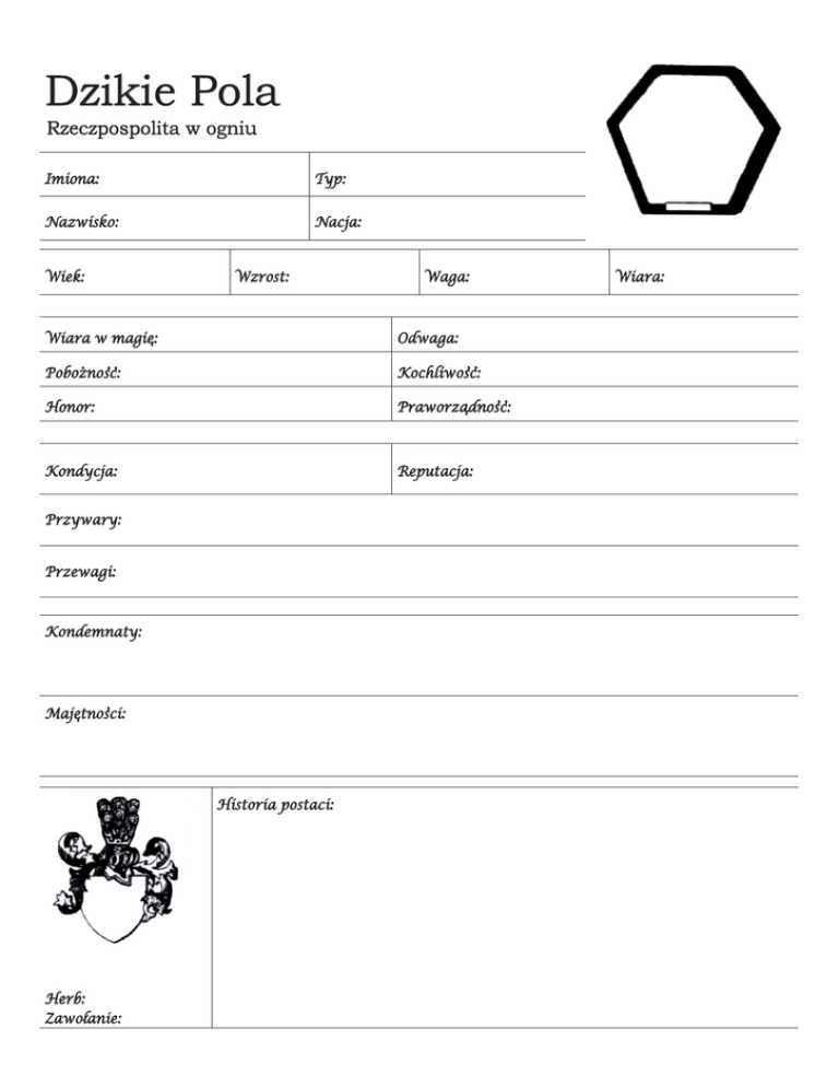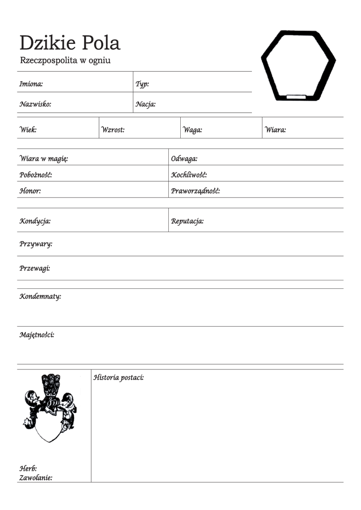 Dzikie Pola Rzeczpospolita w ogniu Imiona: Typ: Nazwisko: Nacja: Wiek: Wzrost: Wiara w magie: ‘ . ,, Poboznosc: Waga: Odwaga: ,, Kochliwosc: Honor: ,, Praworzadnosc: ‘ Kondycja: Reputacja: Przywary: Przewagi: Kondemnaty: , Majetnosci: ‘ Historia postaci: Herb: / Zawolanie: Wiara: ,, Krzepa: Zwinnosc: Fortuna: Szabla: Rapier: Inicjatywa: Rusznica: Lewak: ,, Madrosc: ‘ Artylerzysta: Cyrulik: Famy: Flisactwo: Genealogia i heraldyka: Geografia: Geometria: Gospodarstwo: Gotowanie: Handel: Historia: Jezyk obcy: ‘ ,, Madrosc: ‘ Cios: , / Wlocznia: Berdysz: Lowiectwo: Musztra: Polityka: Prawo: / Pulapki: Retoryka: Uprawa roli: Rusznikarstwo: Sokolnictwo: Targowanie: , Warzenie trunkow: Zielarstwo: / Rany: Lekka [ ] [ ] [ ] [ ] [ ] , Stroj: / Zmysly: Nadziak: Halabarda: ,, Zwinnosc: Arkan: Jazda konna: Koserstwo: Kowalstwo: Ordynek: / Platnerstwo: / Plywanie: Szycie i haft: Skradanie: Taniec: . . Ujezdzanie koni: / Zlodziejstwo: . . . / Sluzba: Zapiski: / Leb: ,, Tegosc: ‘ . Kindzal:/ Maczuga: / Luk: Zwada: / Zmysly: Muzyka: Tortury: Tropienie: Fantazja: Aktorstwo: Facecje: / Gardlowanie: / Oglada dworska: Przekupstwo: . Unizony ton: Uwodzenie: , , > Powazna [ ] [ ] > Ciezka [ ] [ ] > Okrutna [ ] [ ] > Smierc ‘ Moderunek: Sakiewka: , Kon: Fantazja: , Bron: