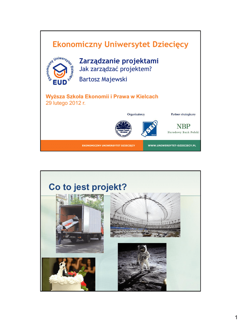 Ekonomiczny Uniwersytet Dziecięcy Zarządzanie projektami Jak zarządzać projektem? Bartosz Majewski Wyższa Szkoła Ekonomii i Prawa w Kielcach 29 lutego 2012 r. EKONOMICZNY UNIWERSYTET DZIECIĘCY WWW.UNIWERSYTET-DZIECIECY.PL Co to jest projekt? 1 Projekt      zorganizowany ciąg działań ludzkich realizowany zespołowo prowadzący do celu z określonym początkiem i końcem z wykorzystaniem znacznych lecz limitowanych zasobów o niepowtarzalnym charakterze Zarządzanie projektem 2 Zarządzanie projektem 1. pomysł Co chcę osiągnąć i jak przekonać do pomysłu innych? Zarządzanie projektem 1. 2. pomysł przygotowanie, planowanie 3 Zarządzanie projektem 2. przygotowanie, planowanie Kto to będzie realizował? Jaki będzie zakres? Jakie terminy? Jakie zasoby? Zarządzanie projektem 1. 2. 3. 4. 5. pomysł przygotowanie, planowanie wykonanie i monitorowanie zamknięcie projektu ocena i wnioski 4 Zarządzanie projektem jakość Warsztaty Planowanie przebiegu projektu      1. 2. 3. 4. Gr 1 i 2 Bal na koniec roku klas 6. Gr 3 i 4 Koncert młodych talentów Gr 5 i 6 Sprzedaż koszulek z logo EUD. Gr 7 i 8 Loteria fantowa na cele charytatywne Gr 9 i 10 Mistrzostwa szkoły w biegach na 3000 m Zakres projektu – co chcecie osiągnąć? Zasoby - co będzie potrzebne? ile to będzie kosztowało? Harmonogram – jakie są najważniejsze zadania i czas ich realizacji? Ryzyko – co może spowodować, że Wam się nie uda? jak to zagrożenie zmniejszyć? 5 Dziękuję za uwagę! 6