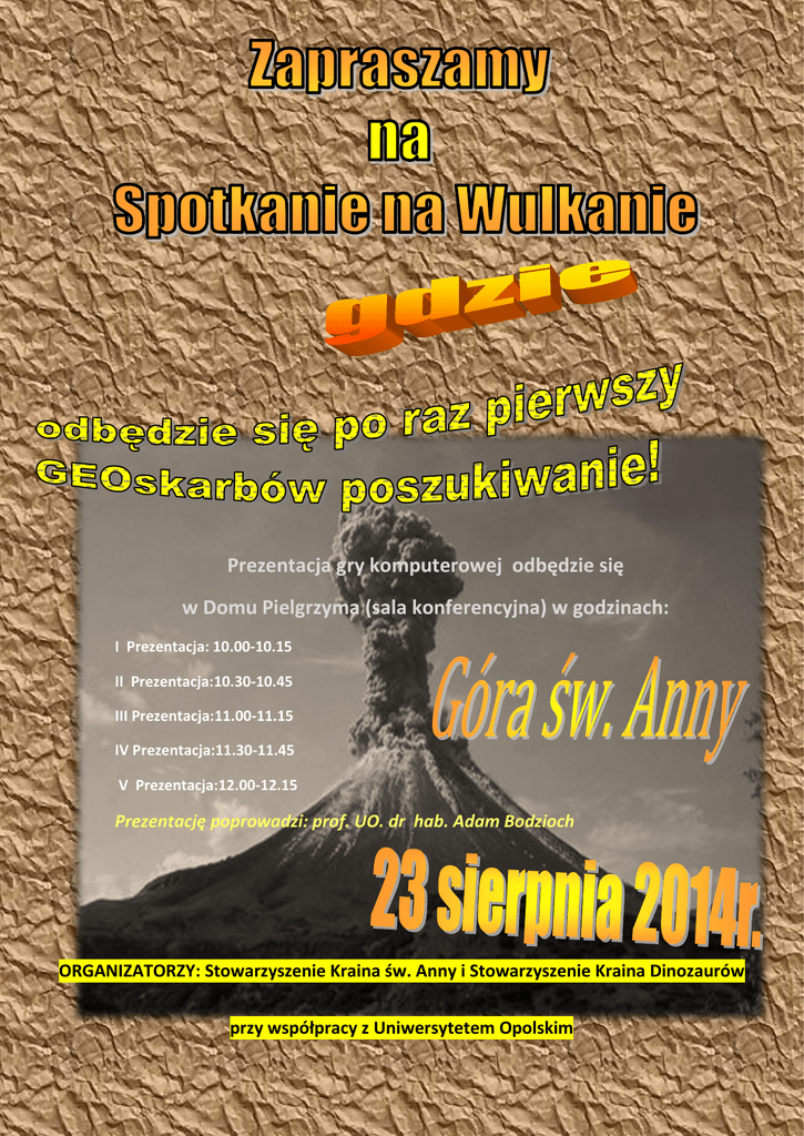 cdcZX Prezentacja gry komputerowej odbędzie się w Domu Pielgrzyma (sala konferencyjna) w godzinach: I Prezentacja: 10.00-10.15 II Prezentacja:10.30-10.45 III Prezentacja:11.00-11.15 IV Prezentacja:11.30-11.45 V Prezentacja:12.00-12.15 Prezentację poprowadzi: prof. UO. dr hab. Adam Bodzioch ORGANIZATORZY: Stowarzyszenie Kraina św. Anny i Stowarzyszenie Kraina Dinozaurów przy współpracy z Uniwersytetem Opolskim
