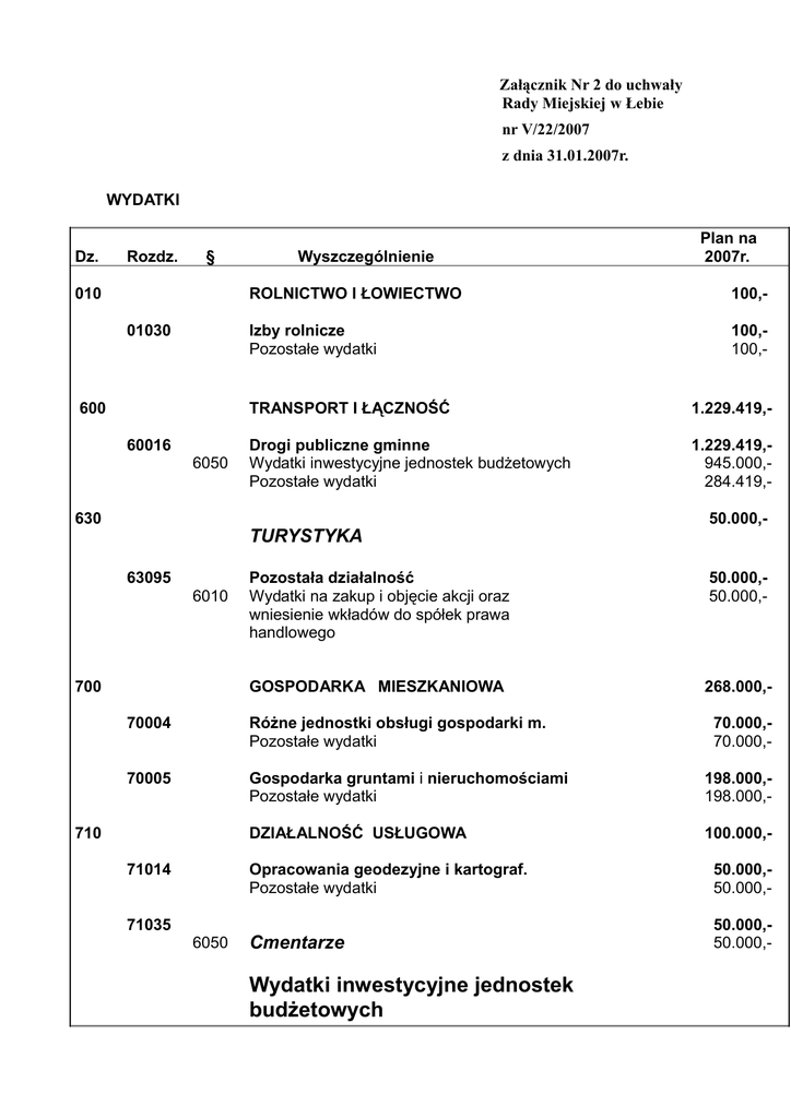 Załącznik Nr 2 do uchwały Rady Miejskiej w Łebie nr V/22/2007 z dnia 31.01.2007r. WYDATKI Dz. Rozdz. § 010 01030 600 60016 6050 630 Wyszczególnienie ROLNICTWO I ŁOWIECTWO 100,- Izby rolnicze Pozostałe wydatki 100,100,- TRANSPORT I ŁĄCZNOŚĆ 1.229.419,- Drogi publiczne gminne Wydatki inwestycyjne jednostek budżetowych Pozostałe wydatki 1.229.419,945.000,284.419,- TURYSTYKA 63095 6010 700 Plan na 2007r. 50.000,- Pozostała działalność Wydatki na zakup i objęcie akcji oraz wniesienie wkładów do spółek prawa handlowego 50.000,50.000,- GOSPODARKA MIESZKANIOWA 268.000,- 70004 Różne jednostki obsługi gospodarki m. Pozostałe wydatki 70005 Gospodarka gruntami i nieruchomościami Pozostałe wydatki 198.000,198.000,- DZIAŁALNOŚĆ USŁUGOWA 100.000,- 710 71014 71035 6050 70.000,70.000,- Opracowania geodezyjne i kartograf. Pozostałe wydatki 50.000,50.000,- Cmentarze 50.000,50.000,- Wydatki inwestycyjne jednostek budżetowych 1. 2. 3. 4. 750 5. 3.157.000,- ADMINISTRACJA PAŃSTWOWA 75011 4010 4110 4120 6060 75022 Urzędy wojewódzkie Wynagrodzenia osobowe pracowników Składki na ubezpieczenia społeczne Składki na fundusz pracy Wydatki na zakupy inwestycyjne jedn.budżet. Rady gmin Pozostałe wydatki 75023 65.500,50.550,8.730,1.220,5.000,145.000,145.000,- 2.946.500,- Urzędy gmin 4010 4040 4110 4120 6050 6060 751 75101 Wynagrodzenia osobowe pracowników Dodatkowe wynagrodzenie roczne Składki na ubezpieczenie społeczne Składki na fundusz pracy Wydatki inwestycyjne jednostek budżetowych Wydatki na zakupy inwestycyjne jedn.budżet. Pozostałe wydatki 1.446.000,110.000,295.000,35.500,350.000,30.000,680.000,- URZĘDY NACZELNYCH ORGANÓW WŁADZY PAŃSTWOWEJ, KONTROLI I OCHRONY PRAWA ORAZ SĄDOWNICTWA 610,- Urzędy naczelnych organów władzy 610,- państwowej, kontroli i ochrony prawa Pozostałe wydatki 754 BEZPIECZEŃSTWO PUBLICZNE I OCHRONA PRZECIWPOŻAROWA 75412 Ochotnicze straże pożarne Pozostałe wydatki 75414 Obrona cywilna Pozostałe wydatki 610,249.550,77.000,77.000,15.000,15.000,- 75416 4010 Straż Miejska 4040 4110 Wynagrodzenia 4120 osobowe pracowników 112.550,83.900,7.100,14.500,2.050,5.000,- Dodatkowe wynagrodzenie roczne Składki na ubezpieczenie społeczne Składki na fundusz pracy Pozostałe wydatki 75495 Pozostała działalność Pozostałe wydatki 1. 757 2. 3. 75702 8070 8110 75704 8020 758 75831 2930 75818 4810 801 80101 4010 4040 4110 4120 6050 80103 4. OBSŁUGA DŁUGU PUBLICZNEGO Obsługa papier.wart., kred. i pożycz. j.s.t. Odsetki i dyskonto od krajowych skarbowych papierów wartośc. oraz pożyczek i kredytów Odsetki od samorządowych papierów wartośc. Rozliczenia z tytułu poręcz.udziel.przez Skarb Państwa lub j.s.t. Wypłaty z tytułu gwarancji i poręczeń RÓŻNE ROZLICZENIA Część równoważąca subwencji ogólnej dla gmin Wpłaty jst do budżetu państwa Rezerwy ogólne i celowe Rezerwy OŚWIATA I WYCHOWANIE Szkoły podstawowe Wynagrodzenia osobowe pracowników Dodatkowe wynagrodzenie roczne Składki na ubezpieczenia społeczne Składki na fundusz pracy Wydatki inwestycyjne jednostek budżetowych Pozostałe wydatki Oddziały przedszkolne w szkołach podstawowych 45.000,45.000,- 5. 428.700,343.700,142.600,201.100,85.000,85.000,372.894,272.894,272.894,100.000,100.000,4.633.290,2.535.290,1.503.000,115.200,284.190,40.440,25.000,567.460,198.490,- 4010 4040 4110 4120 Wynagrodzenia osobowe pracowników Dodatkowe wynagrodzenie roczne Składki na ubezpieczenia społeczne Składki na fundusz pracy Pozostałe wydatki 2540 Przedszkola 80104 Dotacja podmiotowa z budżetu dla niepublicznej jednostki systemu oświaty 80110 133.340,11.000,26.690,3.800,23.660,396.720,396.720,1.460.050,- Gimnazja 4010 4040 4110 4120 80113 Wynagrodzenia osobowe pracowników Dodatkowe wynagrodzenie roczne Składki na ubezpieczenia społeczne Składki na fundusz pracy Pozostałe wydatki Dowożenie dzieci do szkół 80146 Pozostałe wydatki 80195 Dokształcanie i doskonalenia nauczycieli 888.040,64.680,178.440,25.390,303.500,6.500,6.500,18.080,18.080,18.160,- Pozostałe wydatki 851 85153 1. 2. 85154 85195 3. Pozostała działalność Pozostałe wydatki 18.160,- OCHRONA ZDROWIA Zwalczanie narkomanii Pozostałe wydatki 560.000,10.000,10.000,- 4. Przeciwdziałanie alkoholizmowi Pozostała działalność Pozostała działalność 852 Pozostałe wydatki 85202 POMOC SPOŁECZNA Domy pomocy społecznej 85212 Pozostałe wydatki Świadczenia rodzinne oraz składki na ubezpieczenia emerytalne i rentowe z ubezpieczenia społecznego 4010 Wynagrodzenia osobowe pracowników 4110 Składki na ubezpieczenia społeczne 5. 290.000,290.000,260.000,260.000,2.103.500,- 57.000,57.000,1.072.600,- 17.420,3.150,- 4120 Składki na fundusz pracy Pozostałe wydatki 85213 Składki na ubezpieczenie zdrowotne opłacane za osoby pobierające niektóre świadczenia z pomocy społecznej Pozostałe wydatki 85214 85215 85219 4010 4040 4110 4120 85228 4010 4040 4110 4120 85295 2. 3. 854 4010 4040 4110 4120 85415 Ośrodki pomocy społecznej Wynagrodzenie osobowe pracowników Dodatkowe wynagrodzenie roczne Składki na ubezpieczenia społeczne Składki na fundusz pracy Pozostałe wydatki 342.160,239.630,17.770,45.450,6.170,33.140,- Usługi opiekuńcze i specjalistyczne usługi opiekuńcze Wynagrodzenie osobowe pracowników Dodatkowe wynagrodzenie roczne Składki na ubezpieczenia społeczne Składki na fundusz pracy Pozostałe wydatki 56.000,- 4. EDUKACYJNA OPIEKA WYCHOWAWCZA Świetlice szkolne 85401 10.740,348.000,- Pozostałe wydatki POZOSTAŁE ZADANIA W ZAKRESIE POLITYKI SPOŁECZNEJ Pozostała działalność Pozostałe wydatki 85395 10.740,- Zasiłki i pomoc w naturze oraz składki na ubezpieczenia społeczne Pozostałe wydatki Dodatki mieszkaniowe Pozostałe wydatki Pozostała działalność 853 1. 430,1.051.600,- Wynagrodzenie osobowe pracowników Dodatkowe wynagrodzenie roczne Składki na ubezpieczenia społeczne 348.000,120.000,120.000,- 39.820,2.500,7.650,1.030,5.000,97.000,97.000,150.000,150.000,150.000,- 