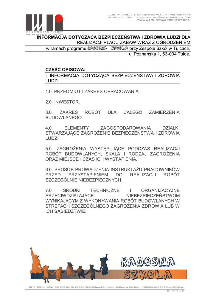 INFORMACJA DOTYCZACA BEZPIECZEŃSTWA I ZDROWIA LUDZI DLA REALIZACJI PLACU ZABAW WRAZ Z OGRODZENIEM w ramach programu Radosna Szkola przy Zespole Szkół w Tulcach, ul.Poznańska 1, 63-004 Tulce. CZĘŚĆ OPISOWA: I. INFORMACJA DOTYCZĄCA BEZPIECZEŃSTWA I ZDROWIA LUDZI . 1.0. PRZEDMIOT I ZAKRES OPRACOWANIA. 2.0. INWESTOR. 3.0. ZAKRES ROBÓT BUDOWLANEGO. DLA CAŁEGO ZAMIERZENIA 4.0. ELEMENTY ZAGOSPODAROWANIA DZIAŁKI STWARZAJĄCE ZAGROŻENIE BEZPIECZEŃSTWA I ZDROWIA LUDZI. 5.0. ZAGROŻENIA WYSTĘPUJĄCE PODCZAS REALIZACJI ROBÓT BUDOWLANYCH, SKALA I RODZAJ ZAGROŻENIA ORAZ MIEJSCE I CZAS ICH WYSTĄPIENIA. 6.0. SPOSÓB PROWADZENIA INSTRUKTAŻU PRACOWNIKÓW PRZED PRZYSTĄPIENIEM DO REALIZACJI ROBÓT SZCZEGÓLNIE NIEBEZPIECZNYCH. 7.0. ŚRODKI TECHNICZNE I ORGANIZACYJNE PRZECIWDZIAŁAJĄCE NIEBEZPIECZEŃSTWOM WYNIKAJĄCYM Z WYKONYWANIA ROBÓT BUDOWLANYCH W STREFACH SZCZEGÓLNEGO ZAGROŻENIA ZDROWIA LUB W ICH SĄSIEDZTWIE. opis techniczny do projektu zagospodarowania placu zabaw w ramach programu radosna szkoła Strona 26 INFORMACJA DOTYCZACA BEZPIECZEŃSTWA I ZDROWIA LUDZI DLA REALIZACJI PLACU ZABAW WRAZ Z OGRODZENIEM w ramach programu Radosna Szkola przy Zespole Szkół w Tulcach, ul.Poznańska 1, 63-004 Tulce. 1.0. PRZEDMIOT I ZAKRES OPRACOWANIA. Niniejsze opracowanie obejmuje zestawienie informacji o wszelkich zagrożeniach dla zdrowia i życia ludzi mogących wystapic w trakcie realizacji inwestycji oraz ustalenie zasad ich minimalizowania. 2.0. INWESTOR Urząd Gminy w Kleszczewie, ul.Poznańska 4, 63-005 Kleszczewo 3.0. ZAKRES ROBÓT DLA CAŁEGO ZAMIERZENIA BUDOWLANEGO ORAZ KOLEJNOŚĆ REALIZACJI POSZCZEGÓLNYCH OBIEKTÓW: 3.1. Zagospodarowanie placu budowy. 3.1.1. Transport i lokalizacja kontenerów zaplecza administracyjnosocjalnego budowy. 3.1.2. Uzbrojenie terenu budowy. Podłączenie energii elektrycznej, wody i kanalizacji na czas budowy. 3.1.3. Tymczasowe wydzielenie placu budowy. 3.2. Roboty ziemne 3.2.1. Niwelacja terenu a. Usunięcie warstwy humusu ze złożeniem go na działce oraz częściowym wywozem. b. Korytowanie terenu z wywozem gruntu. c. Zasypki. 3.3 Prace pozostałe 3.3.1. Prace terenowe związane z wykonaniem podbudowy dla nawierzchni syntetycznych. 3.3.2. Zamontowanie urządzeń placu zabaw. opis techniczny do projektu zagospodarowania placu zabaw w ramach programu radosna szkoła Strona 27 3.3.3. Wykonanie ciągów komunikacyjnych. 3.3.4. Ułożenie nawierzchni syntetycznej. 3.3.5. Montaż docelowego ogrodzenia. 3.3.6. Zagospodarowanie terenów zielonych oraz montaż elementów małej architektury. 4.0. ELEMENTY ZAGOSPODAROWANIA DZIAŁKI ZAGROŻENIE BEZPIECZENSTWA I ZDROWIA LUDZI: Nie występują. STWARZAJACE 5.0. ZAGROŻENIA WYSTĘPUJĄCE PODCZAS REALIZACJI ROBÓT BUDOWLANYCH, SKALA I RODZAJ ZAGROŻENIA ORAZ MIEJSCE I CZAS ICH WYSTAPIENIA: 5.1. Roboty ziemne: usunięcie humusu, korytowanie terenu, wykopy fundamentowe, zasypywanie wykopów, niwelacja terenu. Zagrożenia: potrącenie (przejechanie) pracownika przez wywrotkę, koparkę lub spycharkę. 5.2. Montaż urządzeń i ogrodzenia. Zagrożenia: upadek z wysokości, uderzenie i przygniecenie montowanym elementem. 5.3. Eksploatacja urządzeń, maszyn i narzędzi. Zagrożenia: porażenie prądem, uszkodzenia ciała. 5.4. Komunikacja na placu budowy: ciągi piesze i drogi kołowe. Zagrożenia: a. potrącenie pracownika przez pojazd na placu budowy; b. zagrożeniem wynikającym z realizacji robót budowlanych związanych z inwestycją, jest ich prowadzenie w warunkach funkcjonowania istniejącej w pobliżu szkoły i wynikającej z tego faktu możliwości przebywania na terenie budowy osób postronnych. 6.0. SPOSÓB PROWADZENIA INSTRUKTAŻU PRACOWNIKÓW PRZED PRZYSTAPIENIEM DO REALIZACJI ROBÓT SZCZEGÓLNIE NIEBEZPIECZNYCH. opis techniczny do projektu zagospodarowania placu zabaw w ramach programu radosna szkoła Strona 28 Pracowników przystępujących do robót na terenie budowy należy przeszkolić na stanowisku pracy, zwracając ich uwagę na istotne zagrożenia wynikające z charakteru robót. W przypadku zatrudniania firm podwykonawczych, kierownik budowy zobowiązany jest do sprawdzenia czy ich pracownicy posiadają odpowiednie przeszkolenie. Fakt przeprowadzenia instruktażu z zakresu bhp oraz sprawdzenia pod tym kątem firm podwykonawczych odnotować należy w dzienniku budowy. 7.0. ŚRODKI TECHNICZNE I ORGANIZACYJNE PRZECIWDZIAŁAJACE NIEBEZPIECZEŃSTWOM WYNIKAJACYM Z WYKONYWANIA ROBÓT BUDOWLANYCH W STREFACH SZCZEGÓLNEGO ZAGROŻENIA ZDROWIA LUB W ICH SĄSIEDZTWIE: 7.1. Organizacja bezpieczenstwa pracy na placu budowy. 7.1.1 Kierownictwo budowy Za bezpieczeństwo pracy na placu budowy odpowiada kierownik budowy. 7.1.2. Podwykonawca Każdy podwykonawca jest odpowiedzialny za to, aby jego pracownicy przestrzegali wszelkich zasad obowiązujących na terenie placu budowy, jak również szczególnych zarządzeń, które mogą być wydawane w trakcie realizacji projektu. Jego pracownicy zostają poinformowani o wszelkich obowiązujacych zasadach i postanowieniach dotyczących bezpieczeństwa pracy. Wykonawca ma obowiazek zadbać o to, aby jego podwykonawcy stosowali sie do wszelkich obowiazujących zasad bezpieczeństwa. 7.1.3. Zachowanie zasad bezpieczenstwa Stosowanie sie do zasad bezpieczenstwa podczas prac prowadzonych na budowie posiada najwyższy priorytet. W przypadku wykroczeń względem zasad bezpieczeństwa inwestor zastrzega sobie prawo do przerywania prac podwykonawcy, a w przypadku powtórzenia się sytuacji również do wypowiedzenia umowy. 7.2 Bezpieczeństwo i porządek na placu budowy. 7.2.1. Wyposażenie placu budowy w środki bezpieczeństwa, ochrony zdrowia ludzi i sprzęt przeciwpożarowy oraz środki do udzielania pierwszej pomocy. a. Sprzęt ochrony osobistej opis techniczny do projektu zagospodarowania placu zabaw w ramach programu radosna szkoła Strona 29 • wymagane jest obuwie robocze; • okulary ochronne do prac z zagrożeniem przez odłamki; • rekawice ochronne do prac z mater