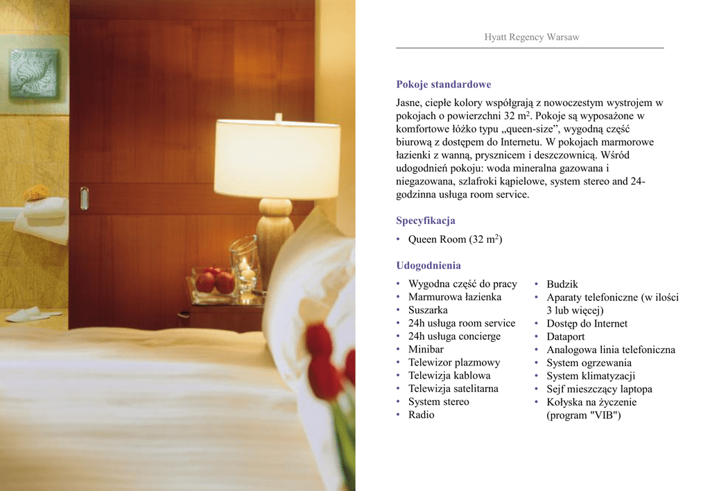 Hyatt Regency Warsaw Pokoje standardowe Jasne, ciepłe kolory współgrają z nowoczestym wystrojem w pokojach o powierzchni 32 m2. Pokoje są wyposażone w komfortowe łóżko typu „queen-size”, wygodną część biurową z dostępem do Internetu. W pokojach marmorowe łazienki z wanną, prysznicem i deszczownicą. Wśród udogodnień pokoju: woda mineralna gazowana i niegazowana, szlafroki kąpielowe, system stereo and 24godzinna usługa room service. Specyfikacja • Queen Room (32 m2) Udogodnienia • • • • • • • • • • • Wygodna część do pracy Marmurowa łazienka Suszarka 24h usługa room service 24h usługa concierge Minibar Telewizor plazmowy Telewizja kablowa Telewizja satelitarna System stereo Radio • Budzik • Aparaty telefoniczne (w ilości 3 lub więcej) • Dostęp do Internet • Dataport • Analogowa linia telefoniczna • System ogrzewania • System klimatyzacji • Sejf mieszczący laptopa • Kołyska na życzenie (program "VIB") Hyatt Regency Warsaw Hyatt Regency Warsaw Ul. Belwederska 23 00-761 Warszawa, Polska Tel: +48 22 558 1234 Fax: +48 22 558 1235 E-Mail: [email protected]