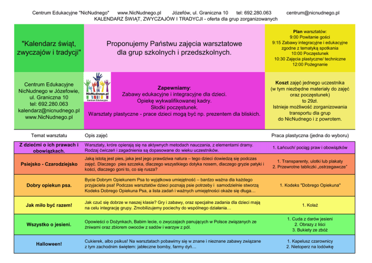 Centrum Edukacyjne "NicNudnego" www.NicNudnego.pl Józefów, ul. Graniczna 10 tel: 692.280.063 KALENDARZ ŚWIĄT, ZWYCZAJÓW I TRADYCJI - oferta dla grup zorganizowanych [email protected] "Kalendarz świąt, zwyczajów i tradycji" Proponujemy Państwu zajęcia warsztatowe dla grup szkolnych i przedszkolnych. Plan warsztatów: 9:00 Powitanie gości 9:15 Zabawy integracyjne i edukacyjne zgodne z tematyką spotkania 10:00 Poczęstunek 10:30 Zajęcia plastyczne/ techniczne 12:00 Pożegnanie Centrum Edukacyjne NicNudnego w Józefowie, ul. Graniczna 10 tel: 692.280.063 [email protected] www.NicNudnego.pl Zapewniamy: Zabawy edukacyjne i integracyjne dla dzieci. Opiekę wykwalifikowanej kadry. Słodki poczęstunek. Warsztaty plastyczne - prace dzieci mogą być np. prezentem dla bliskich. Koszt zajęć jednego uczestnika (w tym niezbędne materiały do zajęć oraz poczęstunek) to 29zł. Istnieje możliwość zorganizowania transportu dla grup do NicNudnego i z powrotem. Opis zajęć Praca plastyczna (jedna do wyboru) Z dziećmi o ich prawach i obowiązkach. Warsztaty, króre opierają się na aktywnych metodach nauczania, z elementami dramy. Rodzaj ćwiczeń i zagadnienia są dopasowane do wieku uczestników. 1. Łańcuch/ pociąg praw i obowiązków Psiejsko - Czarodziejsko Jaką istotą jest pies, jaka jest jego prawdziwa natura – tego dzieci dowiedzą się podczas zajęć. Dlaczego pies szczeka, dlaczego wszystkiego dotyka nosem, dlaczego gryzie patyki i kości, dlaczego goni to, co się rusza? 1. Transparenty, ulotki lub plakaty 2. Przewrotne tabliczki „ostrzegawcze” Temat warsztatu Dobry opiekun psa. Bycie Dobrym Opiekunem Psa to wyjątkowa umiejętność – bardzo ważna dla każdego przyjaciela psa! Podczas warsztatów dzieci poznają psie potrzeby i samodzielnie stworzą Kodeks Dobrego Opiekuna Psa, a lista zadań i ważnych umiejętności okaże się długa… 1. Kodeks "Dobrego Opiekuna" Jak miło być razem! Jak czuć się dobrze w naszej klasie? Gry i zabawy, oraz specjalne zadania dla dzieci mają na celu integrację grupy. Zmobilizujemy pociechy do wspólnego działania… 1. Kolaż Wszystko o jesieni. Opowieści o Dożynkach, Babim lecie, o zwyczajach panujących w Polsce związanych ze żniwami oraz zbiorem owoców z sadów i warzyw z pól. 1. Cuda z darów jesieni 2. Obrazy z liści 3. Bukiety ze zbóż Cukierek, albo psikus! Na warsztatach pobawimy się w znane i nieznane zabawy związane z tym zachodnim świętem: jabłeczne bomby, farmy dyń… 1. Kapelusz czarownicy 2. Nietoperz na lodówkę Halloween! Centrum Edukacyjne "NicNudnego" www.NicNudnego.pl Józefów, ul. Graniczna 10 tel: 692.280.063 KALENDARZ ŚWIĄT, ZWYCZAJÓW I TRADYCJI - oferta dla grup zorganizowanych [email protected] Andrzejki. Andrzejki to magiczny czas wróżb. Weźmiemy udział w wielu różnorodnych zabawach przepowiadających przyszłość. 1. Lampiony Boże Narodzenie. Zajęcia poświęcone tradycjom związanym z Bożym Narodzeniem od czasów naszych pradziadków, aż do dziś w różnych regionach Polski. Nie zabraknie ciekawostem o brodatym Świętym Mikołaju… 1. Aniołki z masy solnej 2. Zdobienie bombek 3. Choinki z szyszek Reniferowe zaprzęgi i białe szaleństwo! Oto cały urok zimy! Zapraszamy na zimowe spotkanie animacyjne w NicNudnego. 1. Bałwany z marcepanu Hu hu ha! Nasza zima zła! Opowieść o karnawale i ostatkachobchodzonych dawniej i dziś - w Polsce oraz na świecie 1. Wykonanie masek karnawałowych Kocham Cię babciu! Kocham Cię dziadku! Babciu, dziadku, chodźcie z nami. Damy wam łąkę z kwiatami, ze skowronkiem. Do wąchania, patrzenia... A do łąki dodamy życzenia. 1. Witraż 2. Drzewko szczęścia - metaloplatyka Dzień Zakochanych! Na tych zajęciach dzieci będą mogły dowiedzieć się skąd wziął się zwyczaj obchodzenia Walentynek w Polsce i jak jest on obchodzony w innych krajach. 1. Scrapbooking - kartki walentynkowe 2. Serce - zawieszka z masy solnej Zapusty. Powitanie wiosny. Skąd się wzięło topienie marzanny? Co to jest Jare Święto? Co ma Wiosna do Śmingusa? 1. Malowanie ceramicznego wazonu 2. Decoupage - ramka na zdjęcia WielkaNOC! Opowieść o tradycjach wielkanocnych. Czym się różni pisanka od kraszanki? Co to jest pogrzeb żuru i śledzia? Dlaczego akurat Palmowa Niedziela? 1. Ozdabianie jajek ze styropianu i wydmuszek 2. Wykonanie palmy 3. Ozdoby wielkanocne Kocham Cię mamo i tato! Podczas tych zajęć dzieci obejrzą repliki obrazów mam z różnych zakątków świata, dowiedzą się czegoś o ich codziennym życiu oraz tego, jak ważną rolę odgrywa matka. 1. Ozdabianie gipsowej donicy 2. Decoupage - szkatułka Noc Świętojańska. Opowieść o kwiecie paproci, nocy świętojańskiej i puszczaniu wianków na wodzie. 1. Plecienie wianków
