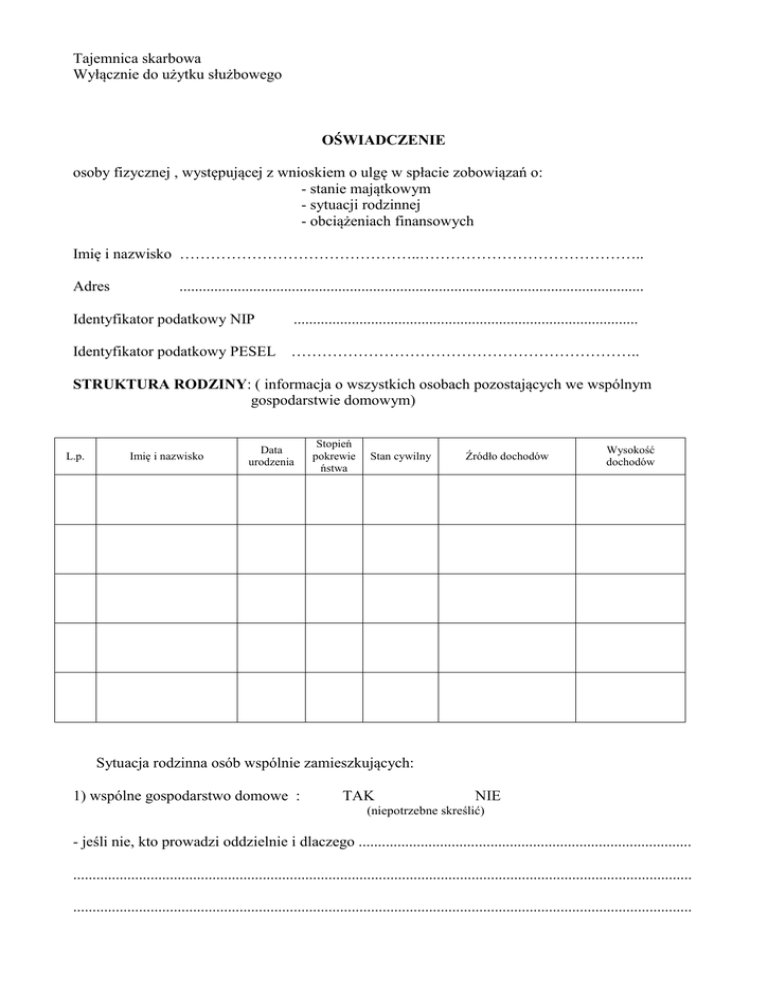 Tajemnica skarbowa Wyłącznie do użytku służbowego OŚWIADCZENIE osoby fizycznej , występującej z wnioskiem o ulgę w spłacie zobowiązań o: - stanie majątkowym - sytuacji rodzinnej - obciążeniach finansowych Imię i nazwisko ………………………………………..…………………………………….. Adres ........................................................................................................................ Identyfikator podatkowy NIP ......................................................................................... Identyfikator podatkowy PESEL ………………………………………………………….. STRUKTURA RODZINY: ( informacja o wszystkich osobach pozostających we wspólnym gospodarstwie domowym) L.p. Imię i nazwisko Data urodzenia Stopień pokrewie ństwa Stan cywilny Źródło dochodów Wysokość dochodów Sytuacja rodzinna osób wspólnie zamieszkujących: 1) wspólne gospodarstwo domowe : TAK NIE (niepotrzebne skreślić) - jeśli nie, kto prowadzi oddzielnie i dlaczego ...................................................................................... ................................................................................................................................................................ ................................................................................................................................................................ STAN MAJĄTKOWY: 1. Mieszkanie: - adres .................................................................................................................................. - tytuł prawny ...................................................................................................................... - powierzchnia w m2 ..............................., ilość izb ............................................................. 2. Majątek nieruchomy (położenie, powierzchnia, szacunkowa wartość): - nieruchomości mieszkalne ............................................................................................................ .......................................................................................................................................................... - nieruchomości niemieszkalne ........................................................................................................ ........................................................................................................................................................... - grunty ............................................................................................................................................. ........................................................................................................................................................... 3. Majątek ruchomy: - samochody (marka, typ, rocznik, szacunkowa wartość) .......................................................................................................................................................... .......................................................................................................................................................... .......................................................................................................................................................... - maszyny i urządzenia (rodzaj, rok produkcji, szacunkowa wartość) ….………………………………………………………................................................................. . .......................................................................................................................................................... - inne składniki majątku trwałego (rodzaj, szacunkowa wartość) .................................................. .......................................................................................................................................................... 4. Kapitały pieniężne, prawa majątkowe: - oszczędności (na rachunkach bankowych i w gotówce) .............................................................. - papiery wartościowe (akcje, obligacje itp.) ................................................................................. - przedmioty wartościowe (dzieła sztuki, antyki itp. - wartość szacunkowa) ................................. - prawa majątkowe (udziały w spółkach, inne) …………………………………………………. OBCIĄŻENIA FINANSOWE (średniomiesięcznie) 1. Stałe - czynsz ............................................................................................................................................... - opłaty za dostarczane media (energia, gaz, woda) ........................................................................... ............................................................................................................................................................. - telefon .............................................................................................................................................. - inne ( np. koszty leczenia ,eksploatacja samochodu, ubezpieczenia itd. - podać rodzaj i wysokość) .............................................................................................................................................................. - koszty miesięcznego utrzymania (wyżywienie) ……..…………………………………………….. 2. Okresowe - z tytułu zaciągniętych zobowiązań (pożyczki, kredyty, itp) ............................................................... ................................................................................................................................................................ 3. Pozostałe ( rodzaj zobowiązania, wysokość, termin podjęcia, terminy i wysokości ich spłaty, aktualny stan za