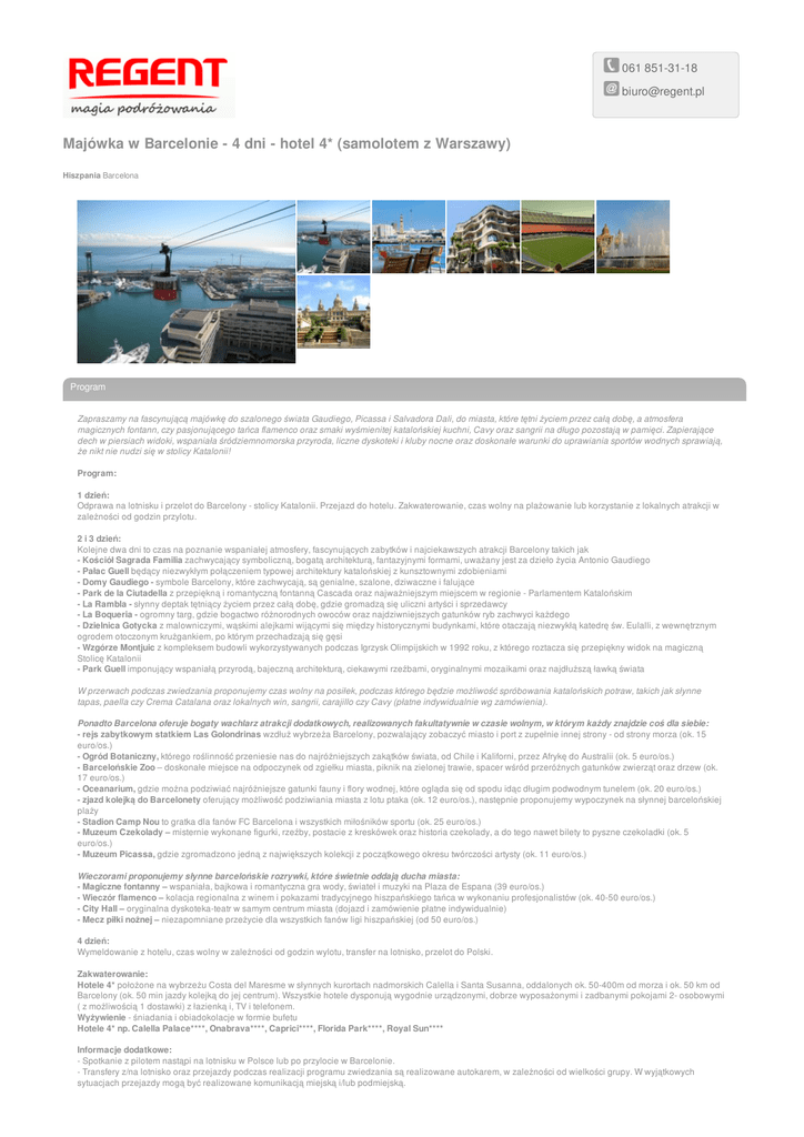 061 851-31-18 [email protected] Majówka w Barcelonie - 4 dni - hotel 4* (samolotem z Warszawy) Hiszpania Barcelona Program Zapraszamy na fascynującą majówkę do szalonego świata Gaudiego, Picassa i Salvadora Dali, do miasta, które tętni życiem przez całą dobę, a atmosfera magicznych fontann, czy pasjonującego tańca flamenco oraz smaki wyśmienitej katalońskiej kuchni, Cavy oraz sangrii na długo pozostają w pamięci. Zapierające dech w piersiach widoki, wspaniała śródziemnomorska przyroda, liczne dyskoteki i kluby nocne oraz doskonałe warunki do uprawiania sportów wodnych sprawiają, że nikt nie nudzi się w stolicy Katalonii! Program: 1 dzień: Odprawa na lotnisku i przelot do Barcelony - stolicy Katalonii. Przejazd do hotelu. Zakwaterowanie, czas wolny na plażowanie lub korzystanie z lokalnych atrakcji w zależności od godzin przylotu. 2 i 3 dzień: Kolejne dwa dni to czas na poznanie wspaniałej atmosfery, fascynujących zabytków i najciekawszych atrakcji Barcelony takich jak - Kościół Sagrada Familia zachwycający symboliczną, bogatą architekturą, fantazyjnymi formami, uważany jest za dzieło życia Antonio Gaudiego - Pałac Guell będący niezwykłym połączeniem typowej architektury katalońskiej z kunsztownymi zdobieniami - Domy Gaudiego - symbole Barcelony, które zachwycają, są genialne, szalone, dziwaczne i falujące - Park de la Ciutadella z przepiękną i romantyczną fontanną Cascada oraz najważniejszym miejscem w regionie - Parlamentem Katalońskim - La Rambla - słynny deptak tętniący życiem przez całą dobę, gdzie gromadzą się uliczni artyści i sprzedawcy - La Boqueria - ogromny targ, gdzie bogactwo różnorodnych owoców oraz najdziwniejszych gatunków ryb zachwyci każdego - Dzielnica Gotycka z malowniczymi, wąskimi alejkami wijącymi się między historycznymi budynkami, które otaczają niezwykłą katedrę św. Eulalli, z wewnętrznym ogrodem otoczonym krużgankiem, po którym przechadzają się gęsi - Wzgórze Montjuic z kompleksem budowli wykorzystywanych podczas Igrzysk Olimpijskich w 1992 roku, z którego roztacza się przepiękny widok na magiczną Stolicę Katalonii - Park Guell imponujący wspaniałą przyrodą, bajeczną architekturą, ciekawymi rzeźbami, oryginalnymi mozaikami oraz najdłuższą ławką świata W przerwach podczas zwiedzania proponujemy czas wolny na posiłek, podczas którego będzie możliwość spróbowania katalońskich potraw, takich jak słynne tapas, paella czy Crema Catalana oraz lokalnych win, sangrii, carajillo czy Cavy (płatne indywidualnie wg zamówienia). Ponadto Barcelona oferuje bogaty wachlarz atrakcji dodatkowych, realizowanych fakultatywnie w czasie wolnym, w którym każdy znajdzie coś dla siebie: - rejs zabytkowym statkiem Las Golondrinas wzdłuż wybrzeża Barcelony, pozwalający zobaczyć miasto i port z zupełnie innej strony - od strony morza (ok. 15 euro/os.) - Ogród Botaniczny, którego roślinność przeniesie nas do najróżniejszych zakątków świata, od Chile i Kaliforni, przez Afrykę do Australii (ok. 5 euro/os.) - Barcelońskie Zoo – doskonałe miejsce na odpoczynek od zgiełku miasta, piknik na zielonej trawie, spacer wśród przeróżnych gatunków zwierząt oraz drzew (ok. 17 euro/os.) - Oceanarium, gdzie można podziwiać najróżniejsze gatunki fauny i flory wodnej, które ogląda się od spodu idąc długim podwodnym tunelem (ok. 20 euro/os.) - zjazd kolejką do Barcelonety oferujący możliwość podziwiania miasta z lotu ptaka (ok. 12 euro/os.), następnie proponujemy wypoczynek na słynnej barcelońskiej plaży - Stadion Camp Nou to gratka dla fanów FC Barcelona i wszystkich miłośników sportu (ok. 25 euro/os.) - Muzeum Czekolady – misternie wykonane figurki, rzeźby, postacie z kreskówek oraz historia czekolady, a do tego nawet bilety to pyszne czekoladki (ok. 5 euro/os.) - Muzeum Picassa, gdzie zgromadzono jedną z największych kolekcji z początkowego okresu twórczości artysty (ok. 11 euro/os.) Wieczorami proponujemy słynne barcelońskie rozrywki, które świetnie oddają ducha miasta: - Magiczne fontanny – wspaniała, bajkowa i romantyczna gra wody, świateł i muzyki na Plaza de Espana (39 euro/os.) - Wieczór flamenco – kolacja regionalna z winem i pokazami tradycyjnego hiszpańskiego tańca w wykonaniu profesjonalistów (ok. 40-50 euro/os.) - City Hall – oryginalna dyskoteka-teatr w samym centrum miasta (dojazd i zamówienie płatne indywidualnie) - Mecz piłki nożnej – niezapomniane przeżycie dla wszystkich fanów ligi hiszpańskiej (od 50 euro/os.) 4 dzień: Wymeldowanie z hotelu, czas wolny w zależności od godzin wylotu, transfer na lotnisko, przelot do Polski. Zakwaterowanie: Hotele 4* położone na wybrzeżu Costa del Maresme w słynnych kurortach nadmorskich Calella i Santa Susanna, oddalonych ok. 50-400m od morza i ok. 50 km od Barcelony (ok. 50 min jazdy kolejką do jej centrum). Wszystkie hotele dysponują wygodnie urządzonymi, dobrze wyposażonymi i zadbanymi pokojami 2- osobowymi ( z możliwością 1 dostawki) z łazienką i, TV i telefonem. Wyżywienie - śniadania i obiadokolacje w formie bufetu Hotele 4* np. Calella Palace****, Onabrava****, Caprici****, Florida Park****, Royal Sun**** Informacje dodatkowe: - Spotkanie z pilotem nastąpi na lotnisku w Polsce lub po przylocie w Barcelonie. - Transfery z/na lotnisko oraz przejazdy podczas realizacji programu zwiedzania są realizowane autokarem, w zależności od wielkości grupy. W wyjątkowych sytuacjach przejazdy mogą być realizowane komunikacją miejską i/lub podmiejską. - Kolejność dni zwiedzania może ulec zmianie. - Pilot nie oprowadza wewnątrz obiektów. - W przypadku wylotu z Barcelony w godzinach porannych zamiast śniadania może być wydany pakiet śniadaniowy. - Linia lotnicza i godziny przelotów mogą ulec zmianie. - „Single” - bez dopłaty, przy dokwaterowaniu do pokoju 2 lub 3 osobowego (opcja na zapytanie). - „Zniżki dla dzi