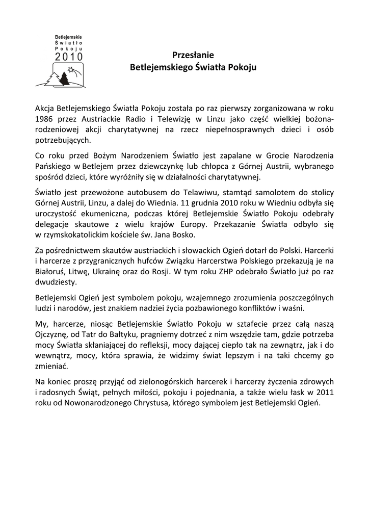 Przesłanie Betlejemskiego Światła Pokoju Akcja Betlejemskiego Światła Pokoju została po raz pierwszy zorganizowana w roku 1986 przez Austriackie Radio i Telewizję w Linzu jako część wielkiej bożonarodzeniowej akcji charytatywnej na rzecz niepełnosprawnych dzieci i osób potrzebujących. Co roku przed Bożym Narodzeniem Światło jest zapalane w Grocie Narodzenia Pańskiego w Betlejem przez dziewczynkę lub chłopca z Górnej Austrii, wybranego spośród dzieci, które wyróżniły się w działalności charytatywnej. Światło jest przewożone autobusem do Telawiwu, stamtąd samolotem do stolicy Górnej Austrii, Linzu, a dalej do Wiednia. 11 grudnia 2010 roku w Wiedniu odbyła się uroczystość ekumeniczna, podczas której Betlejemskie Światło Pokoju odebrały delegacje skautowe z wielu krajów Europy. Przekazanie Światła odbyło się w rzymskokatolickim kościele św. Jana Bosko. Za pośrednictwem skautów austriackich i słowackich Ogień dotarł do Polski. Harcerki i harcerze z przygranicznych hufców Związku Harcerstwa Polskiego przekazują je na Białoruś, Litwę, Ukrainę oraz do Rosji. W tym roku ZHP odebrało Światło już po raz dwudziesty. Betlejemski Ogień jest symbolem pokoju, wzajemnego zrozumienia poszczególnych ludzi i narodów, jest znakiem nadziei życia pozbawionego konfliktów i waśni. My, harcerze, niosąc Betlejemskie Światło Pokoju w sztafecie przez całą naszą Ojczyznę, od Tatr do Bałtyku, pragniemy dotrzeć z nim wszędzie tam, gdzie potrzeba mocy Światła skłaniającej do refleksji, mocy dającej ciepło tak na zewnątrz, jak i do wewnątrz, mocy, która sprawia, że widzimy świat lepszym i na taki chcemy go zmieniać. Na koniec proszę przyjąć od zielonogórskich harcerek i harcerzy życzenia zdrowych i radosnych Świąt, pełnych miłości, pokoju i pojednania, a także wielu łask w 2011 roku od Nowonarodzonego Chrystusa, którego symbolem jest Betlejemski Ogień.