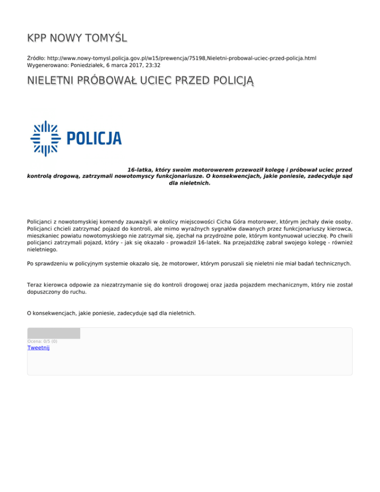 KPP NOWY TOMYŚL NIELETNI PRÓBOWAŁ UCIEC PRZED POLICJĄ