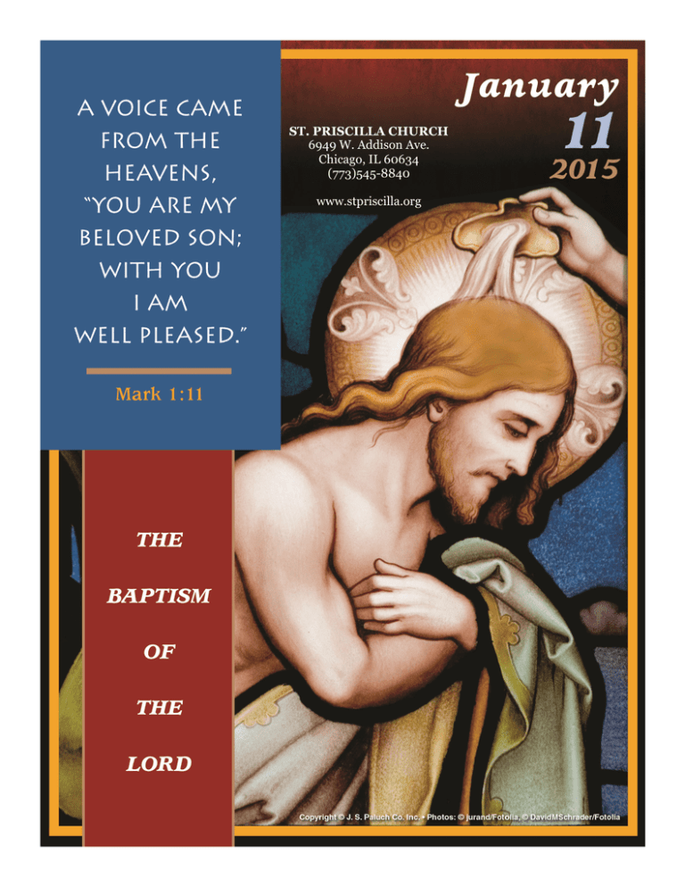 ST. PRISCILLA CHURCH 6949 W. Addison Ave. Chicago, IL 60634 (773)545-8840 www.stpriscilla.org PageTwoJanuary11,2014 Reflecting on God’s Word This is one of the key moments in the life of Jesus. Up north in his hometown of Nazareth he must have heard about John. At some point an inner voice must have said, “Go south, go to the desert. Go listen to this preacher John.” When he came to the desert, he may have stood in a long line before that moment came when he entered the water and John baptized him. Mark gives us only the briefest account of their meeting, but does present John as expecting someone mightier than he who would baptize with the Holy Spirit. It is this same Holy Spirit who came down on Jesus as he was coming out of the water. At that moment, the heavens were torn open, heaven reached down to touch the Galilean, and the Spirit descended like a dove. Have you ever seen a gull descend to snatch a fish or a hawk swoop down to seize its prey? By contrast, the image of a descending dove is one of beauty and grace, of gentle alighting. The words do not announce Jesus to others, as in Matthew’s account, but they are spoken only to him: “You are my beloved Son; with you I am well pleased” (1:11), echoing the words the Lord speaks in the first song of the Servant in the book of Isaiah. The descent of the dove did not mean an easy life for Jesus, but God had penetrated his being in a way that would then drive him into the desert to begin his mission of confronting the powers of sin and death. This gentle dove came—and continues to come— with a mighty power. —James A. Wallace, C.Ss.R. Living God’s Word At baptism, the Spirit came upon you in the presence of the Christian community, claiming you in Jesus’ name, and God said, “You are my beloved son/ daughter.” Spend some time praying over these words. What do you say to God in return? How does it affect what you do in life? Copyright © 2014, World Library Publications. All rights reserved. WARTOŚĆ CHRZTU ŚWIĘTEGO A z nieba odezwał się głos: “Tyś jest mój Syn umiłowany, w Tobie mam upodobanie”. (Mt. 1,11) Podczas dzisiejszej uroczystości wspominamy chrzest Pana Jezusa dokonany przez Jana Chrzciciela w wodach Jordanu. Chociaż Jezus nie posiadał żadnej zmazy, zechciał poddać się obrzędowi oczyszczenia, tak samo, jak poddał się innym nie obowiązującym go przepisom prawa. Stawszy się człowiekiem, poddał się prawom, które rządzą życiem ludzkim i prawom, które rządziły narodem izraelskim, wybranym przez Boga do przygotowania drogi Odkupicielowi. Jezus przyszedł nad Jordan, aby utwierdzić wszystkich tam zebranych w przekonaniu, że człowiekowi najbardziej w życiu potrzebna jest pokuta. W tym duchu przyszedł Chrystus do Jana, aby potwierdzić słuszność jego słów: “Nawróćcie się, bo bliskie jest królestwo niebieskie”. Chrystus przychodzi nad Jordan, aby stamtąd wziąć na siebie grzechy całego świata i iść już stamtąd z nimi na Golgotę. Jezus nie przyszedł nad Jordan po odpuszczenie grzechów, jak przychodzili Izraelici, ale przyszedł po to, aby te ich grzechy stamtąd wziąć na ramiona i podczas swego publicznego nauczania ukazać swemu Ojcu niebieskiemu jak bardzo człowiek jest grzeszny i jak bardzo potrzebuje pokuty. Święty Augustyn powiada, że Pan zechciał się ochrzcić, “by swoją pokorą potwierdzić to, co było dla nas konieczne.”. Na chrzcie świętym otrzymujemy wiarę i łaskę. Dzień ten jest najważniejszym dniem naszego życia. Podobnie, jak zeschła ziemia nie da plonu, jeżeli nie otrzyma wody, tak również my, którzy byliśmy uschłym pniem, nigdy nie wydalibyśmy owoców życia bez tego deszczu podarowanego “z góry”. Podczas dzisiejszej modlitwy powinniśmy podziękować Bogu za ten niezasłużony dar i radować się z tylu darów, którymi Bóg nas obdarował. Objawienie się całej Trójcy Świętej podczas chrztu Jezusa stanowi dla nas dziś doskonałą okazję, aby Jezusowi podziękować także za ukazanie nam i odkrycie przed naszymi oczyma największej tajemnicy naszej wiary świętej. Równocześnie stanowi dla nas zachętę do życia tą tajemnicą oraz wprowadzenie jej w nasze codzienne życie. Cała Trójca Święta, której życia jest jedną wielką miłością, zachęca nas do praktykowania i życia miłością na wzór Trójcy Świętej. Dzięki sakramentowi Chrztu zmieniliśmy się w świątynię Ducha Świętego. Obyś nigdy— wzywa nas święty Leon Wielki—nie wypędził przez swe złe uczynki tak zacnego Gościa, ani też nie poddał się niewoli diabła: ponieważ posiadasz wartość Krwi Chrystusa. — Ks. Idzi — PageThree The Baptism of the Lord THE BAPTISM OF THE LORD (11) 8:30 — Health and Blessings for the St. Priscilla Holy Name Society members and their families ++Salvatore and Maria De Simone (Michael) +Deceased members of St. Priscilla Holy Name Society +Dorothy Turbid (Bill) +Eryk Piecha Death Anniversary (Wife and sons) +Diane Nierzwicki (St. Priscilla Choir) 10:30— O zdrowie, Boże Bł, i wszelkie potrzebne łaski dla Stanisława Tołwińskiego (Polska Grupa) Dziękczynna za otrzymane łaski oraz o Bł. Boże dla Daniela Majcher w 11-stą rocz. Chrztu Św. (Rodzice) O radość w wieczności dla: +Patricia Tytro w 1-szą rocz. śmierci +Dominik Kalinowski (Żona i dzieci) 12:15— +Henry Koziara 15th Death Anniversary (Family) +Mieczysław Miłkowski 7th Death Anniversary (Family) 6:00 — O dary Ducha Świętego dla Emilii Tytro i jej rodziny +Patrysia Tytro w 1-szą rocz. śmierci (Rodzice) MONDAY (12) Weekday (First Week in Ordinary Time) 8:00 — St. Priscilla Parishioners #2 TUESDAY (13) Weekday (Saint Hilary, Bishop and Doctor) 8:00 — All souls in Purgatory #22 (Za zmarłych polecanych w wypominkach) WEDNESDAY (14) Weekday 8:00 — St. Priscilla Parishioners #3 8:30 — Za zmarłych polecanych w wypominkach #23 THURSDAY (15) Weekday 8:00 — +Patricia Tytro 1st Death Annivers