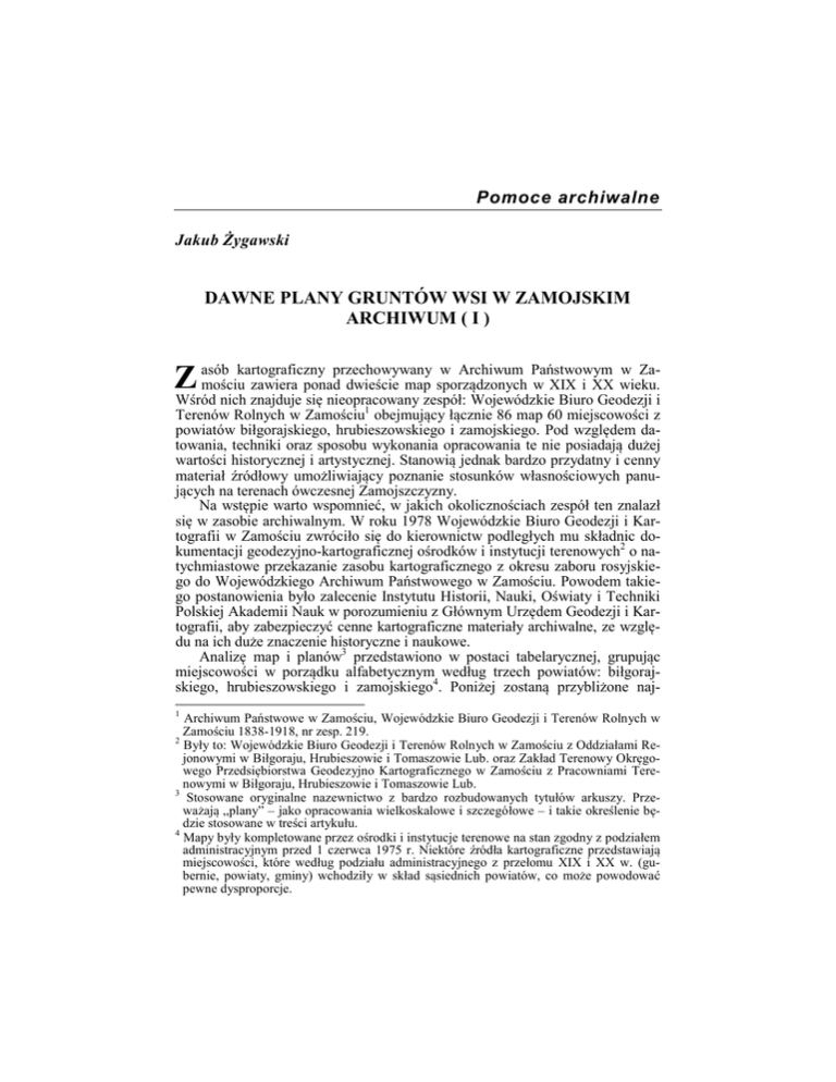 Pomoce archiwalne Jakub Żygawski DAWNE PLANY GRUNTÓW WSI W ZAMOJSKIM ARCHIWUM ( I ) kartograficzny przechowywany w Archiwum Państwowym w ZaZ asób mościu zawiera ponad dwieście map sporządzonych w XIX i XX wieku. Wśród nich znajduje się nieopracowany zespół: Wojewódzkie Biuro Geodezji i Terenów Rolnych w Zamościu1 obejmujący łącznie 86 map 60 miejscowości z powiatów biłgorajskiego, hrubieszowskiego i zamojskiego. Pod względem datowania, techniki oraz sposobu wykonania opracowania te nie posiadają dużej wartości historycznej i artystycznej. Stanowią jednak bardzo przydatny i cenny materiał źródłowy umożliwiający poznanie stosunków własnościowych panujących na terenach ówczesnej Zamojszczyzny. Na wstępie warto wspomnieć, w jakich okolicznościach zespół ten znalazł się w zasobie archiwalnym. W roku 1978 Wojewódzkie Biuro Geodezji i Kartografii w Zamościu zwróciło się do kierownictw podległych mu składnic dokumentacji geodezyjno-kartograficznej ośrodków i instytucji terenowych2 o natychmiastowe przekazanie zasobu kartograficznego z okresu zaboru rosyjskiego do Wojewódzkiego Archiwum Państwowego w Zamościu. Powodem takiego postanowienia było zalecenie Instytutu Historii, Nauki, Oświaty i Techniki Polskiej Akademii Nauk w porozumieniu z Głównym Urzędem Geodezji i Kartografii, aby zabezpieczyć cenne kartograficzne materiały archiwalne, ze względu na ich duże znaczenie historyczne i naukowe. Analizę map i planów3 przedstawiono w postaci tabelarycznej, grupując miejscowości w porządku alfabetycznym według trzech powiatów: biłgorajskiego, hrubieszowskiego i zamojskiego4. Poniżej zostaną przybliżone naj1 Archiwum Państwowe w Zamościu, Wojewódzkie Biuro Geodezji i Terenów Rolnych w Zamościu 1838-1918, nr zesp. 219. 2 Były to: Wojewódzkie Biuro Geodezji i Terenów Rolnych w Zamościu z Oddziałami Rejonowymi w Biłgoraju, Hrubieszowie i Tomaszowie Lub. oraz Zakład Terenowy Okręgowego Przedsiębiorstwa Geodezyjno Kartograficznego w Zamościu z Pracowniami Terenowymi w Biłgoraju, Hrubieszowie i Tomaszowie Lub. 3 Stosowane oryginalne nazewnictwo z bardzo rozbudowanych tytułów arkuszy. Przeważają „plany” – jako opracowania wielkoskalowe i szczegółowe – i takie określenie będzie stosowane w treści artykułu. 4 Mapy były kompletowane przez ośrodki i instytucje terenowe na stan zgodny z podziałem administracyjnym przed 1 czerwca 1975 r. Niektóre źródła kartograficzne przedstawiają miejscowości, które według podziału administracyjnego z przełomu XIX i XX w. (gubernie, powiaty, gminy) wchodziły w skład sąsiednich powiatów, co może powodować pewne dysproporcje. Jakub Żygawski stotniejsze informacje5 dotyczące opisywanych planów gruntów, w celu ich charakterystyki. LICZBA PLANÓW I ICH CHRONOLOGIA Jak wcześniej wspomniano w skład zespołu wchodzi 86 planów 60 miejscowości trzech powiatów. Najobszerniejszy zasób posiada powiat biłgorajski – 33 plany 22 miejscowości. Źródła kartograficzne powiatu hrubieszowskiego zawierają 28 planów 15 miejscowości. Powiat zamojski liczy 25 planów (w tym jedna w postaci kserokopii) przedstawiających grunty 24 miejscowości. Pod względem chronologicznym 48 planów to opracowania XIX-wieczne, 31 – XX-wieczne. W przypadku siedmiu arkuszy nie jest możliwe ustalenie roku ich sporządzenia6. Najstarszym opracowaniem kartograficznym z powiatu biłgorajskiego są plany gruntów włościańskich wsi Komodzianki i Zagródki datowane na rok 1870, najmłodszymi zaś – plan gruntów wsi Szeliga z 1910 r. oraz sporządzona w 1938 r. kopia dwuczęściowego planu wsi Przymarki (1891 r.). W powiecie hrubieszowskim najstarszy plan pochodzi z 1876 r. i przedstawia grunty wsi Teptiuków. Najmłodszy zaś – plan wsi Terebiń – powstał w 1915 r. Najstarszym oryginalnie sporządzonym opracowaniem kartograficznym w zasobie powiatu zamojskiego jest pochodzący z roku 1865 plan miejscowości Staw. Biorąc pod uwagę datę sporządzenia pierworysu, za najstarsze opracowanie powiatu zamojskiego, jak i całego zespołu, należy uznać wykonaną w latach 30-tych XX wieku kopię planu gruntów Złojca, Wólki Zarudzia i Białobrzegów pochodzącą z 1831 roku. Najmłodszy plan z 1919 r. przedstawia grunty włościańskie Sitna. CECHY PLANÓW Omawiane plany to opracowania rękopiśmienne wykonane techniką barwną (piórko i akwarele), w przeważającej części na kartonie podklejonym płótnem lub kartonie. Wyjątkiem jest dwuczęściowy plan gruntów włościańskich wsi Przymiarki (powiat biłgorajski), który sporządzono na płótnie. Mapy posiadają format prostokątny, w większości przypadków zbliżony do kwadratu. Największe arkusze osiągają wymiary, np. 43×100 cm, 97×123 cm, 100×40 cm, 110×54 cm i 127×66 cm. Z zespołu liczącego 86 planów, 63 arkusze to oryginały, natomiast 21 sporządzono jako kopie map starszych lub wykonano równocześnie z oryginałami. W przypadku dwóch opracowań trudno jest ustalić ich status ze względu na zły stan zachowania. Większość arkuszy zachowała się w stanie dobrym lub zadowalającym, pozwalającym na odczytanie treści zawartej na mapie i w legendzie. Stan kil5 Por. A. Pawłowska, Plany i mapy Zamościa z XVII-XX wieku w: Zamość miasto idealne. red. J. Kowalczyk, Lublin 1980, s. 244-254. 6 Powiat biłgorajski – Pisklaki (część I i II) i Wola Dereźniańska; powiat hrubieszowski – Modryń (grunty włościańskie), Terebiń A (część III) i Witków (II d.); powiat zamojski – Wysokie (część II, mapa niekompletna). 120 Dawne plany gruntów wsi w zamojskim Archiwum kunastu arkuszy7 jest na tyle zły8, że powinny zostać poddane natychmiastowej konserwacji. W przypadku planu gruntów Suchowoli zachował się jedynie fragment oryginalnego arkusza; cała mapa dostępna jest wyłącznie w formie kserokopii. LEGENDA, JĘZYK Kilka opracowań nie posiada legendy. Brak wyjaśnień symboli z